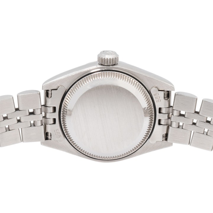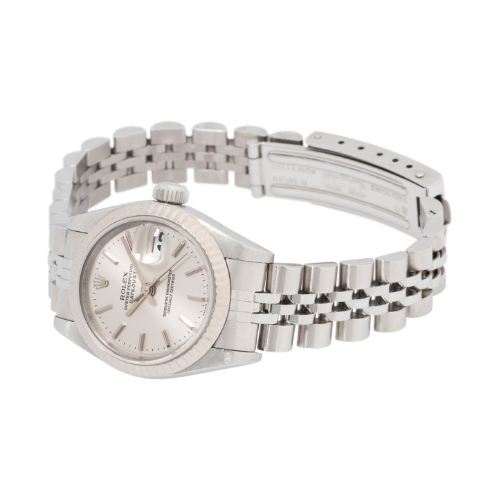 Edelstahl. Seriennummer U370406. Automatik-Werk Kal. 2135 mit sehr guten Gangwerten (+2 s/d. 302° Amplitude). Silberfarbenes Zifferblatt mit Stabindizes und Datumsanzeige. Geriffelte Lünette. Rolex Jubilee Armband (mit Stretch) mit Faltschließe. Gebraucht, sichtbare Tragespuren am Gehäuse. Lünette und Armband. Durchmesser ca. 26 mm (gemessen ohne Krone). Passend bis zu ca. 17 cm Handgelenkumfang.