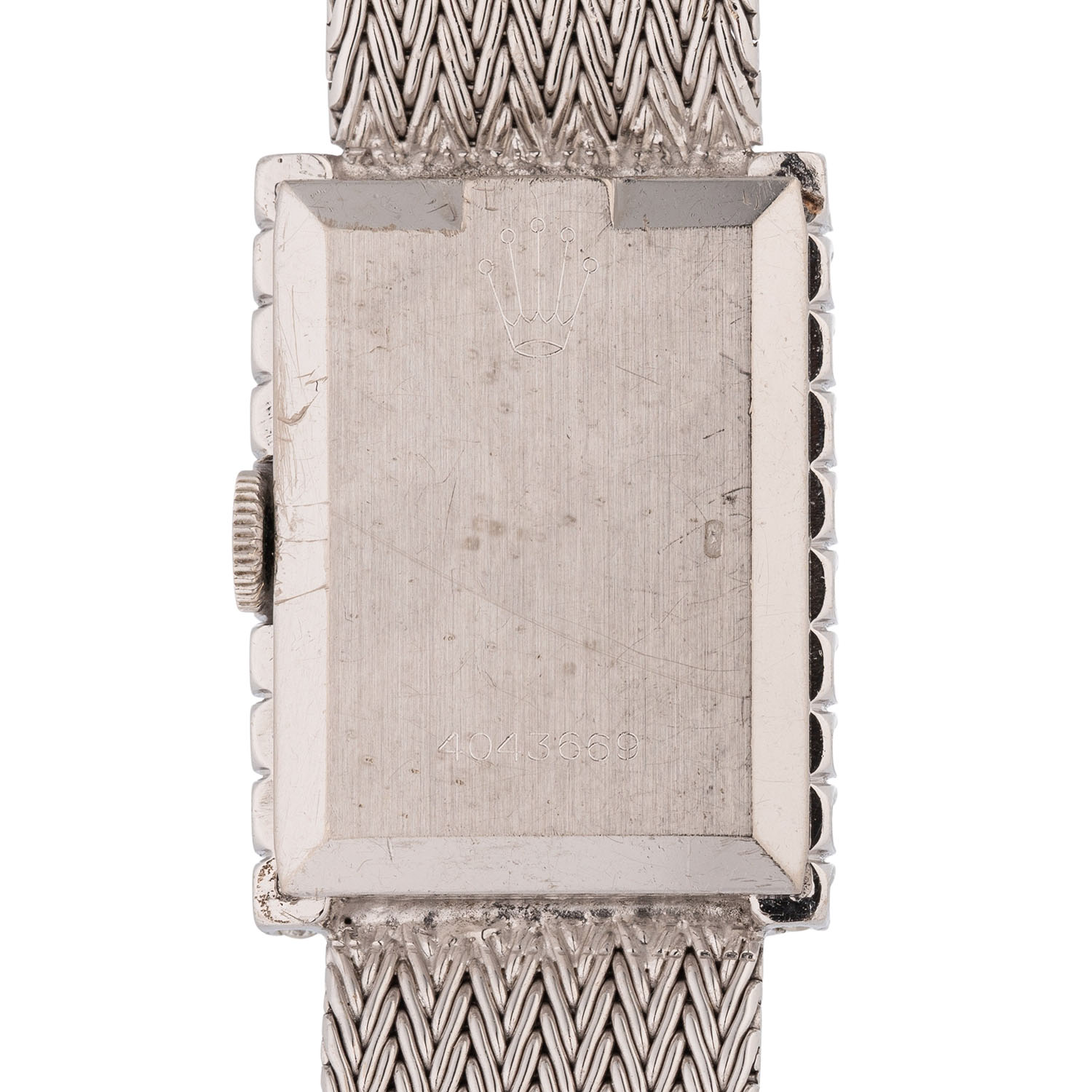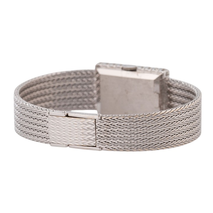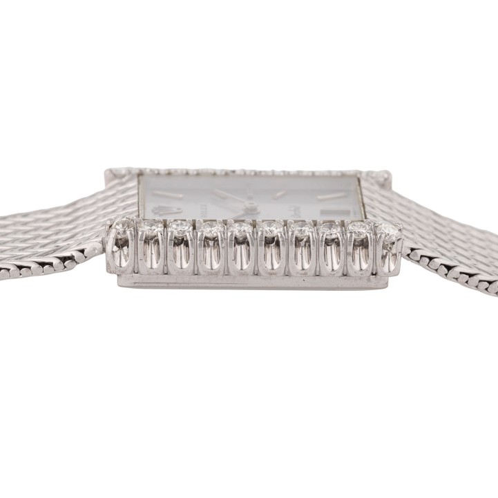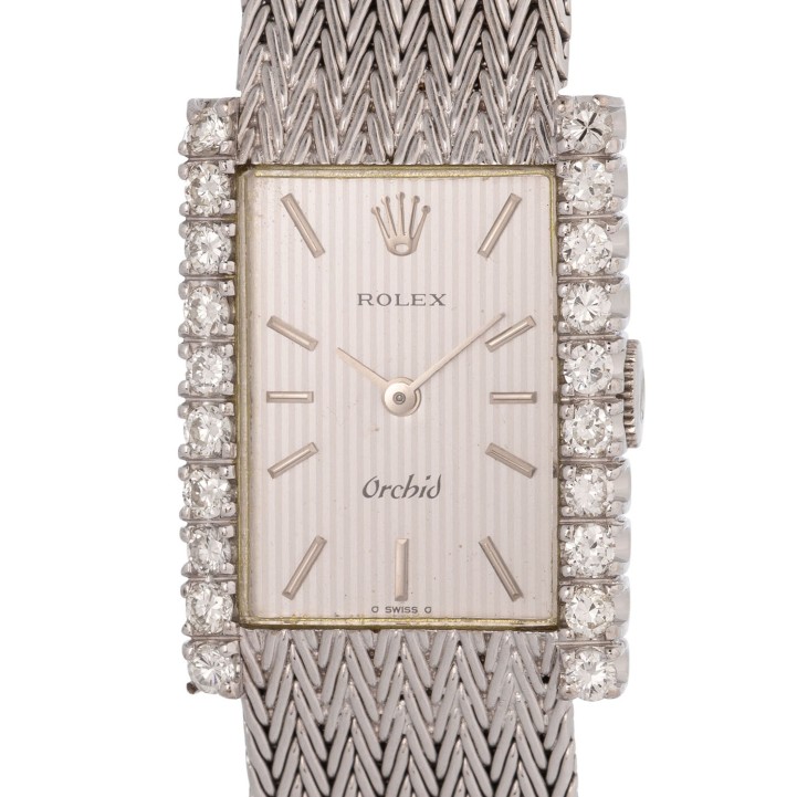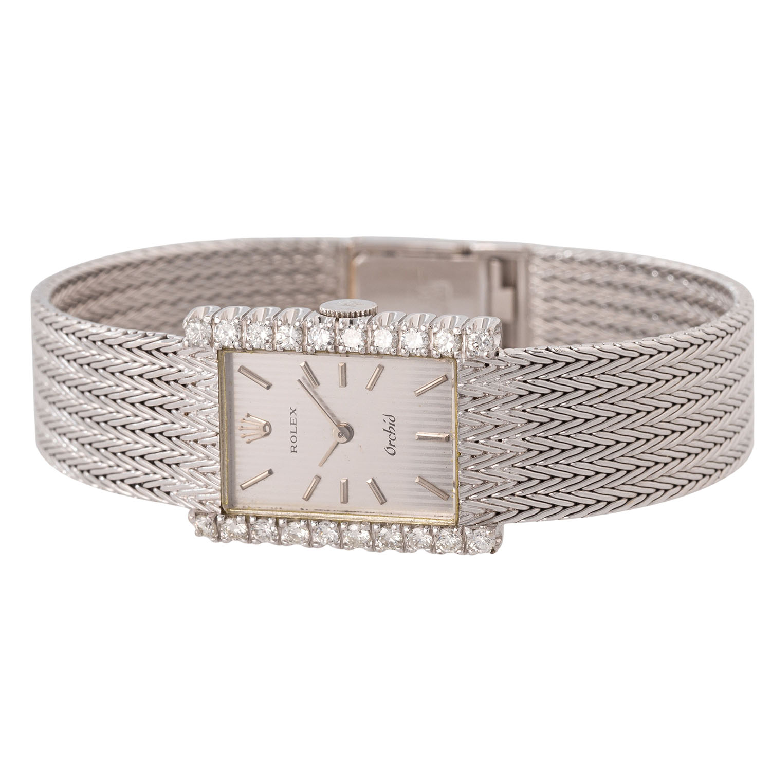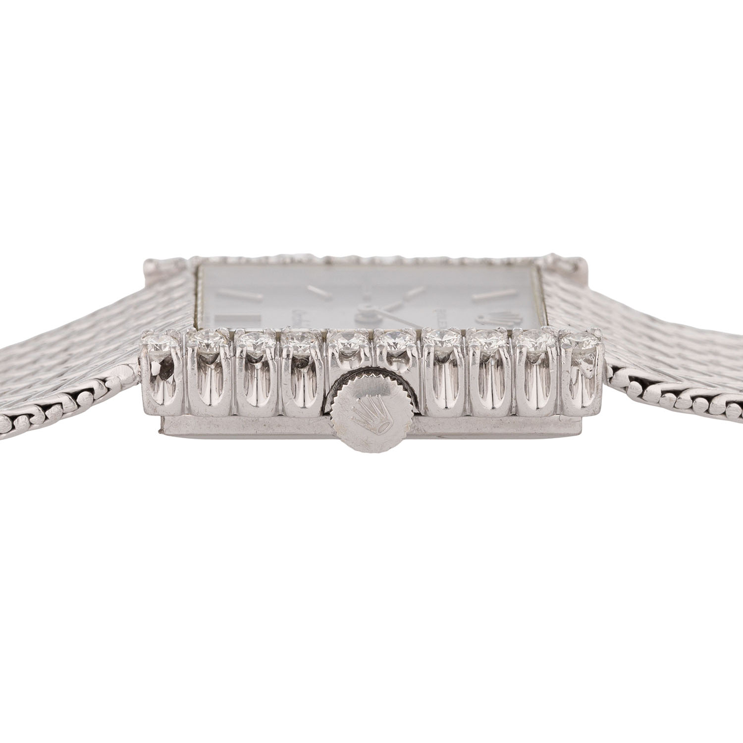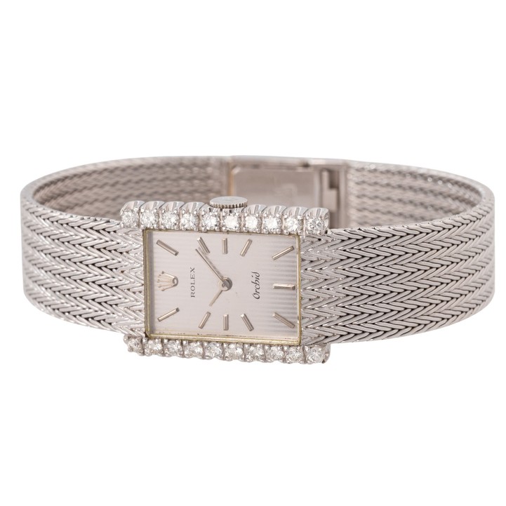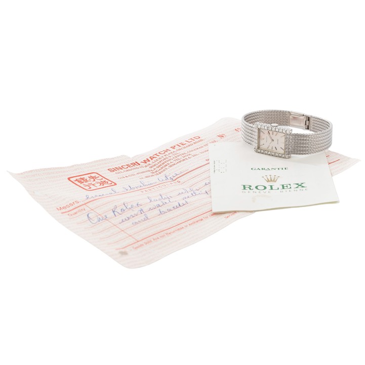 Weißgold 18K. Seriennummer 4043669. Handaufzugswerk Kal. 1400 mit sehr guten Gangwerten (+2 s/d, 267° Amplitude). Silberfarbenes, gestreiftes Sigma Zifferblatt mit Stabindizes. Aftermarket Armband in 18K Weißgold und Aftermarket Diamanten Lünette (beides nicht von Rolex). Für ihr Alter ist die Uhr in einem guten Zustand, mit Tragespuren. Garantieschein und Erstkaufrechnung anbei. Gekauft im Dezember 1978 bei Sincere watches in Singapur. Durchmesser ca. 20 mm gemessen ohne Krone. Passend bis zu einem Handgelenksumfang von ca. 17 cm.