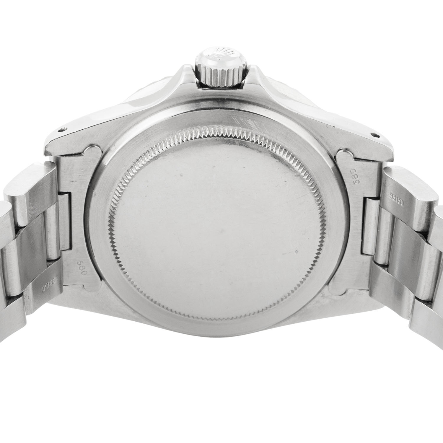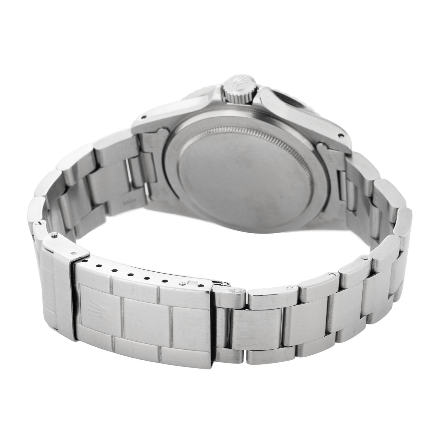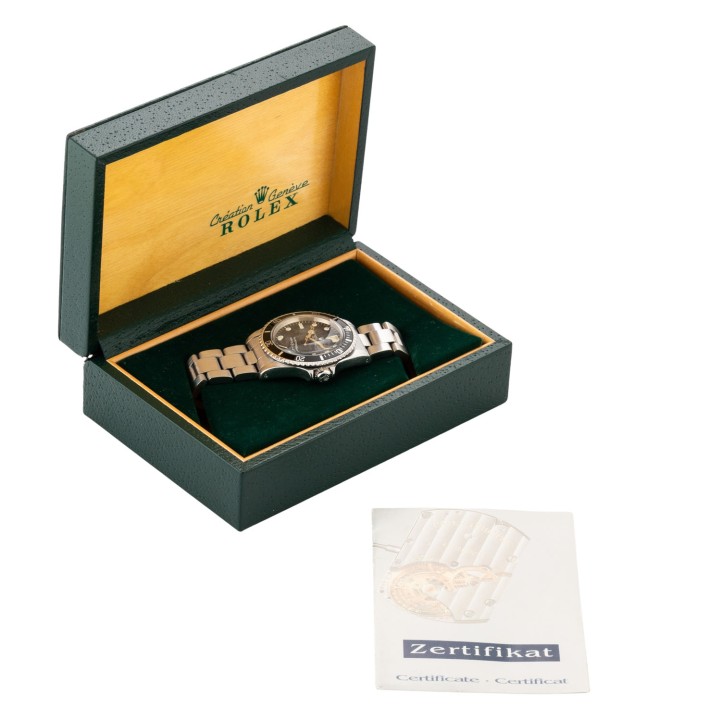 Edelstahl. Seriennummer 5838399. Automatik-Werk Kal. 1520 mit guten Gangwerten (+1 s/d. 249° Amplitude). Schwarzes Tritium Ziferblatt mit leichter Patina. Die Leuchtmasse an den Indizes sowie am Sekunden- und am Minutenzeiger ist teilweise abgegangen. Die Lünette hat einen kleinen Riss im Bereich des Dreiecks. Rolex Oyster Armband (mit Stretch) Ref 93150 mit Faltschließe. Gebraucht, mit sichtbaren Tragespuren. Das Glas hat mehrere feine Kratzer. Original Box und Zertifikat von einem Gebrauchtkauf anbei. Durchmesser ca. 40 mm (gemessen ohne Krone). Passend bis zu ca. 20,5 cm Handgelenkumfang.