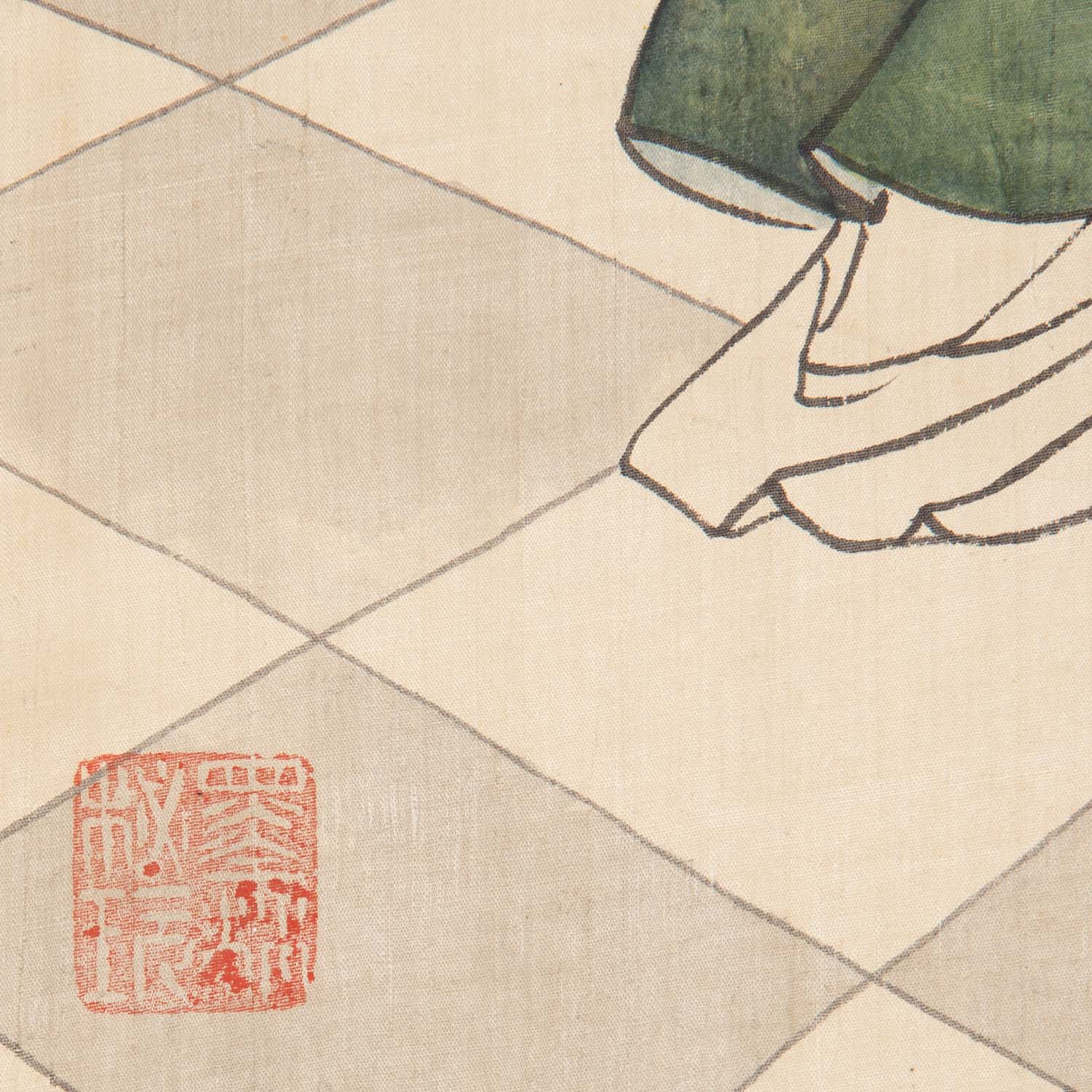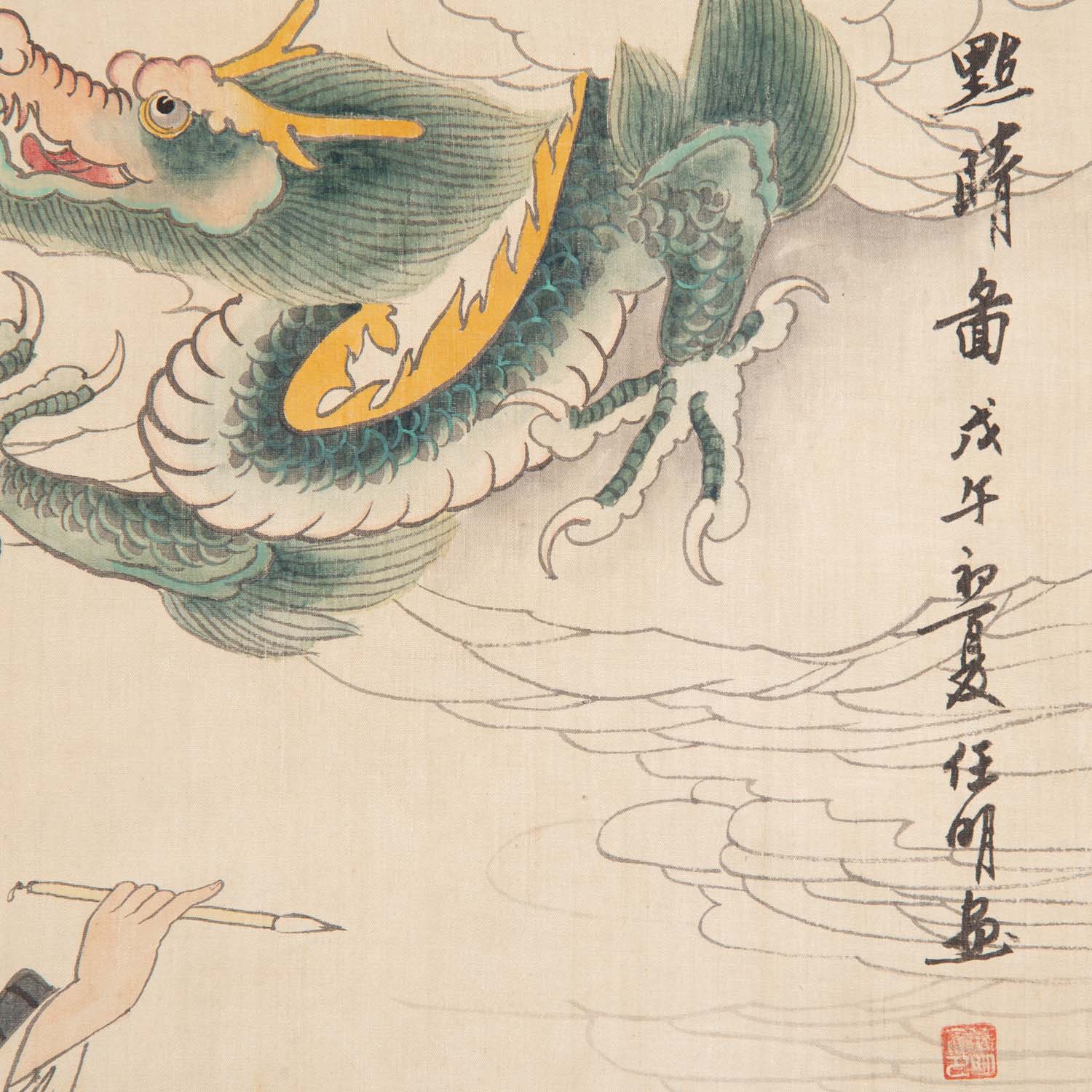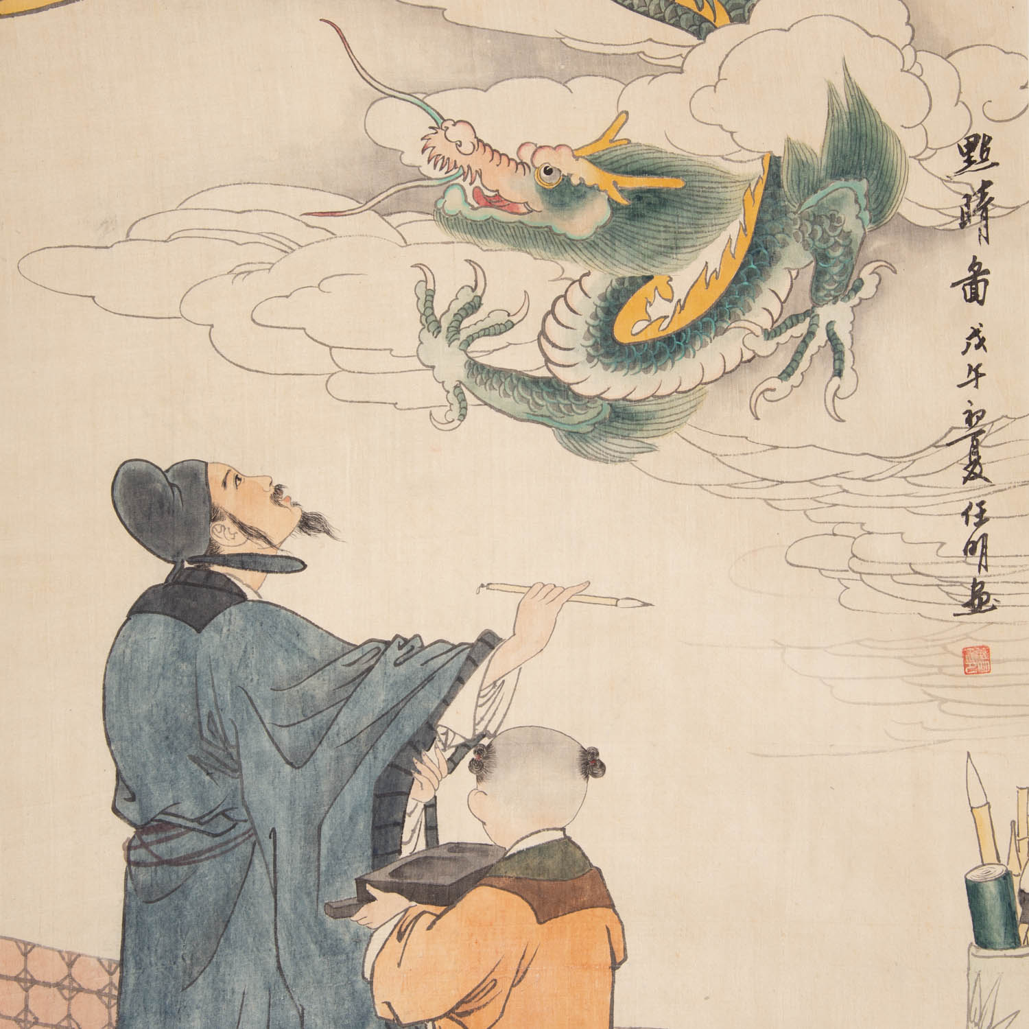 Mit Darstellung eines Malers mit seinem Schüler, der am Himmel zwischen den Wolken einen großen Drachen bestaunt, HxB: 182x62 cm. Altersspuren, besch.