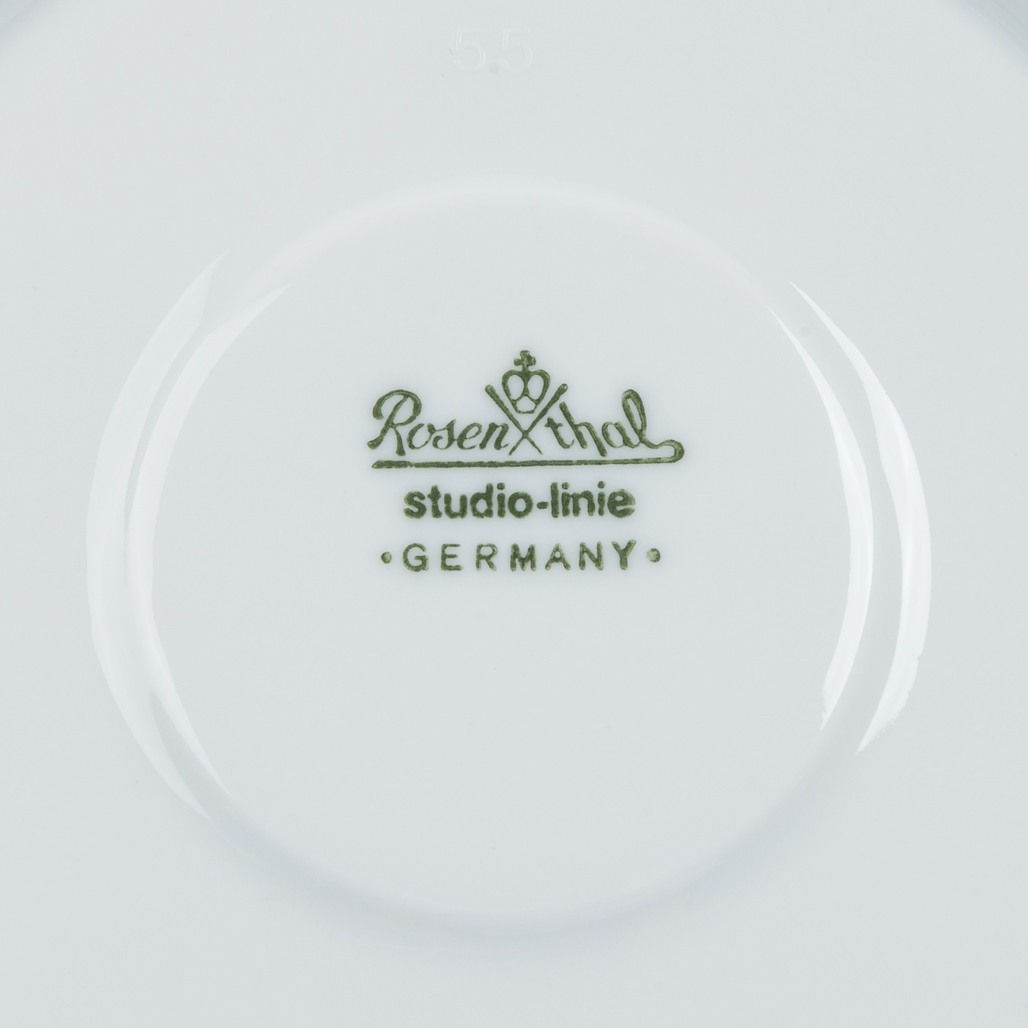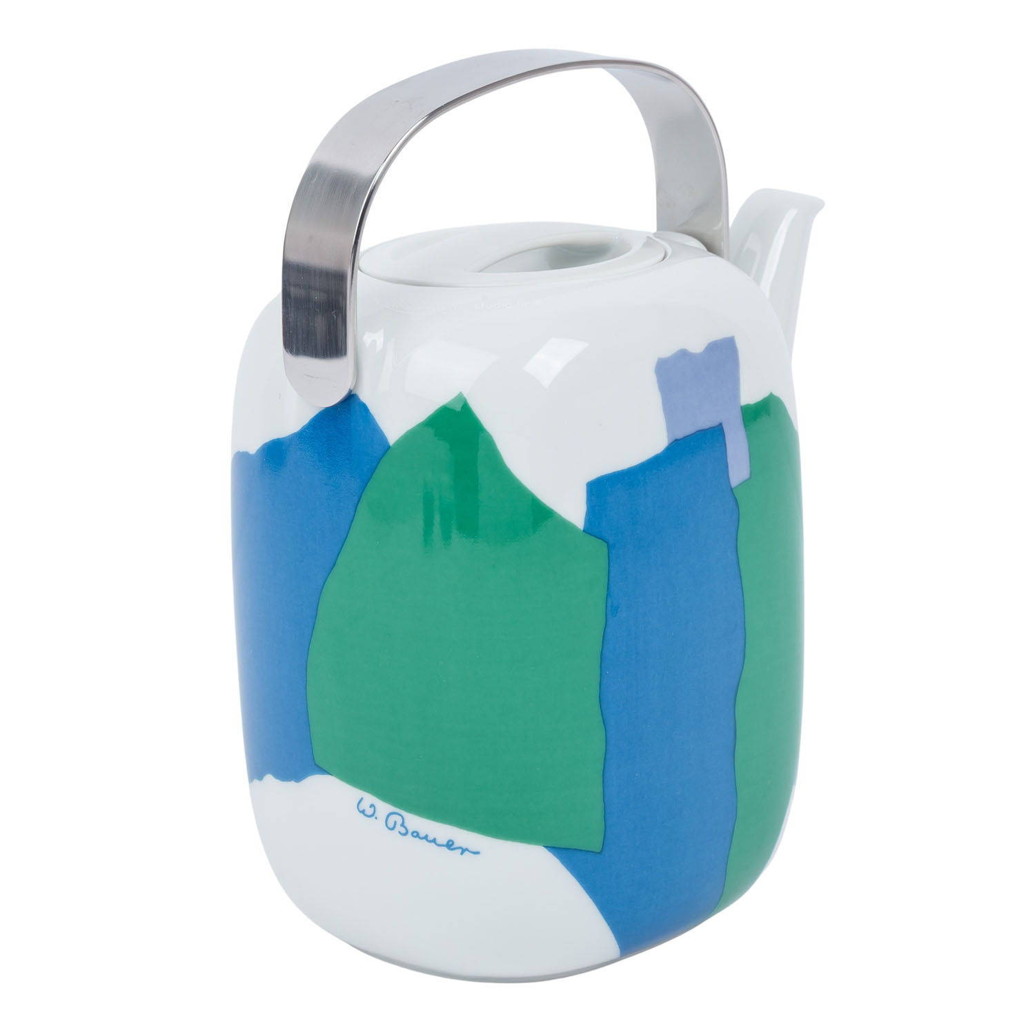 Formentwurf von Timo Sarpaneva, Dekorentwurf von Wolf Bauer (geb. 1939 in Stuttgart, Studium an der Staatlichen Akademie der Bildenden Künste), bestehend aus 6 Kaffeetassen, 6 Untertassen, 6 Kuchentellern, 1 Kaffeekanne, 1 Zuckerdose und 1 Sahnegießer. 21 Serviceteile, minimal berieben, Alters- und Gebrauchsspuren.
