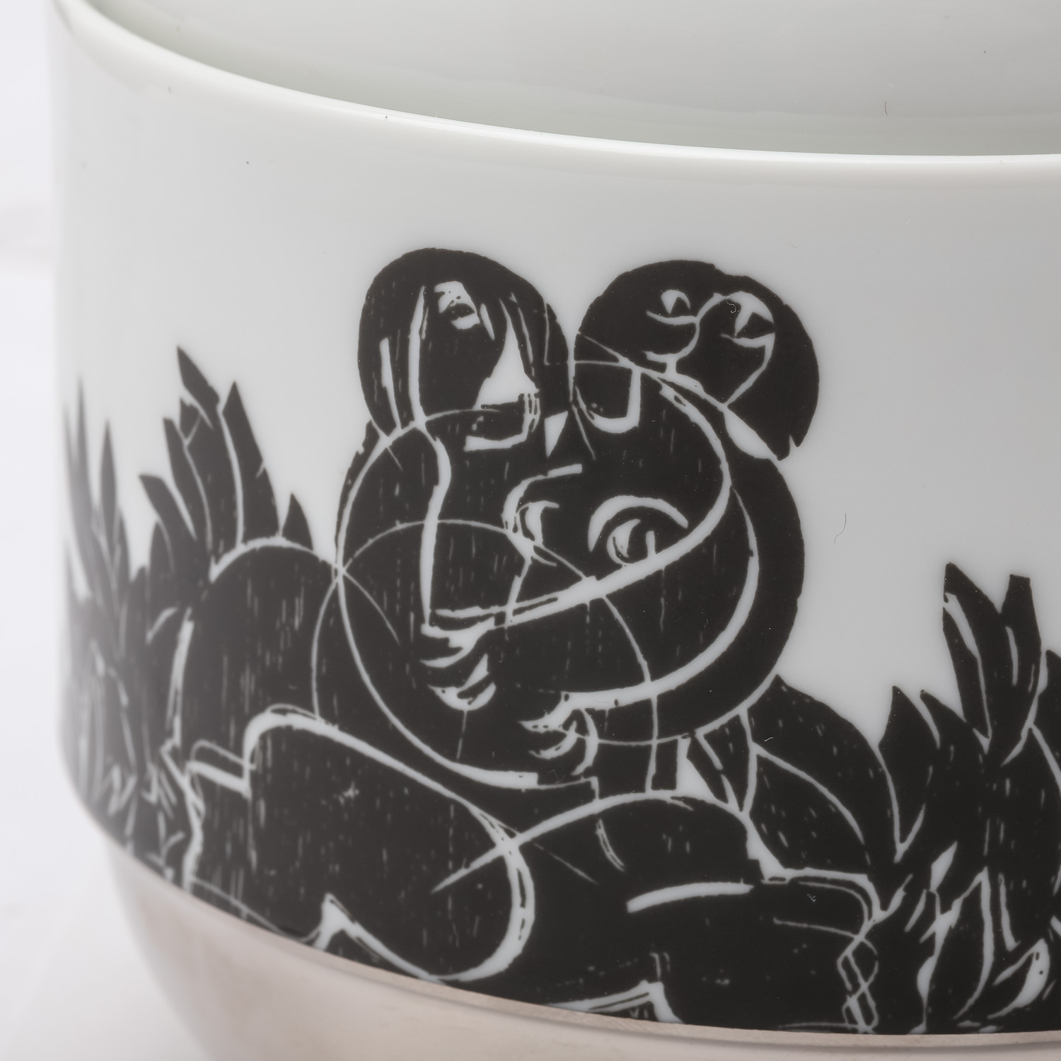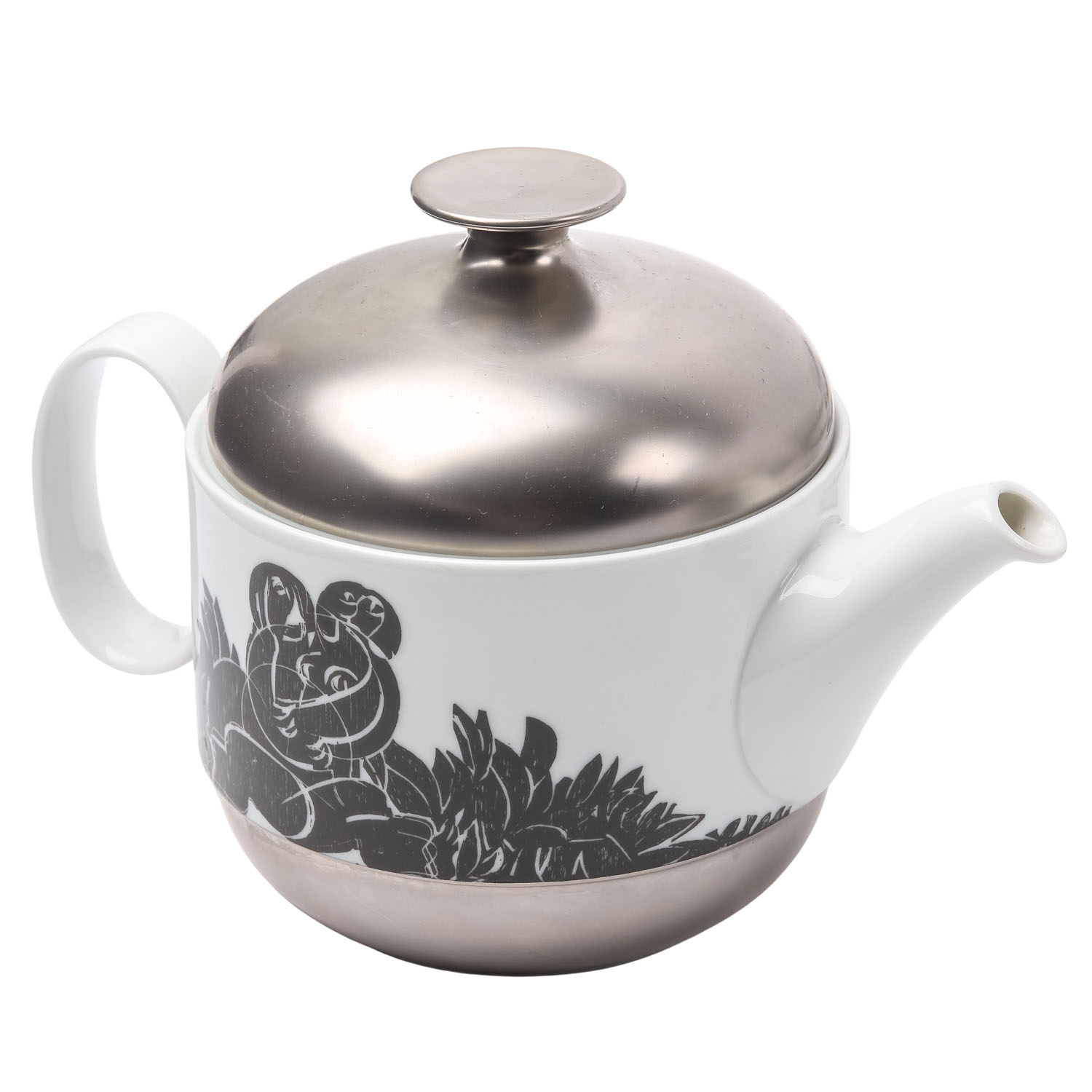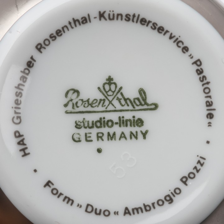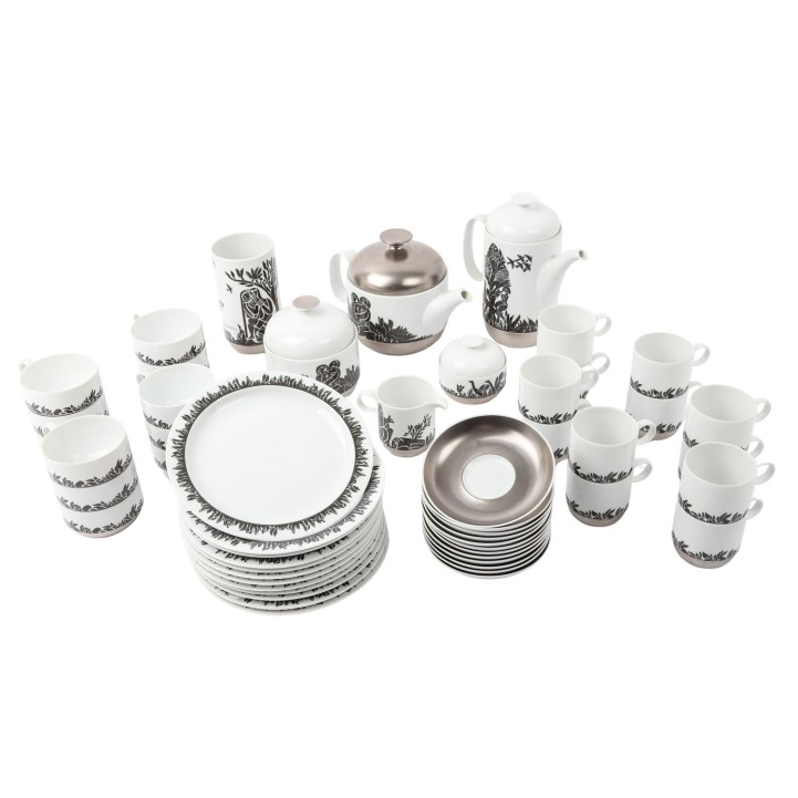 Formentwurf 'Duo' von Ambrogio Pozzi, Dekor 'Pastorale' von HAP Grieshaber, bestehend aus Teekanne, Kaffeekanne 12 Kuchentellern, 12 Teetassen, 12 Kaffeetassen mit UT, Zuckerdose, Milchgießer, Tischvase und Deckeldose. Schöner Erhalt mit part. Gebrauchsspuren.