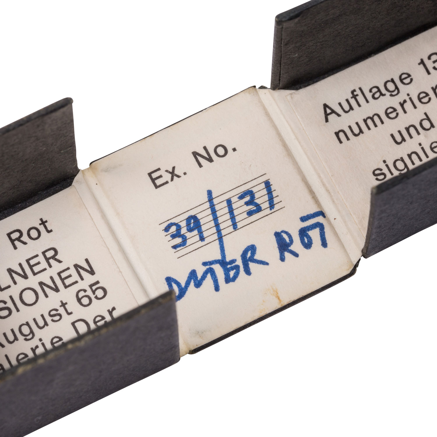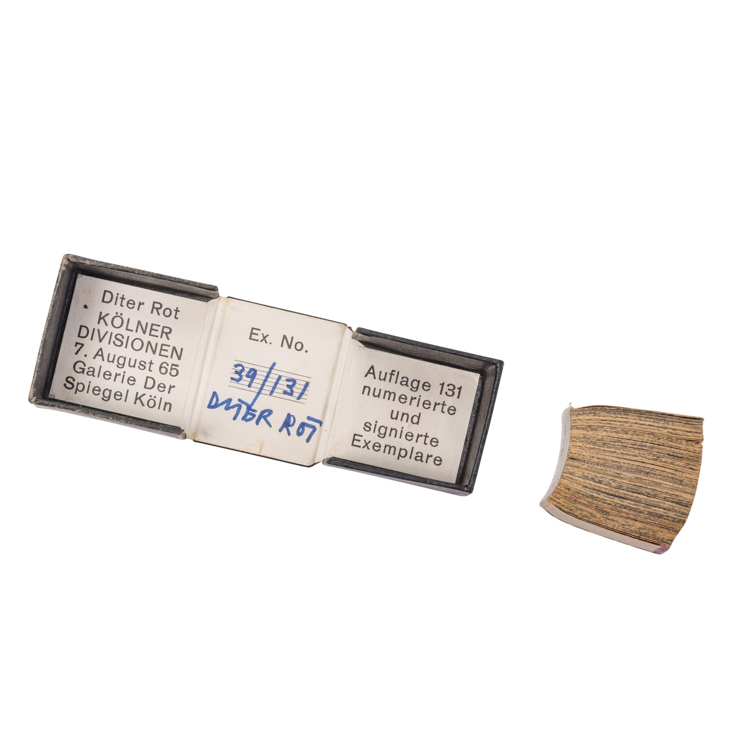 Galerie der Spiegel Köln, Auflage 131 numerierte und signierte Exemplare, in der Kassette von Hand num. 39/131 und signiert 'Diter Rot', Außenmaße HxBxT: ca. 2,8x2,5x2,3 cm. Alters- und Gebrauchsspuren, die erste Seite wohl fehlend.