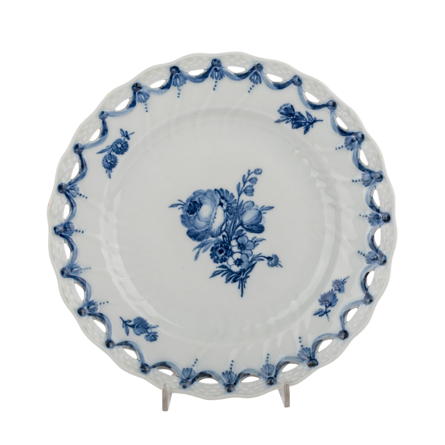 Weißporzellan mit blauer Blumen- und Girlandenmalerei, durchbrochen gearbeitete Fahne mit Korbrandrelief, blaue Wellenmarke (1870-1890), D. ca. 23cm. Unterseitig feine Risse unter der Glasur, Brandfehler.