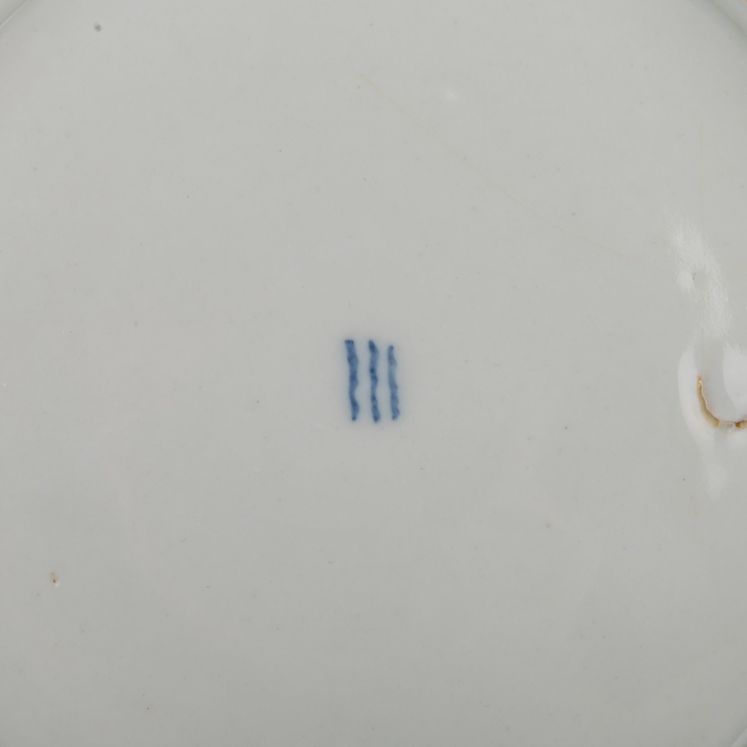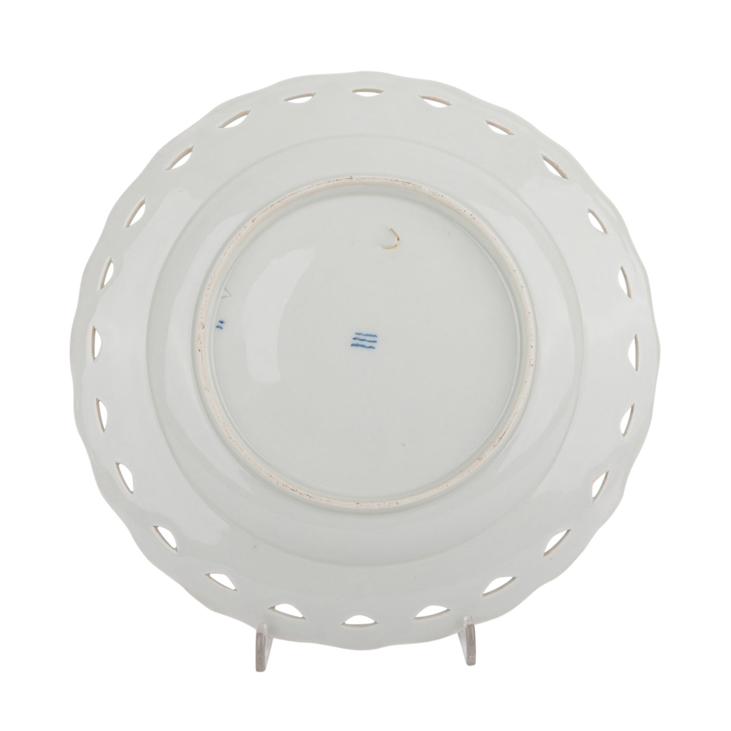 Weißporzellan mit blauer Blumen- und Girlandenmalerei, durchbrochen gearbeitete Fahne mit Korbrandrelief, blaue Wellenmarke (1870-1890), D. ca. 23cm. Unterseitig feine Risse unter der Glasur, Brandfehler.