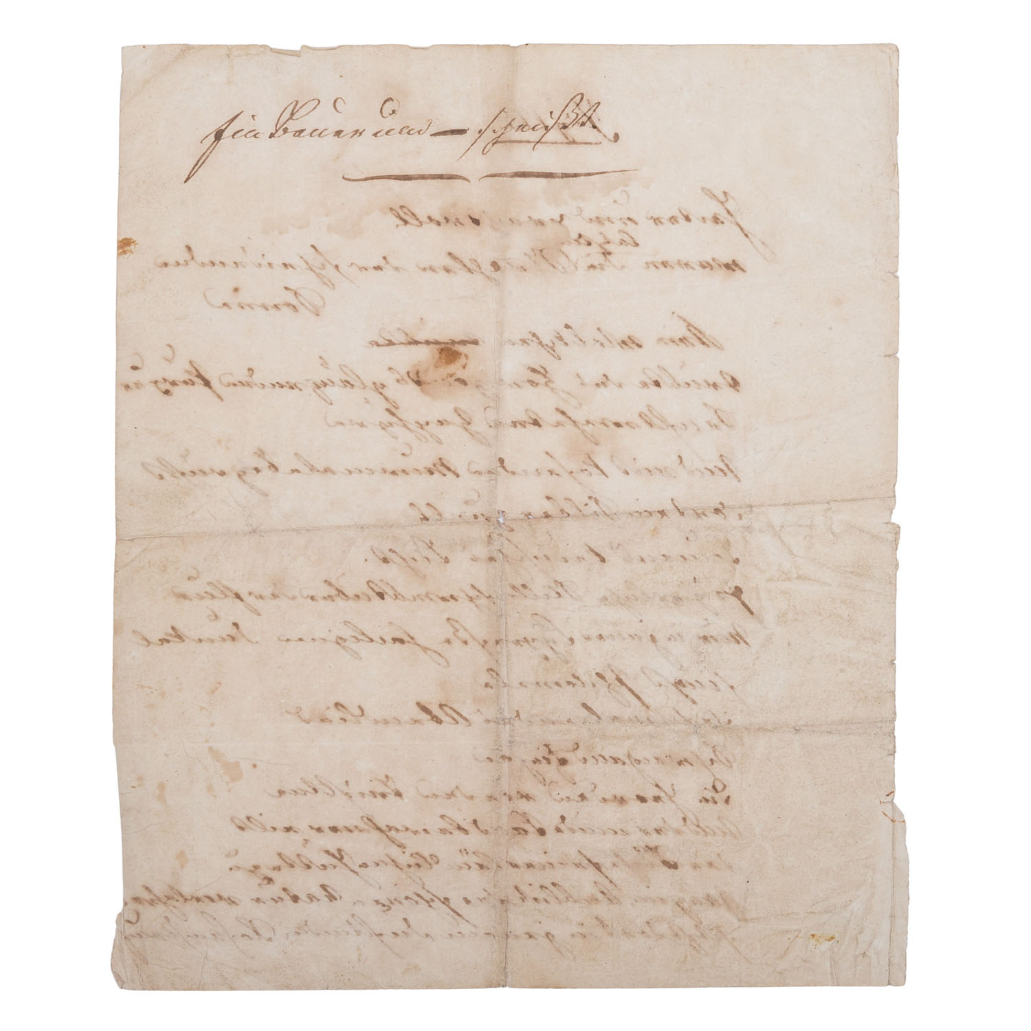 Doppelseitiges beschriebenes Papier (HxB: ca. 22,4 x 19 cm). Alters- und Beriebsspuren, gebräunt, leicht fleckig, Randläsionen, Quetschspuren, feine Löcher an den Faltspuren.