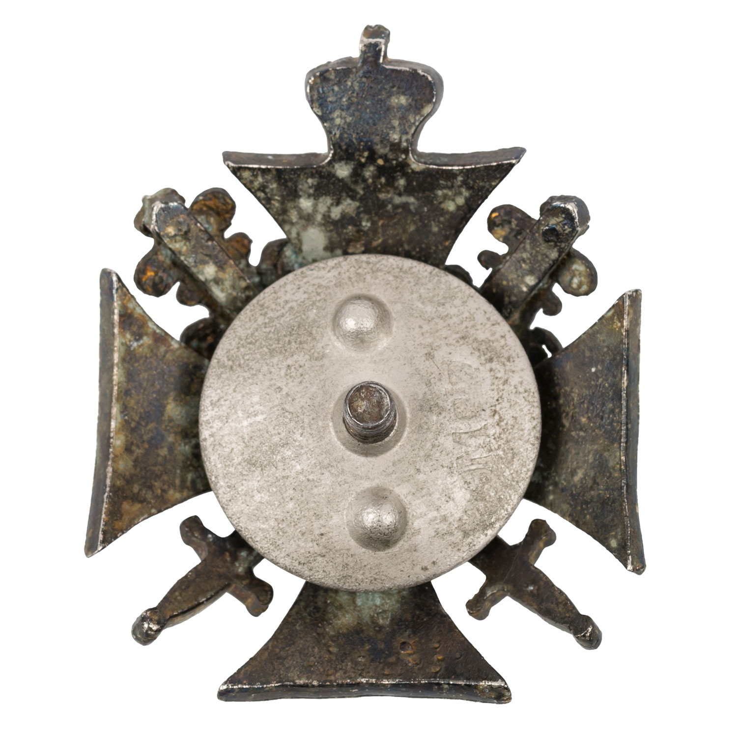 schwarze Emaille, Zarenkrone, Initialen und 'L', Schwerter, gebogenes Kreuz mit Schraubverschluss. Alters- und Gebrauchsspuren wie Tönung und leichte Oxidation.