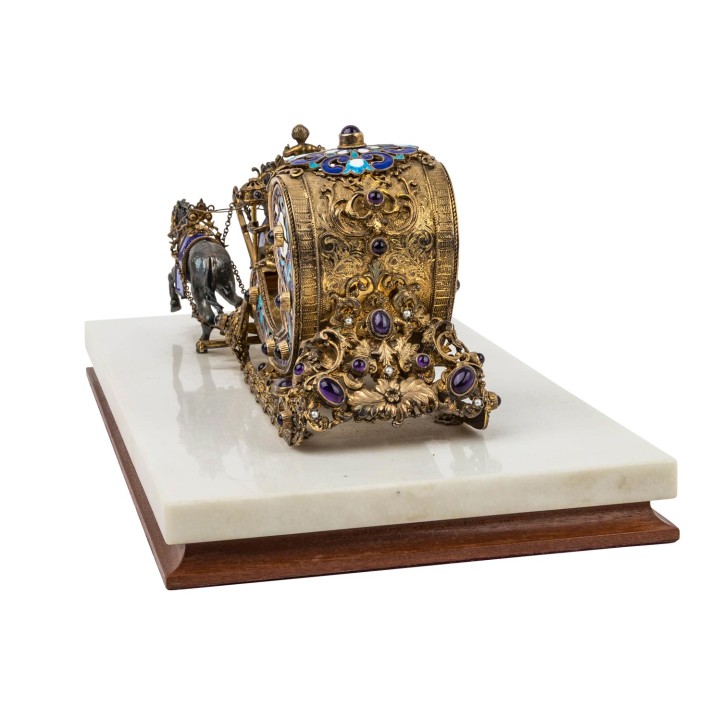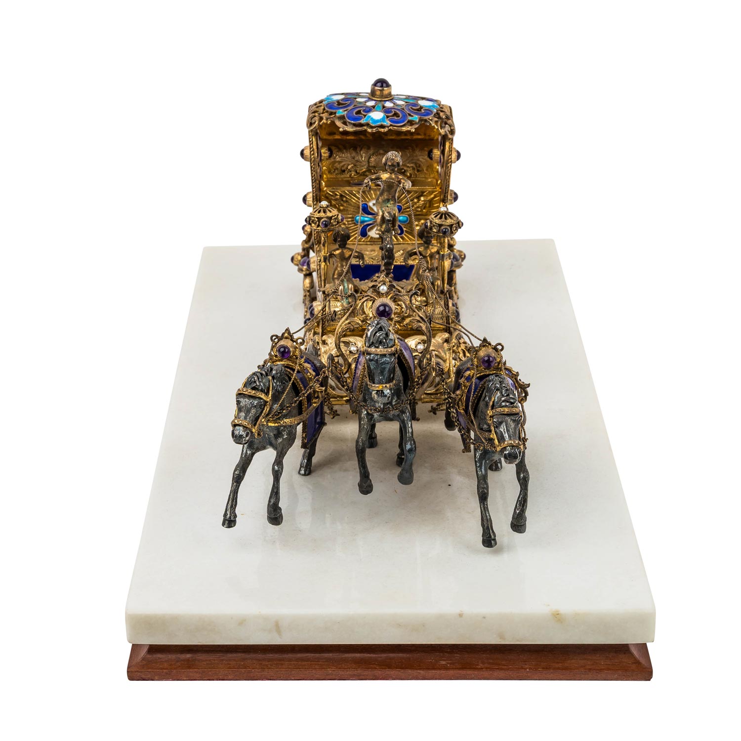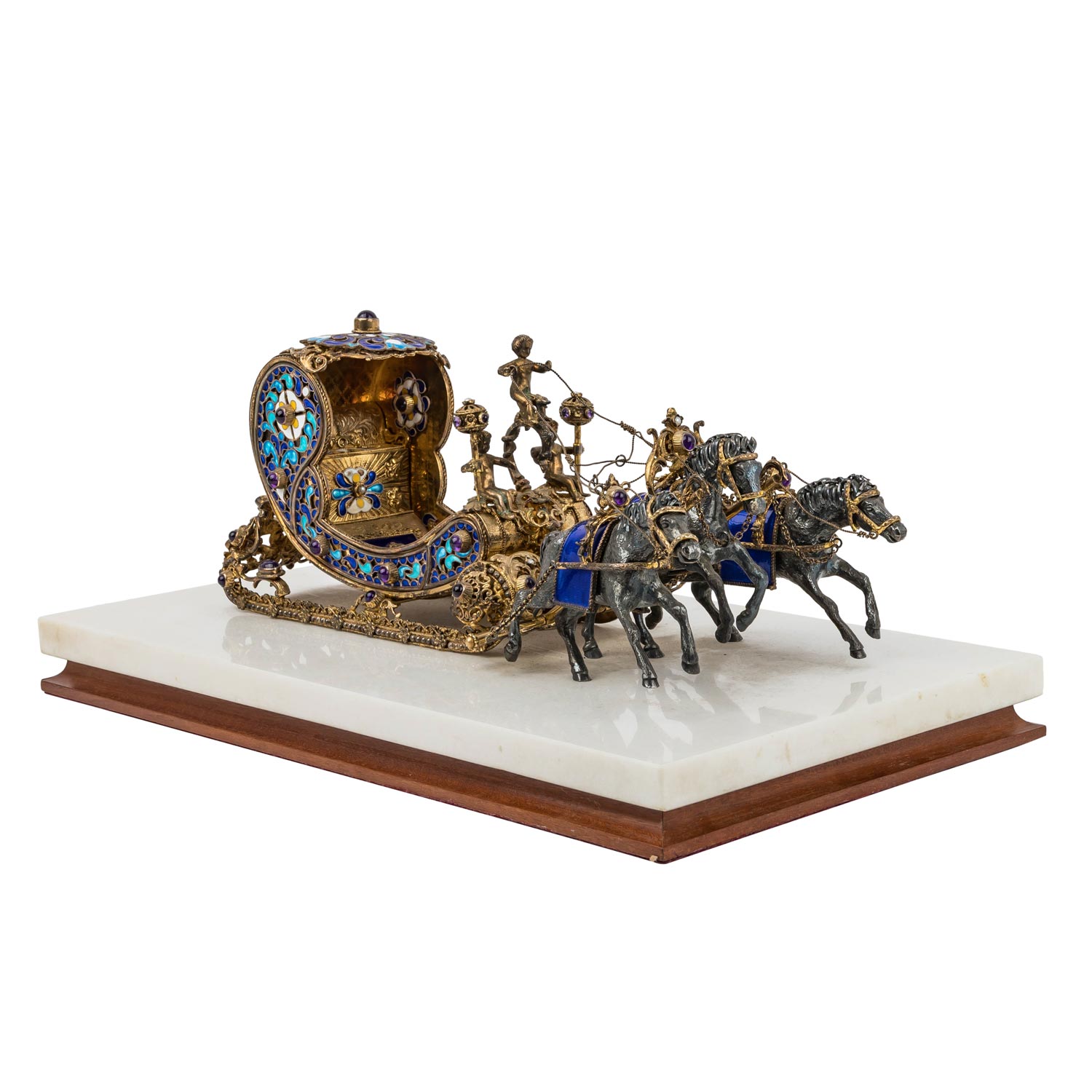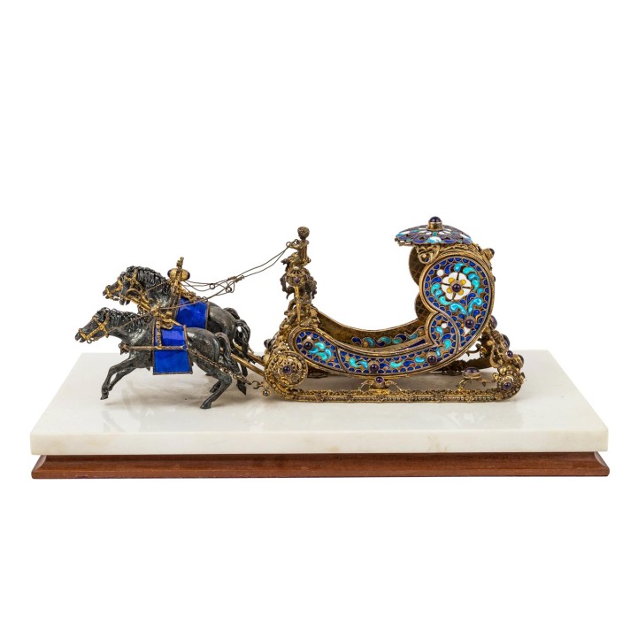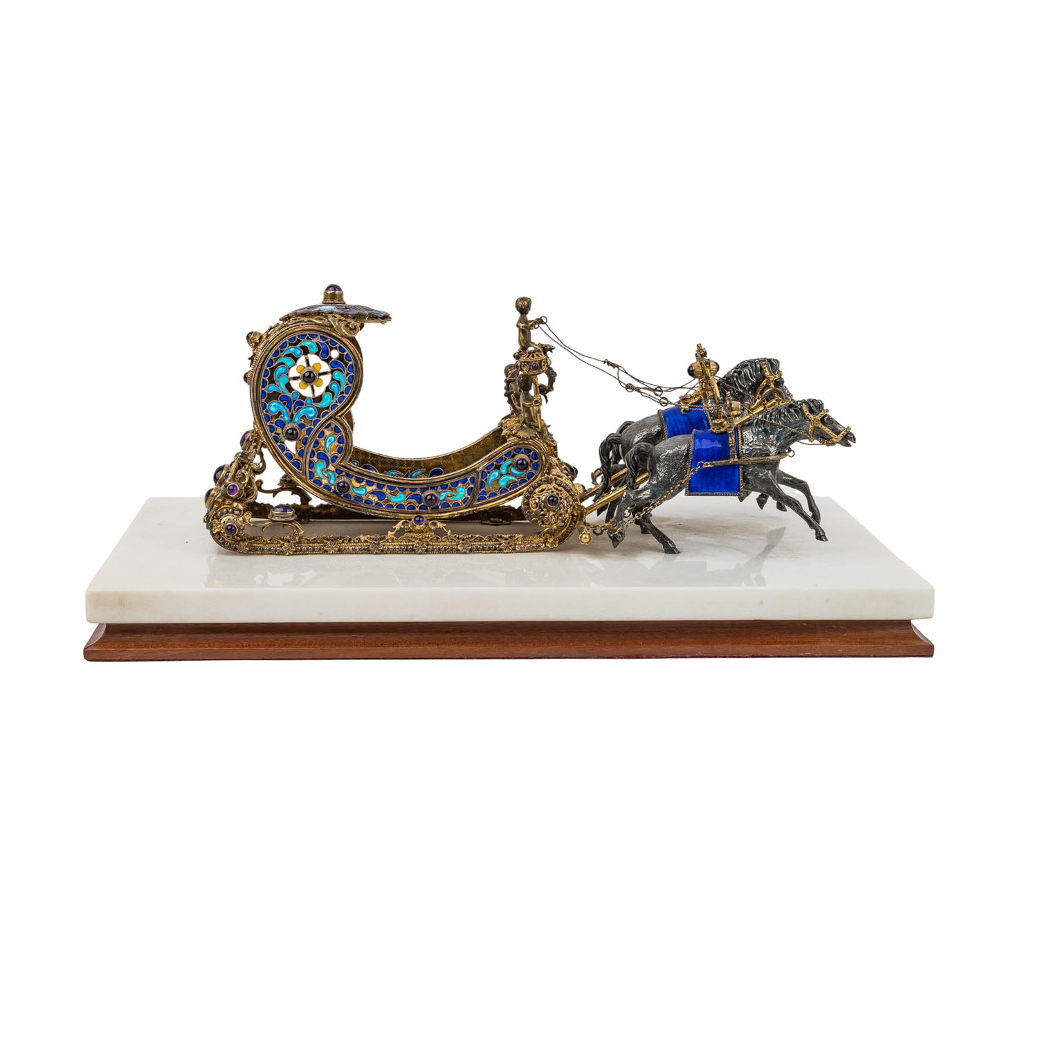 im Fabergé-Stil, Schlitten üppig ornamentiert mit feinen Gravur- und Emaillearbeiten in Gelb, Weiß, Türkis und Königsblau, tlw, durchbrochen gearbeitet und mit Amethyst- Cabochons geschmückt, vergoldet. Gezogen wird der Schlitten von einem ebenso prunkvollen und dynamischen Pferdegespann, dessen Satteldecken leuchtend blau emailliert sind und dessen Geschirr ebenfalls vergoldet ist. Auf dem Schlitten vorne sitzt ein Putto, der das Pferdegespann antreibt. Rechts und links von ihm sitzt jeweils ein Putto, der ein mit Steinen geschmücktes Zepter in die Höhe hält. Auf einer Marmorplatte montiert, LxB: ca. 42x22 cm, punziert. Altersspuren.