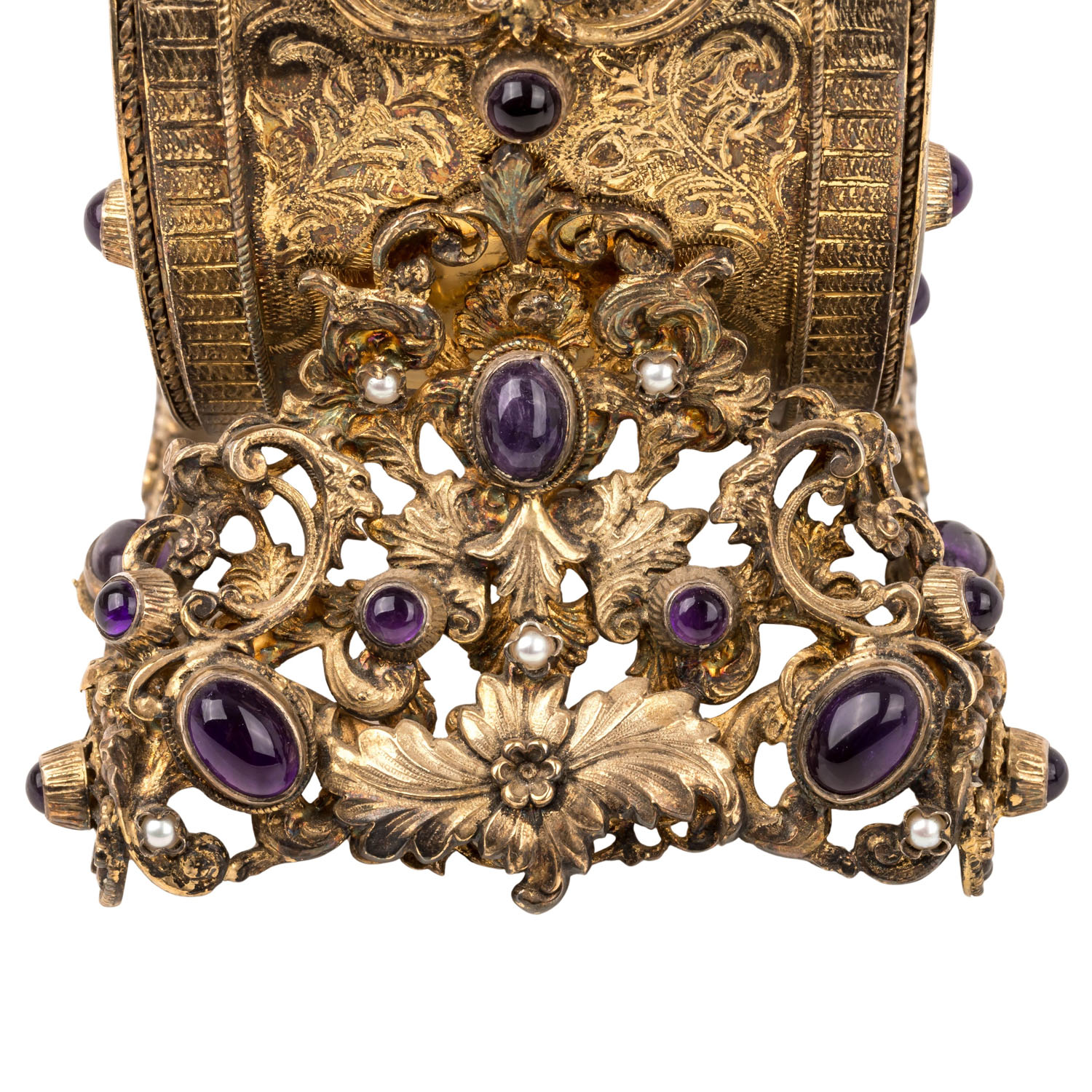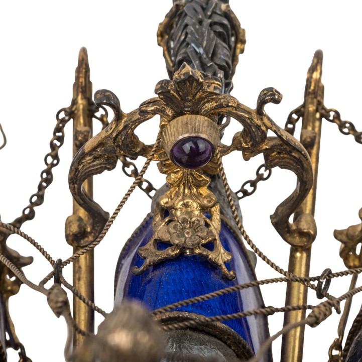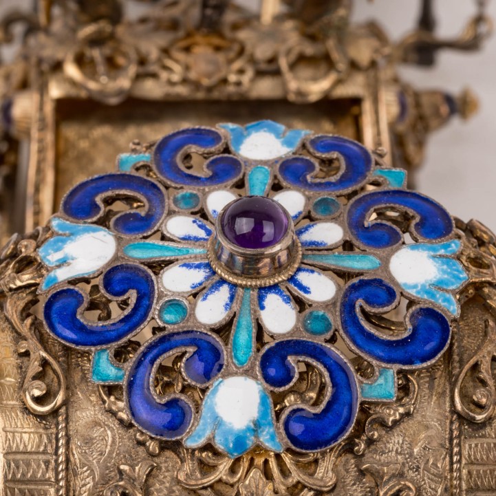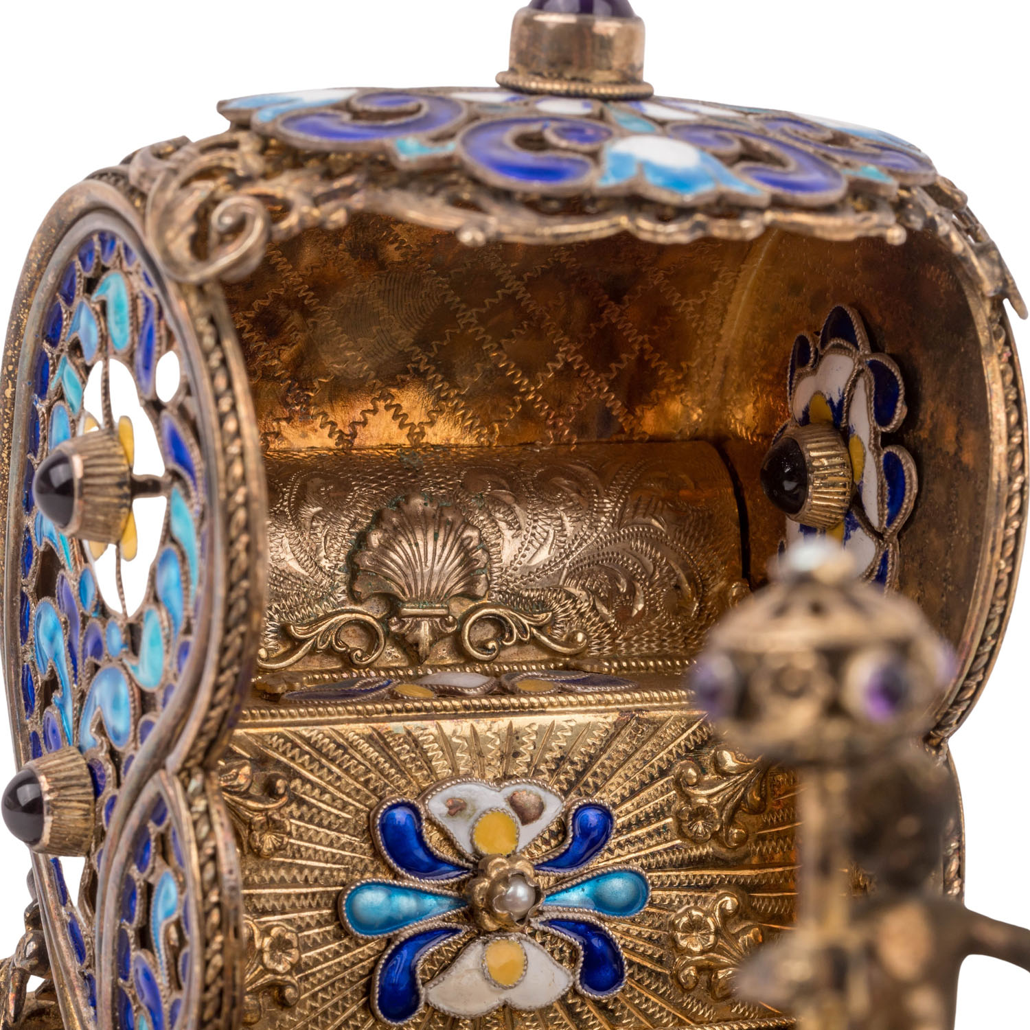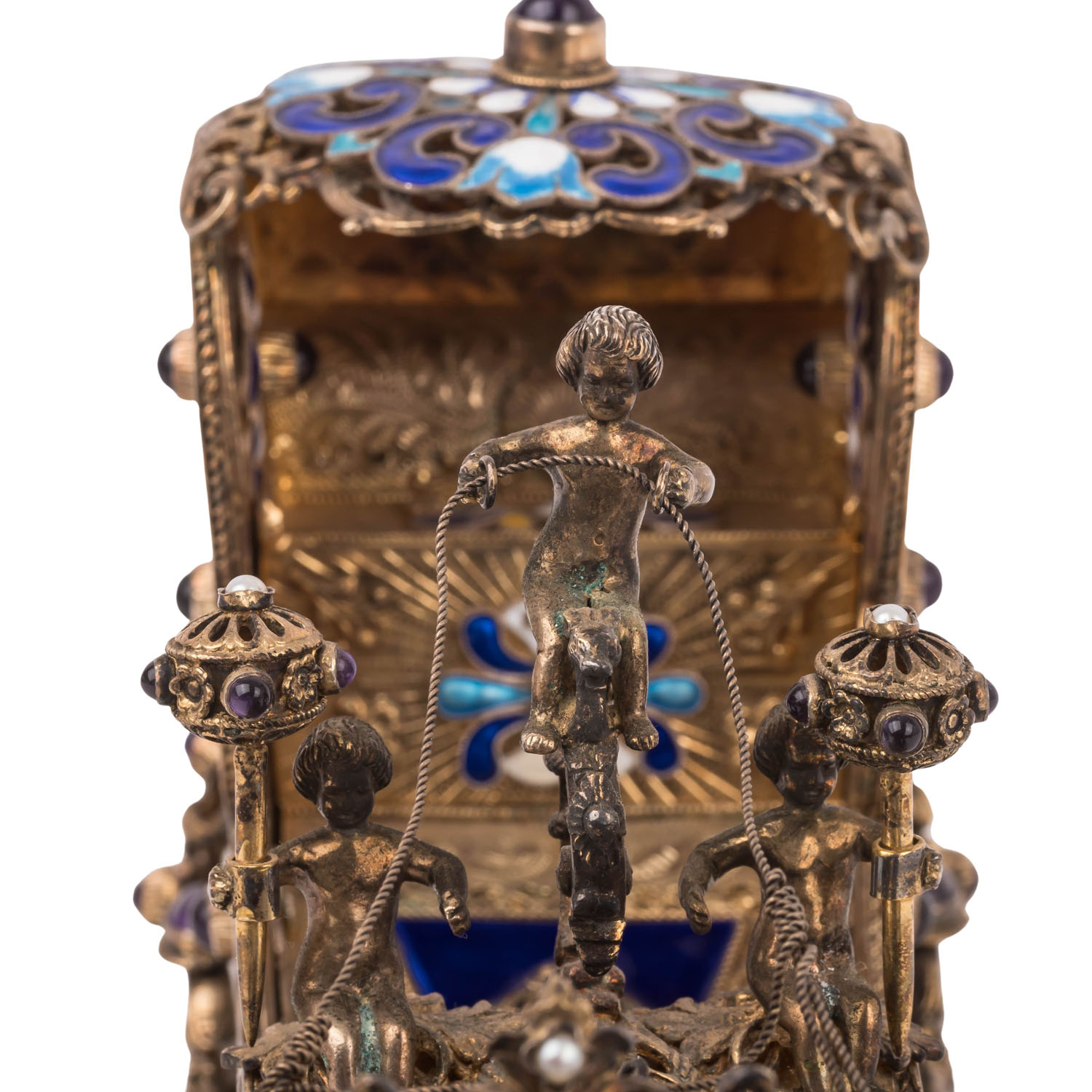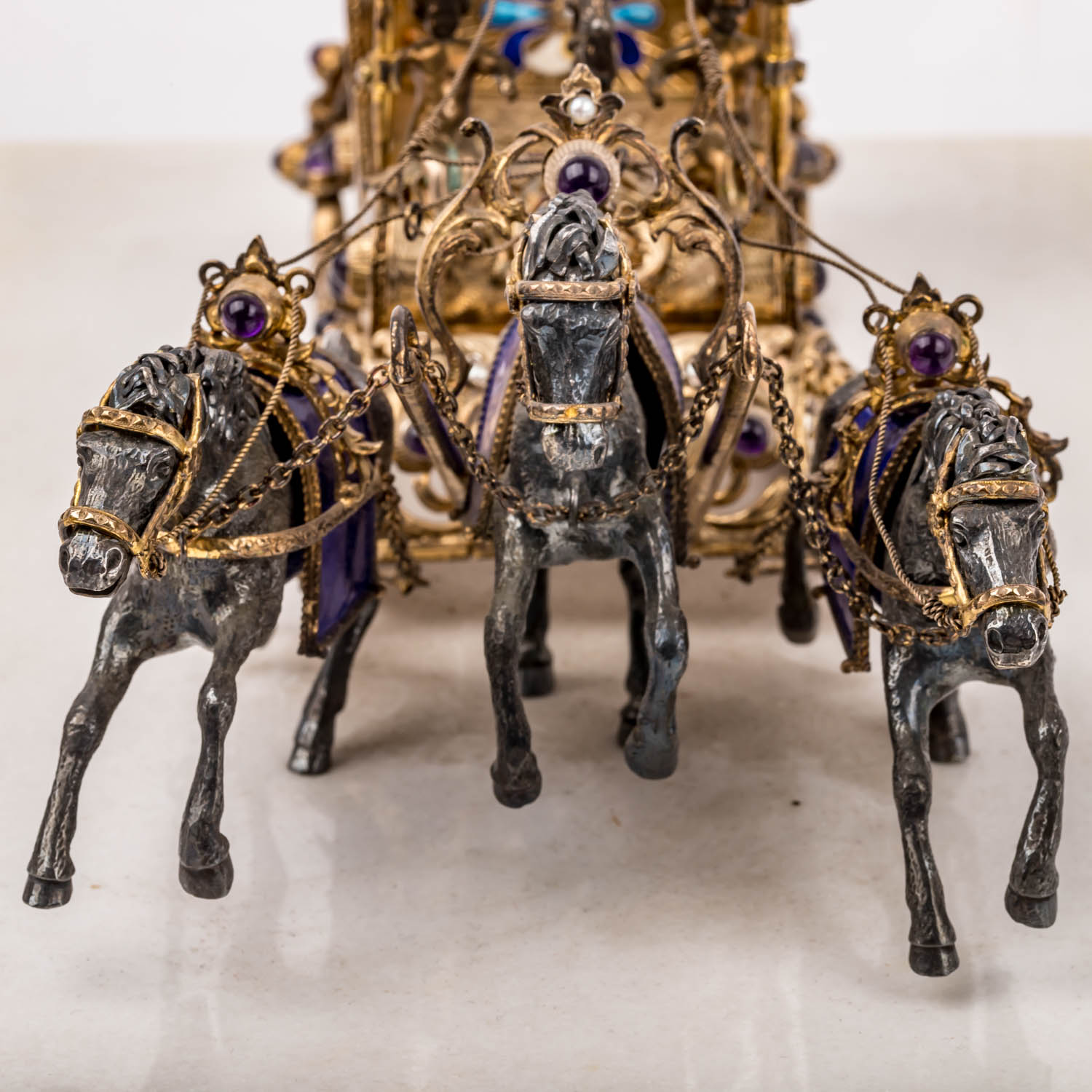 im Fabergé-Stil, Schlitten üppig ornamentiert mit feinen Gravur- und Emaillearbeiten in Gelb, Weiß, Türkis und Königsblau, tlw, durchbrochen gearbeitet und mit Amethyst- Cabochons geschmückt, vergoldet. Gezogen wird der Schlitten von einem ebenso prunkvollen und dynamischen Pferdegespann, dessen Satteldecken leuchtend blau emailliert sind und dessen Geschirr ebenfalls vergoldet ist. Auf dem Schlitten vorne sitzt ein Putto, der das Pferdegespann antreibt. Rechts und links von ihm sitzt jeweils ein Putto, der ein mit Steinen geschmücktes Zepter in die Höhe hält. Auf einer Marmorplatte montiert, LxB: ca. 42x22 cm, punziert. Altersspuren.
