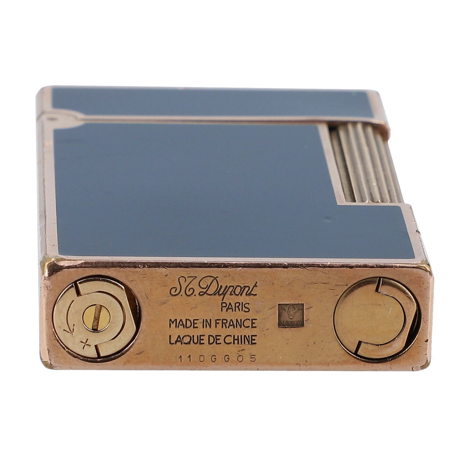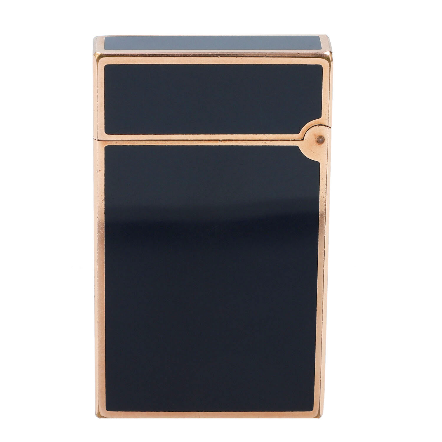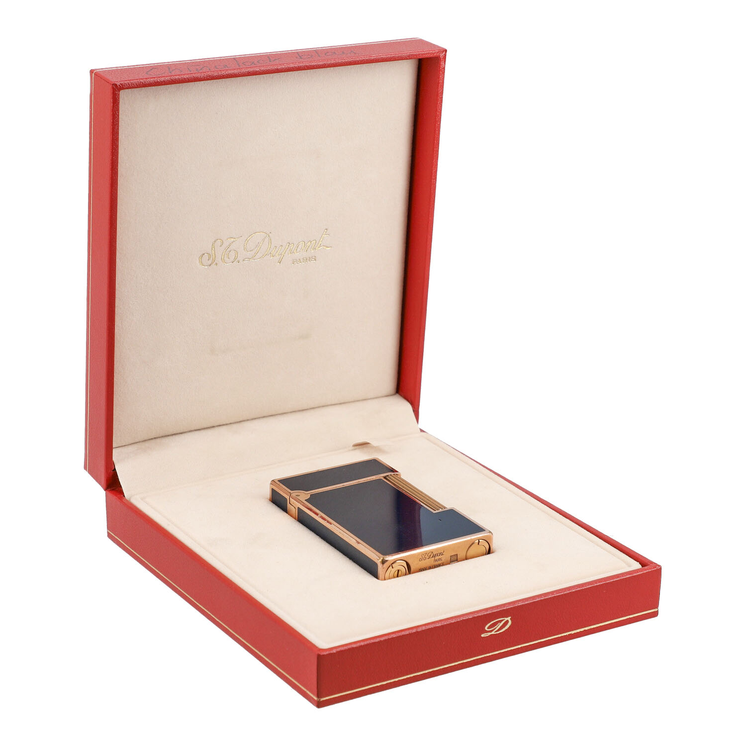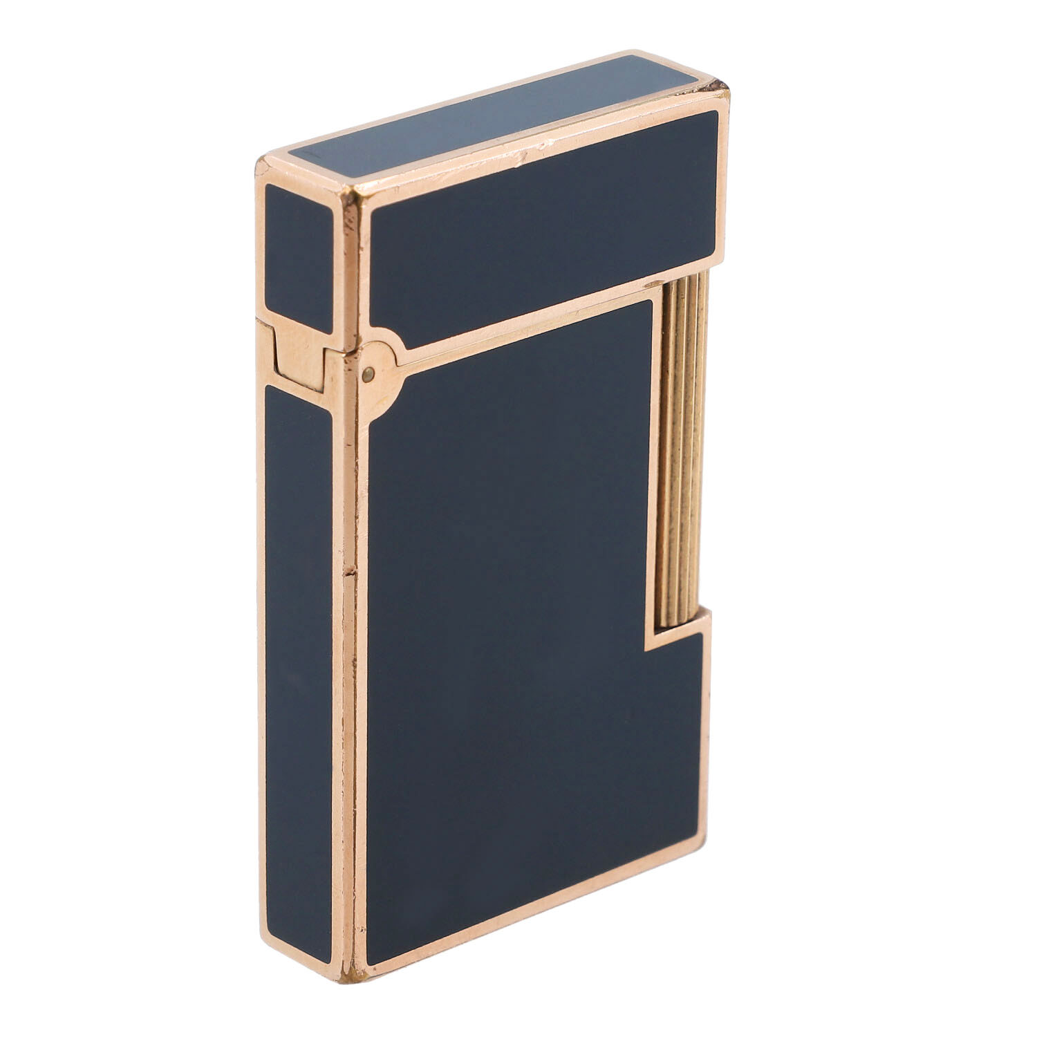 Koll. 1998. Chinalack in Dunkelblau mit roségoldfarbener Hardware. Etui anbei. Starke Gebrauchsspuren vorhanden. Funktionsfähig.