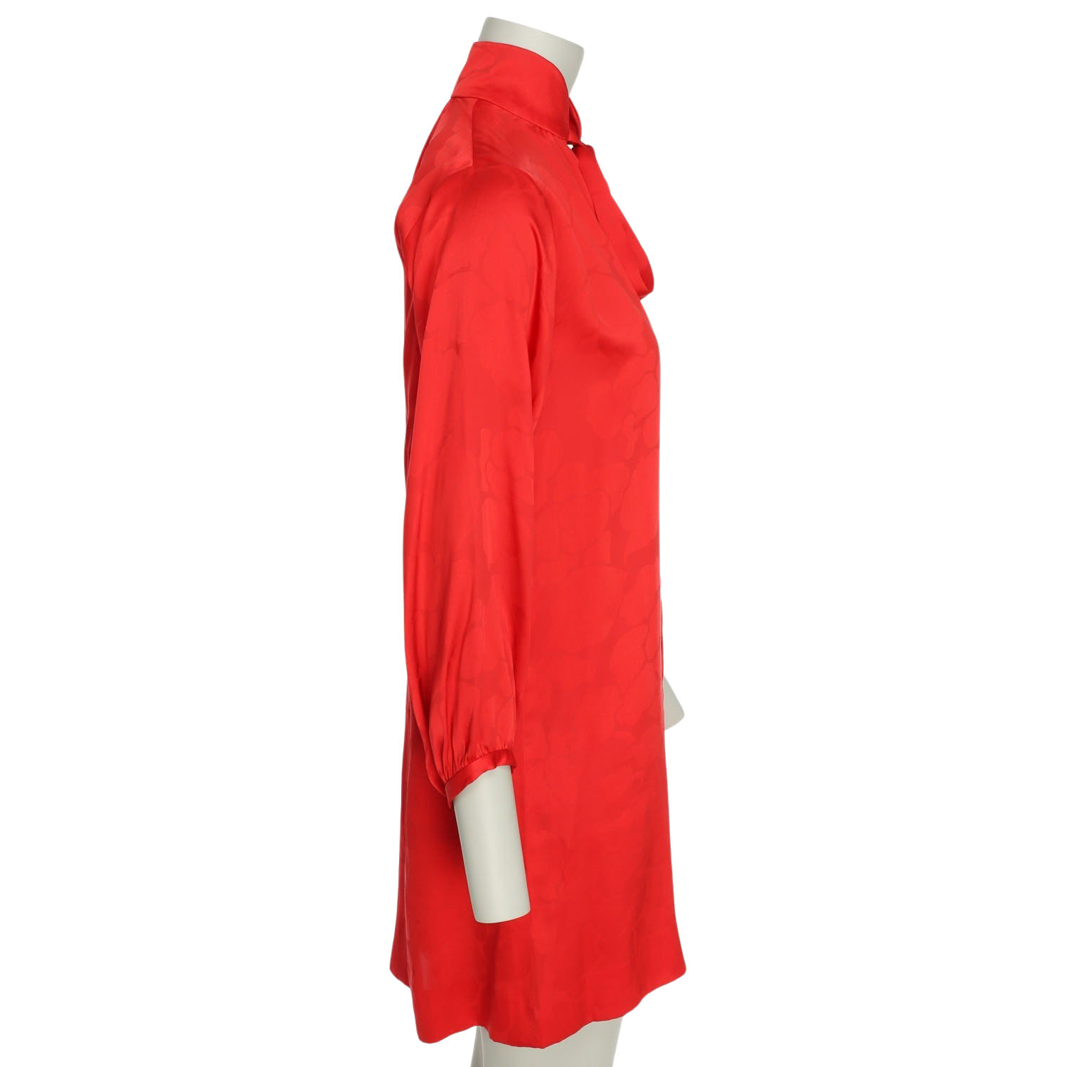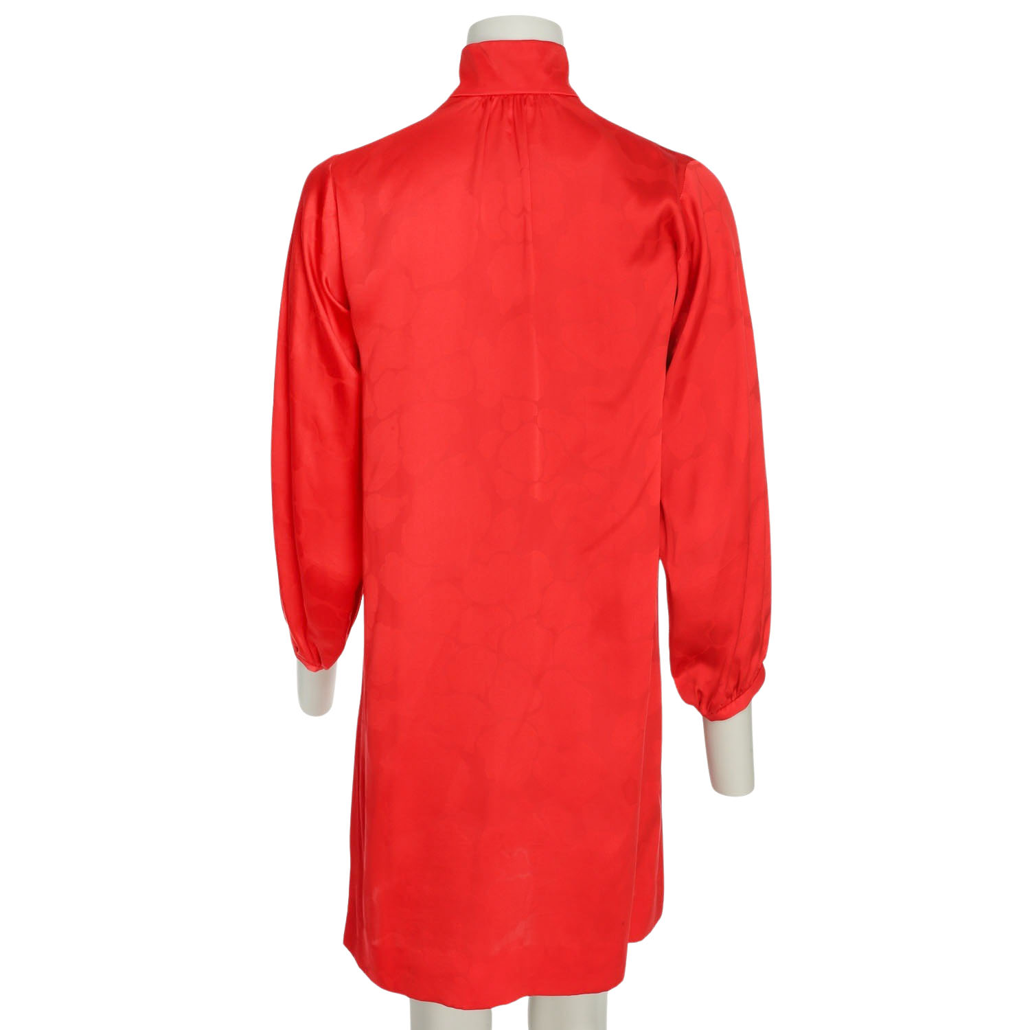 Rotes Modell aus Satin mit floralem Motiv, Stehkragen und Schluppe. Änderungen wurden vorgenommen, Tragespuren vorhanden.