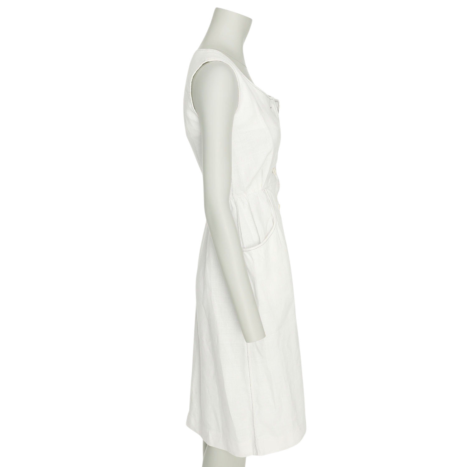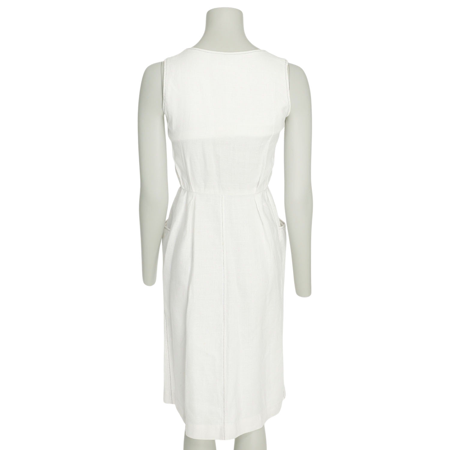 Weiße Midi-Modell aus Leinen mit Knopfverschluss, Kontrastnähten und Taschen. Tragespuren vorhanden.