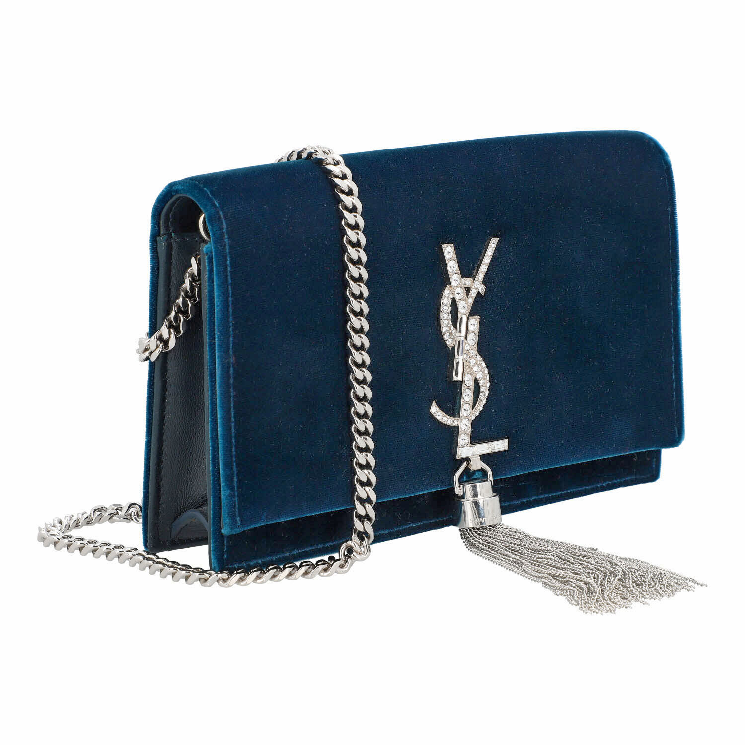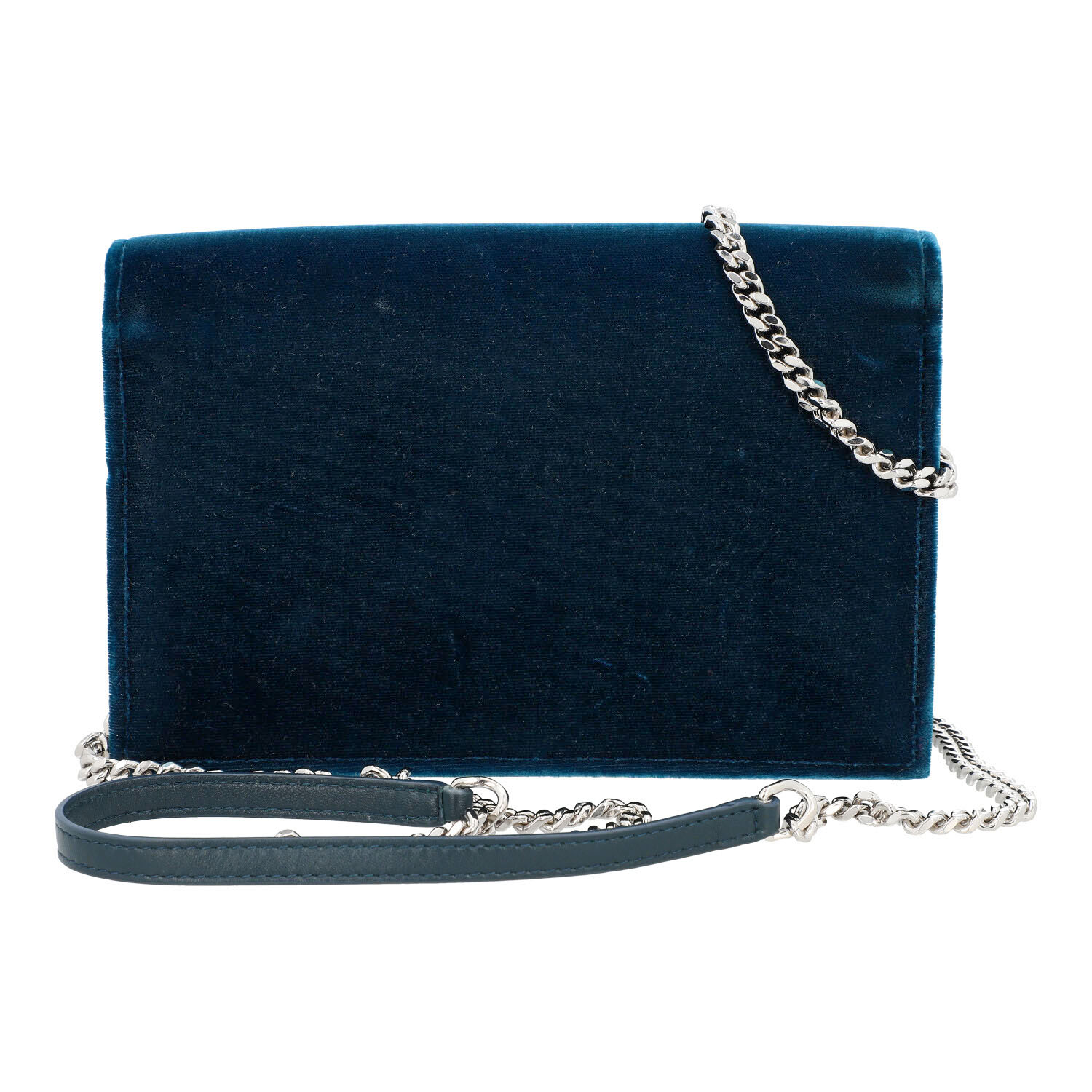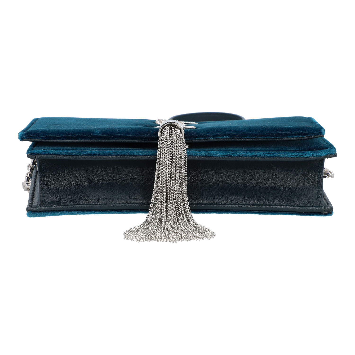 Korpus aus Samt in Petrolblau und schwarzem Leder mit silberfarbener Hardware. Front mit YSL-Applikation, dekorativer Quaste und Strass-Applikation. Hauptfach mit Innenfutter aus Leder. Abnehmbare, silberfarbene Gliederkette. Leichte Druckstellen und Tragespuren vorhanden. 19x4x12cm.