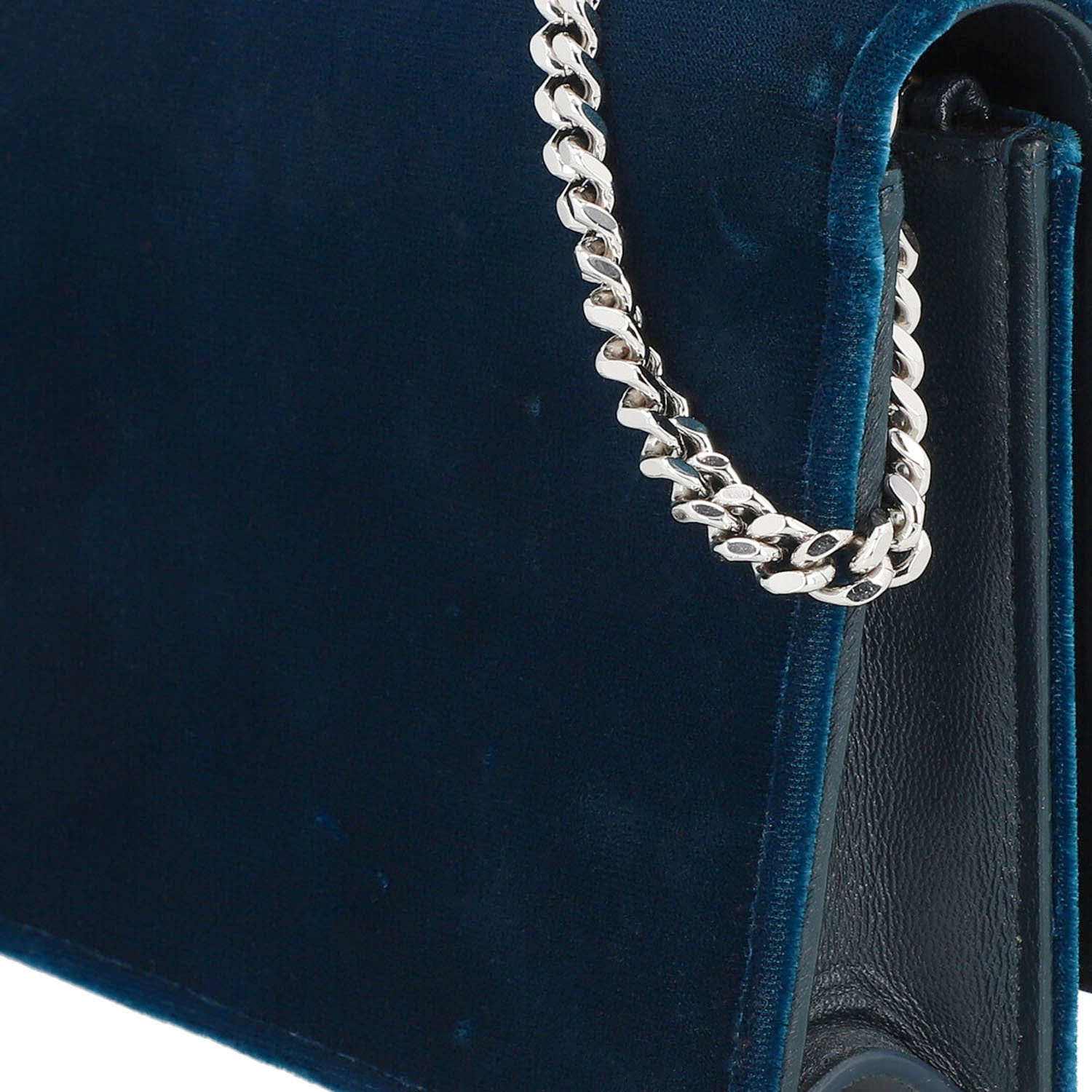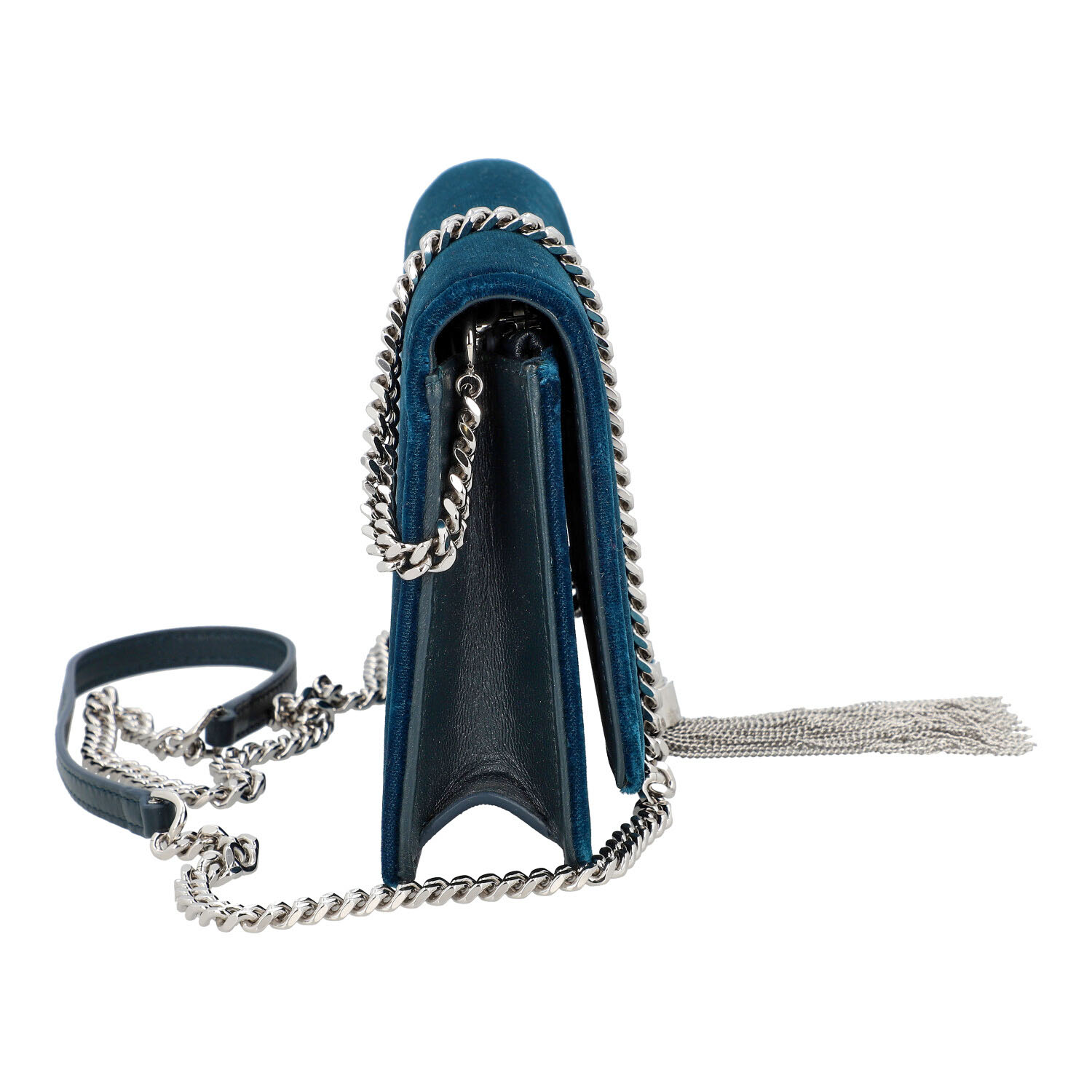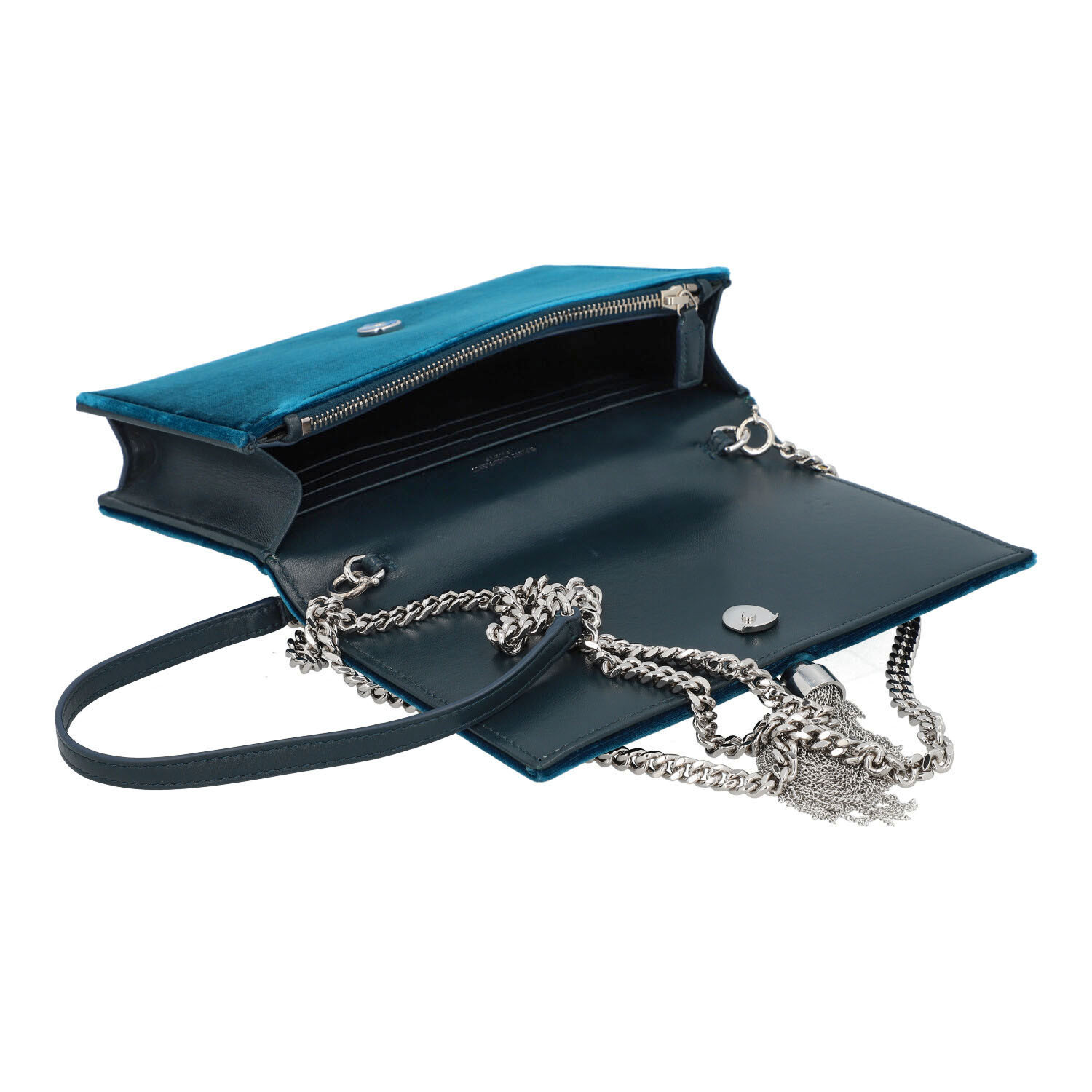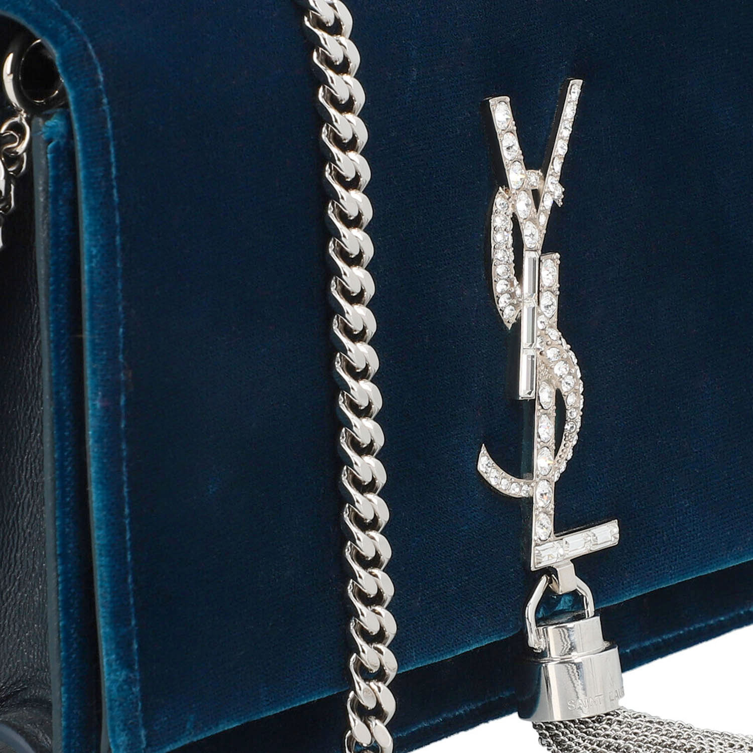 Korpus aus Samt in Petrolblau und schwarzem Leder mit silberfarbener Hardware. Front mit YSL-Applikation, dekorativer Quaste und Strass-Applikation. Hauptfach mit Innenfutter aus Leder. Abnehmbare, silberfarbene Gliederkette. Leichte Druckstellen und Tragespuren vorhanden. 19x4x12cm.