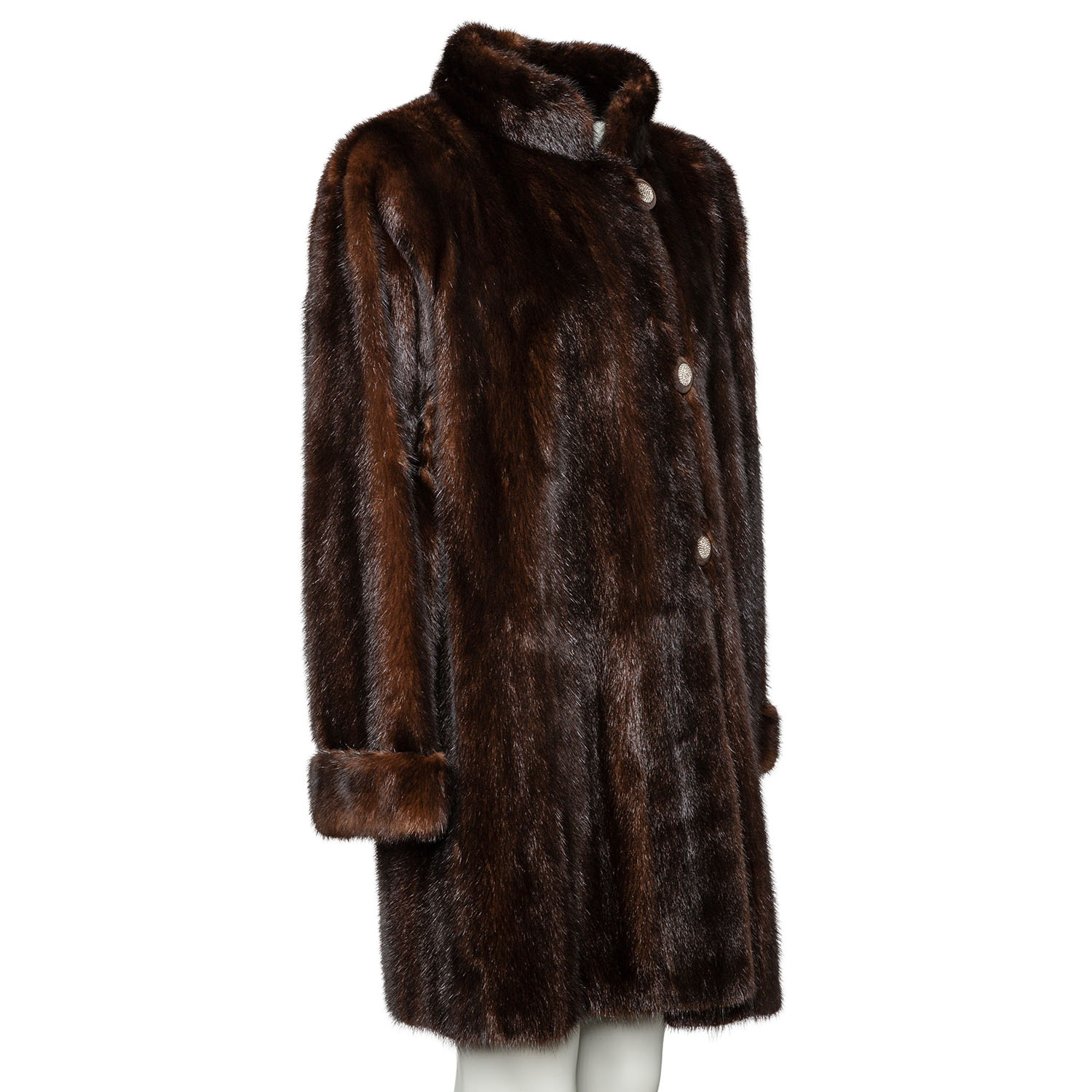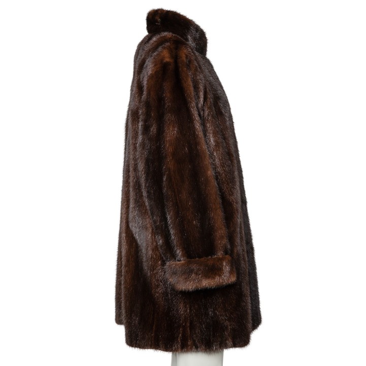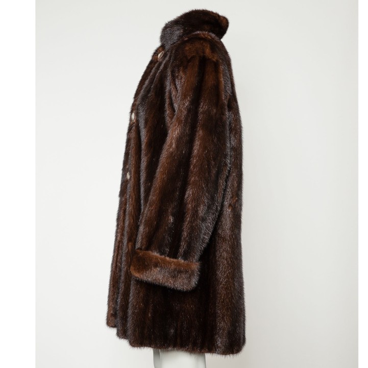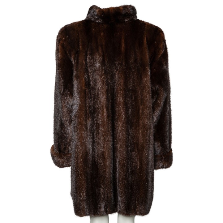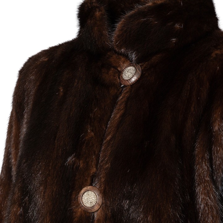 Dunkelbraune Nerzfelle. Innenfutter mit Logomuster. Stehkragen, Knopfverschluss. Leichte Alters- und Tragespuren vorhanden.
