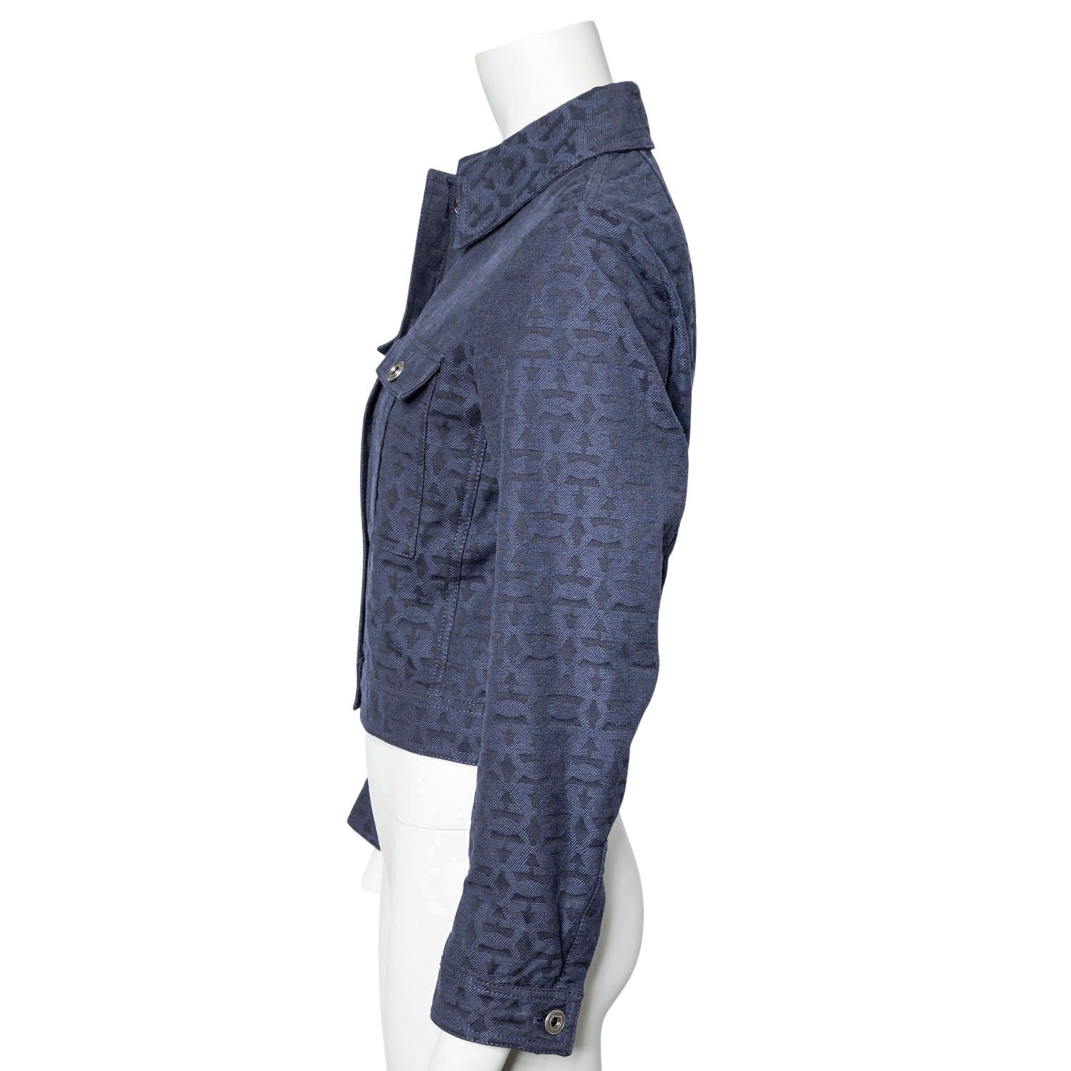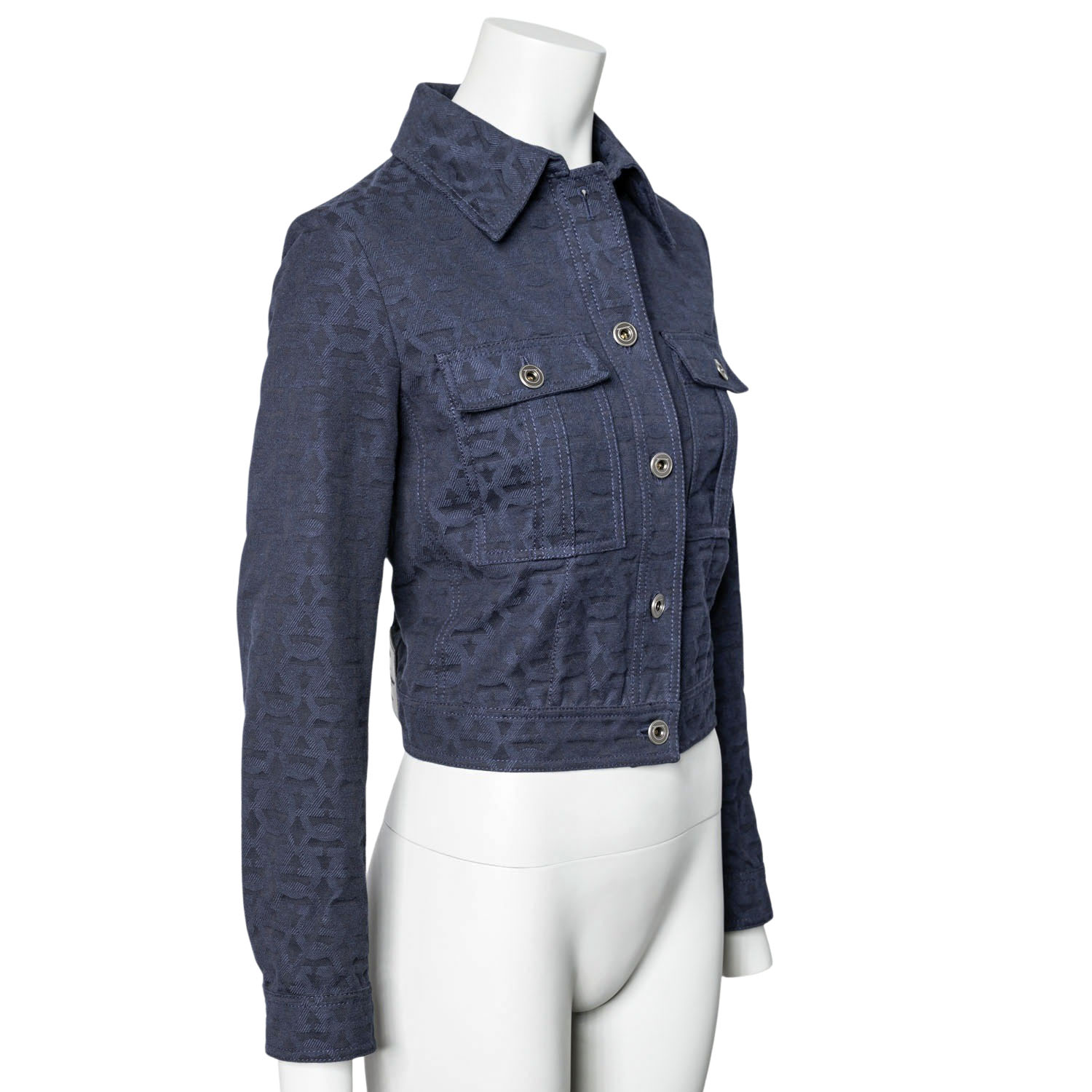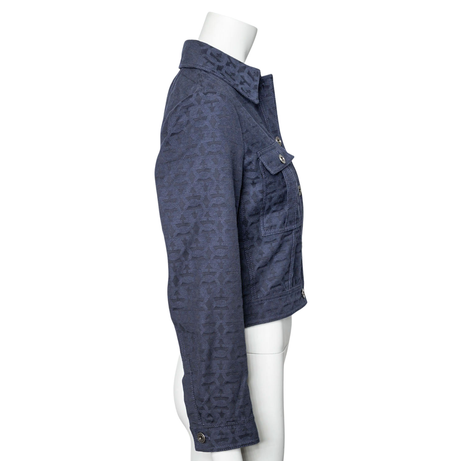 Kurze Jeansjacke in Dunkelblau/Schwarz mit All-Over Logomuster. Silberfarbene Knöpfe. Zwei Brusttaschen. Guter Erhalt.