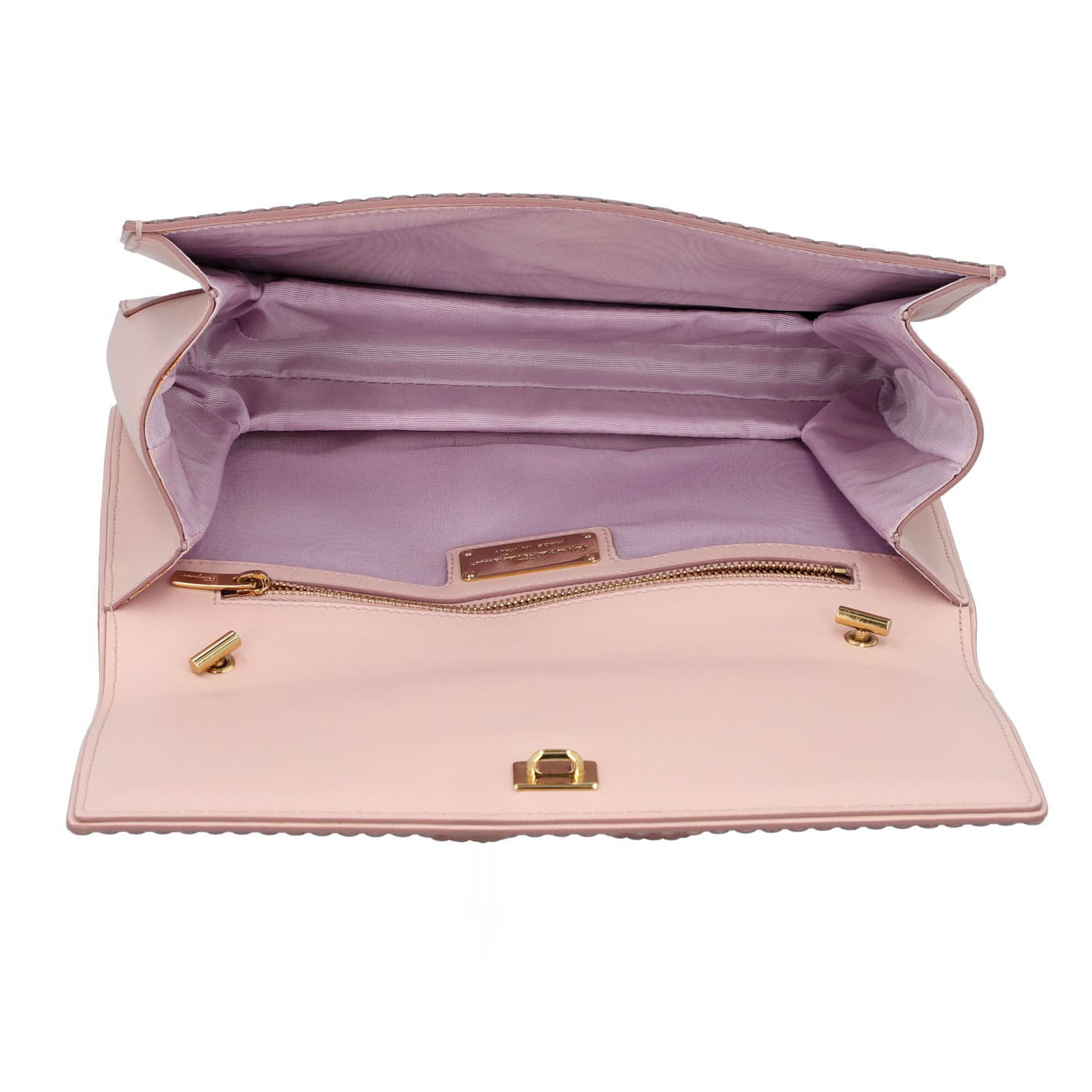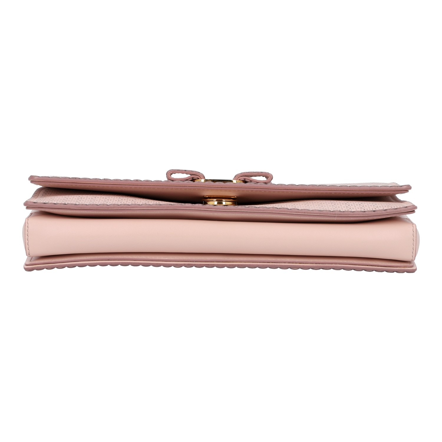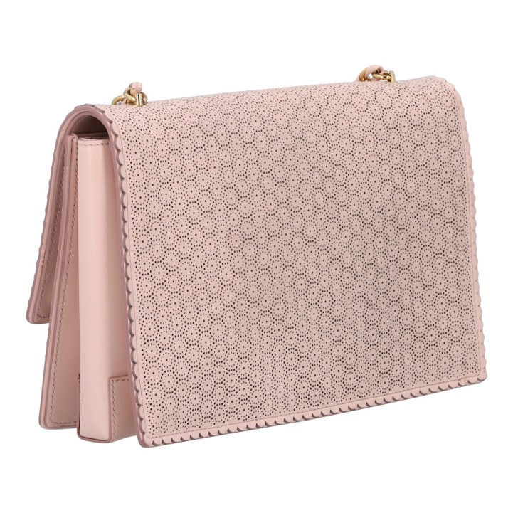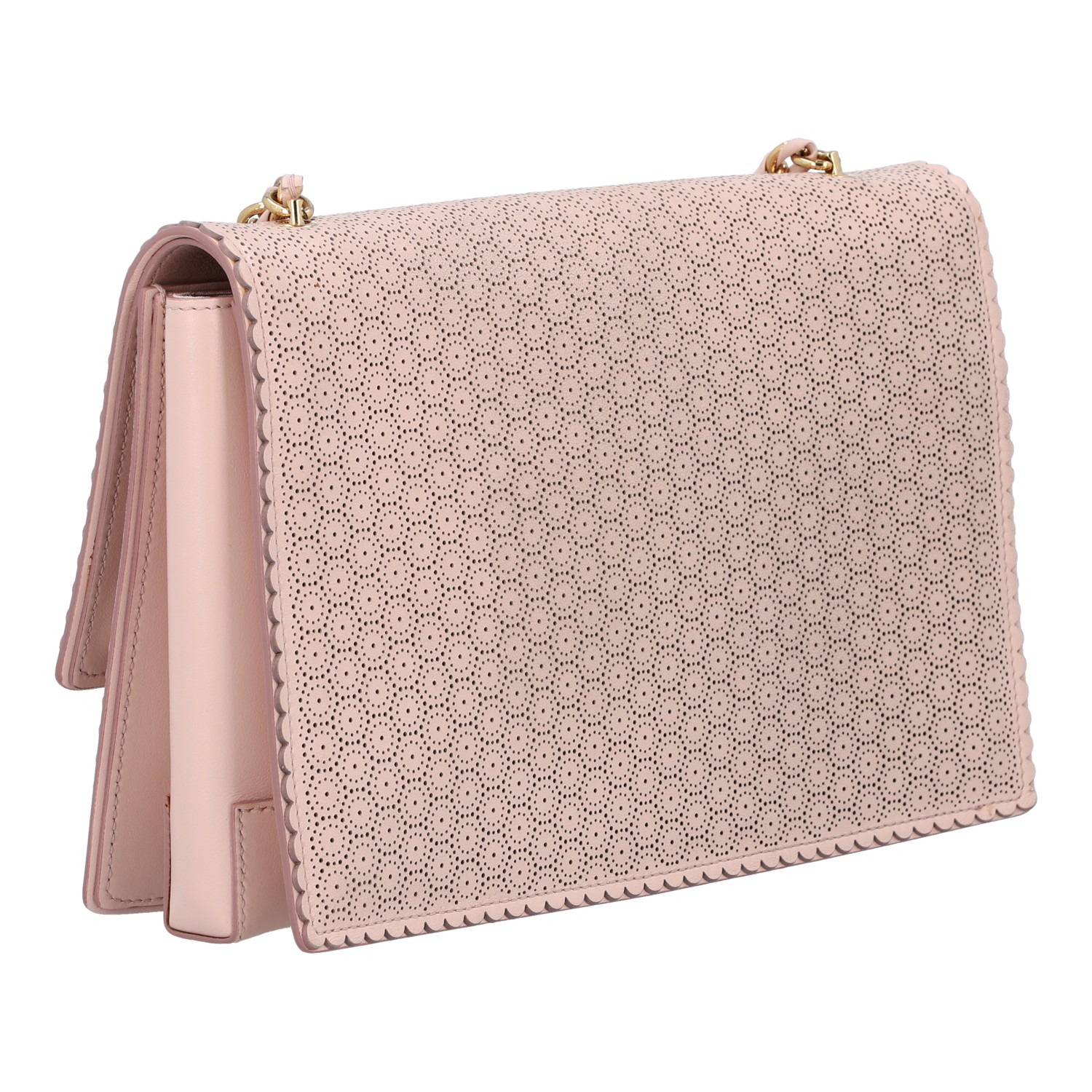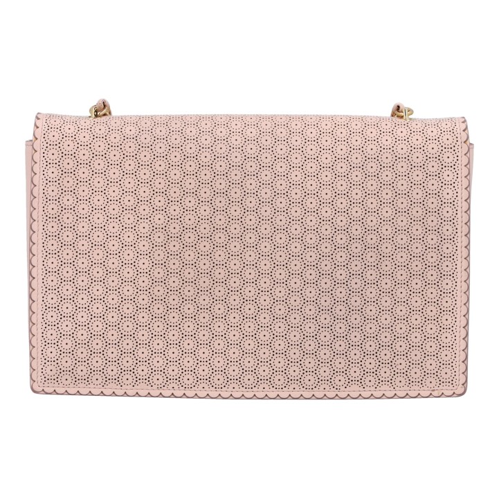 Rosafarbenes Modell aus perforiertem Leder mit goldfarbener Hardware, Überschlag und Leder-durchflochtenem Kettenriemen. Innenraum aus Textil mit Reißverschlussfach. Dezente Gebrauchsspuren vorhanden. 24,5 x 5 x 16 cm.