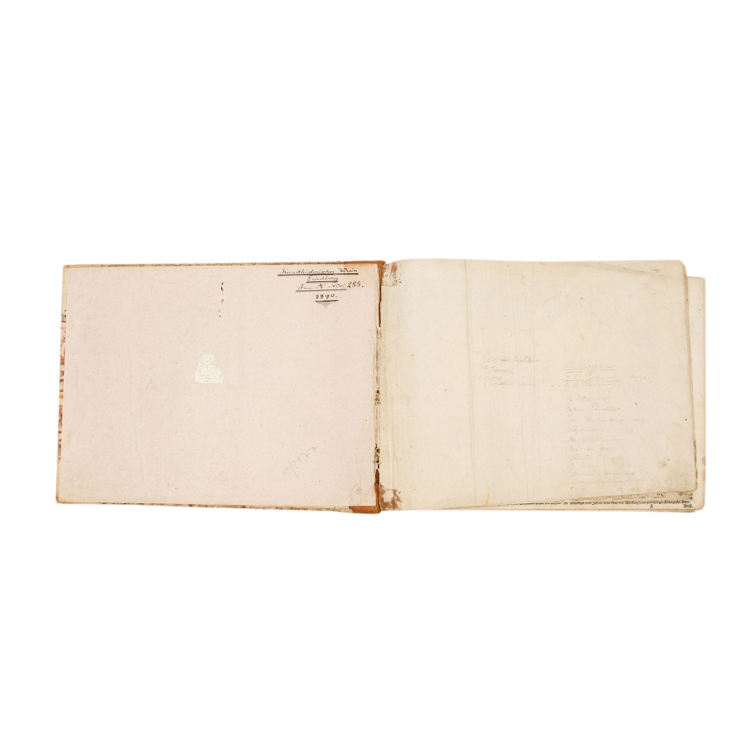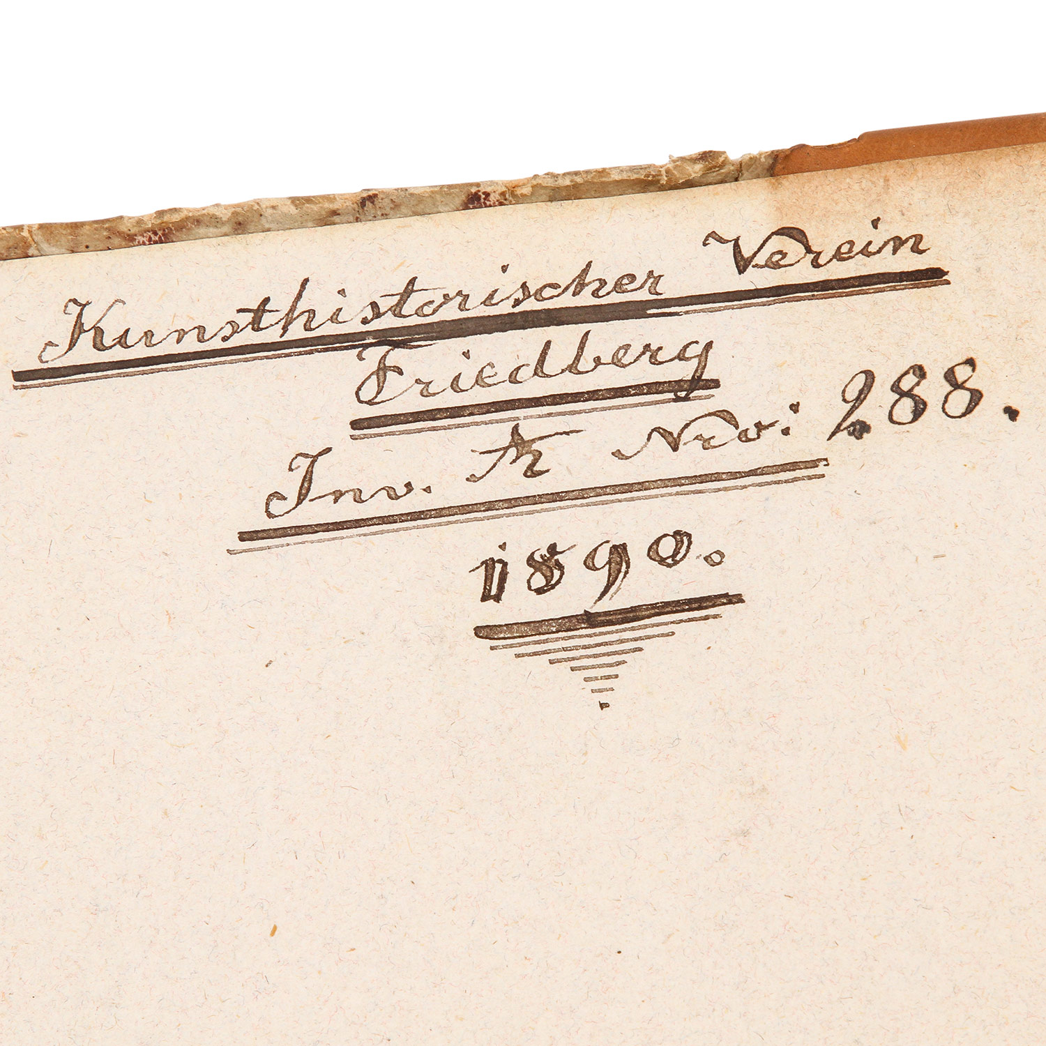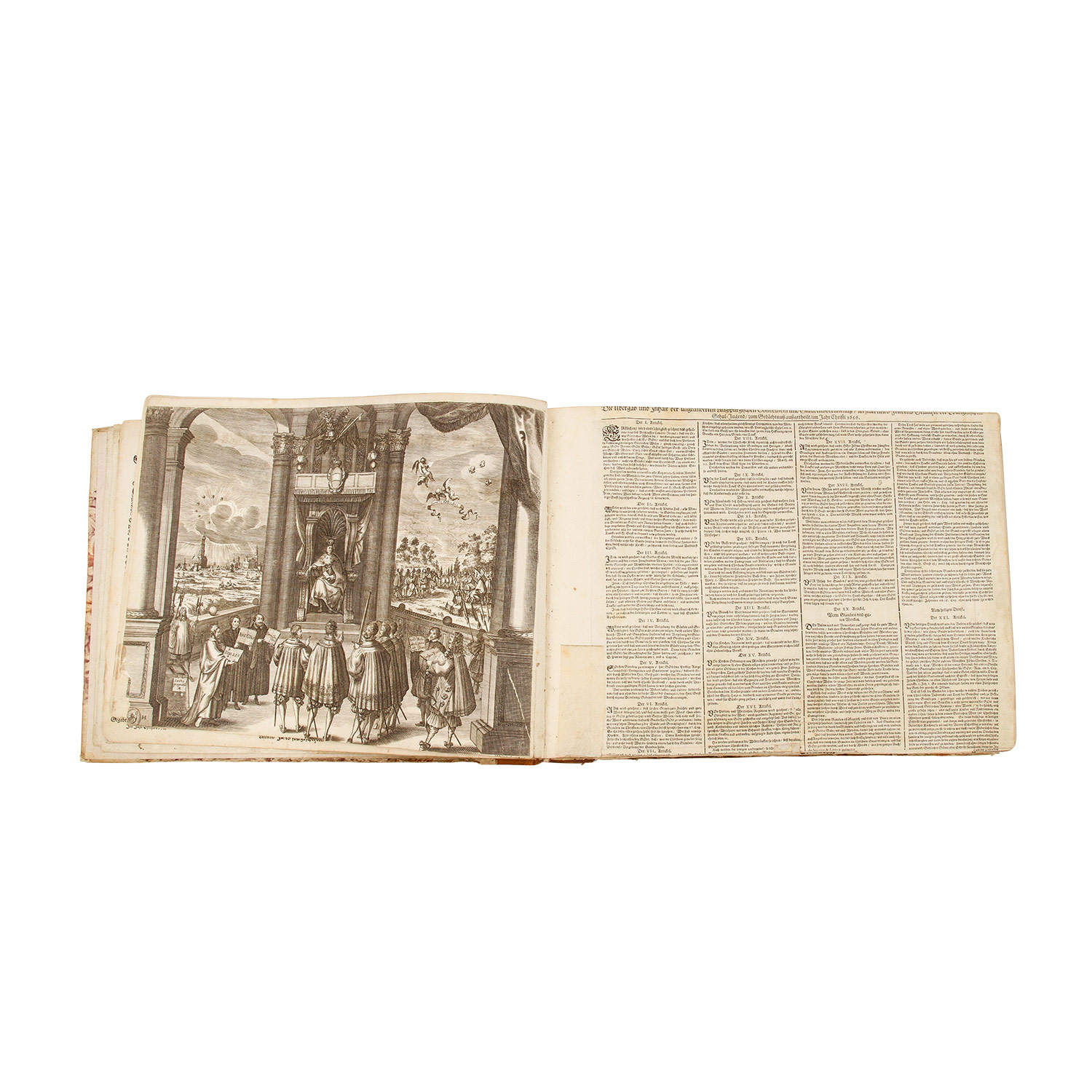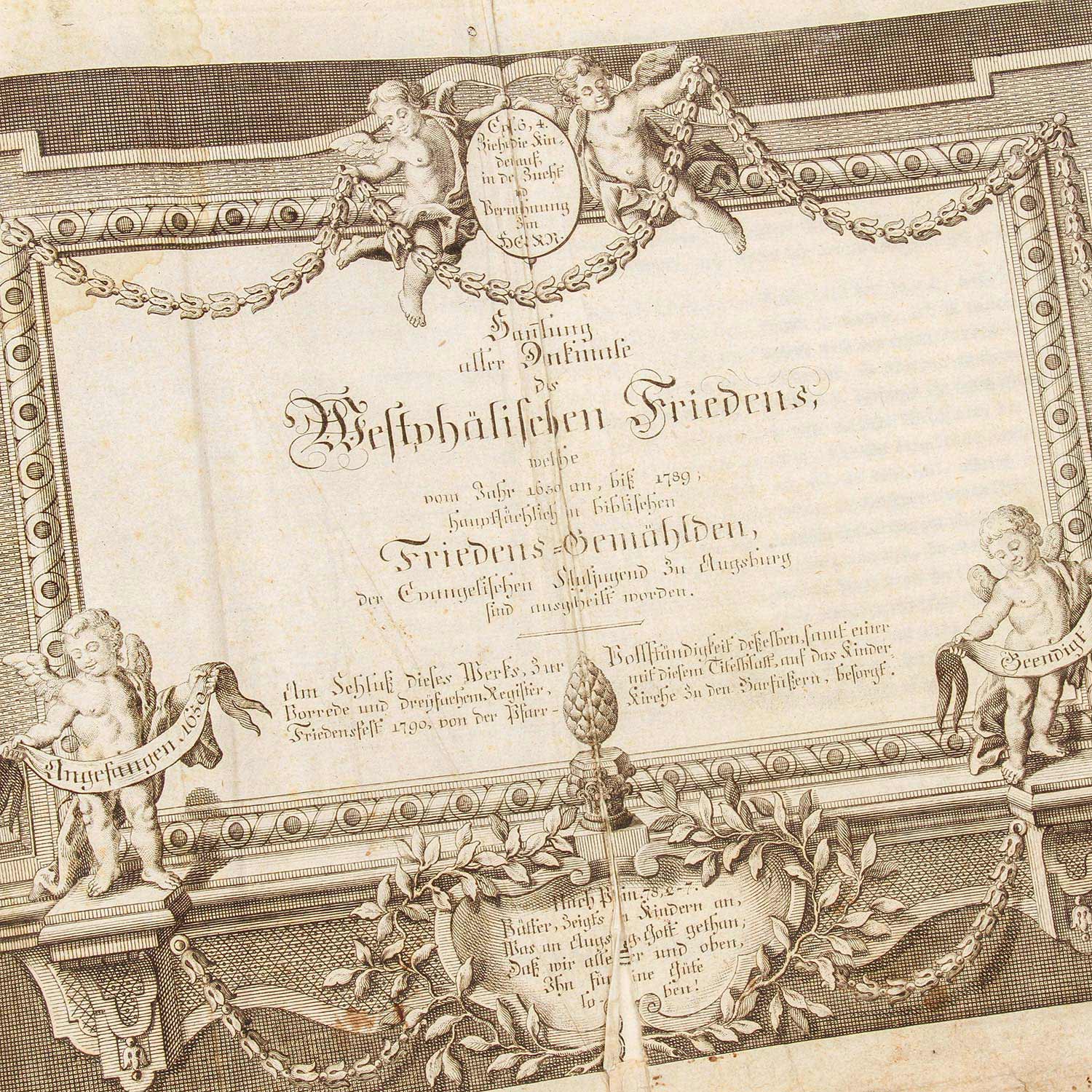 SAMMLUNG ALLER DENKMALE DES WESTPHÄLISCHEN FRIEDENS "Sammlung aller Denkmale des Westphälischen Friedens, welche vom Jahre 1650 an, biß 1789 buchstäeblich in biblischen Friedens-Gemählden, der Evangelischen Schuljugend zu Augsburg sind ausgetheilt worden", Sammlung von ca. 124 Einzelblättern, Kupferstichabbildung u. Textteil je zu einem Blatt montiert u. gebunden. Altersspuren, besch und teilw. geklebt. SEIT 1650 wurde jährlich das Kinderfriedensfest am 8. August in Augsburg gefeiert. An die Kinder wurde jeweils ein Flugblatt, das "Friedensgemälde" verteilt, das in der Regel aus einem großformatigen Kupferstich mit historischen, biblischen oder allegorischen Darstellungen sowie einem längeren Textteil, meist in Versform bestand. Die Sammlung enthält eine Inhaltsangabe über die einzelnen Darstellungen auf den Erinnerungsblättern, die Gemälde und z. T. Gedenkgedichte.
