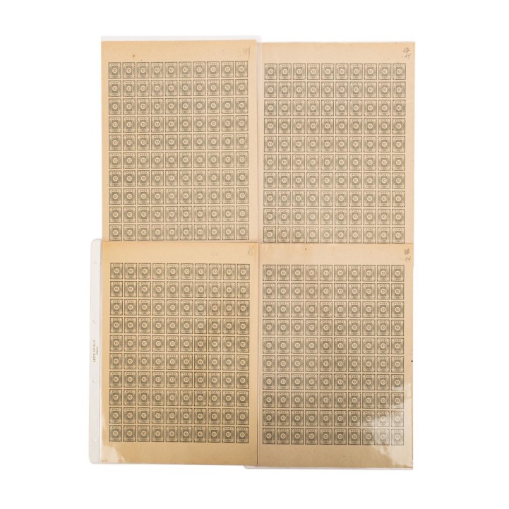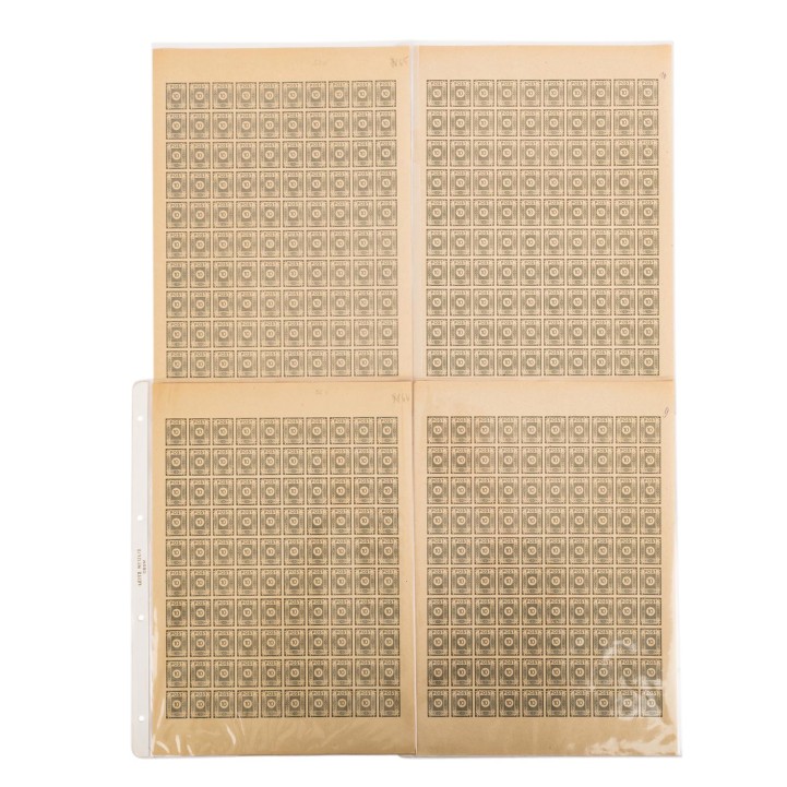 der Michel Nr. 52 postfrisch. Dabei 3 Bogen 52 avy und 5 Bogen 52 aux. Alle Bogen tragen Altsignatur Ing. Becker. Je 1 Bogen zur Nachprüfung bei Dr. Michael Jasch. Je 1 Bogen doppelt signiert. Mit Plattenfehlern. Seltenes Angebot mit einem Bestand von ganzen Bogen, Katalogwert ca. 6000 €.