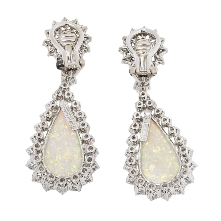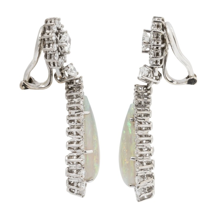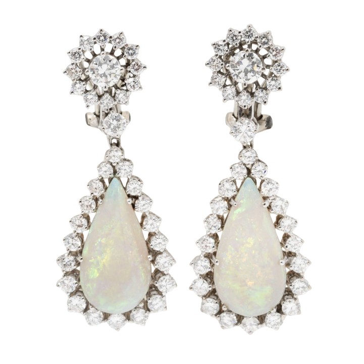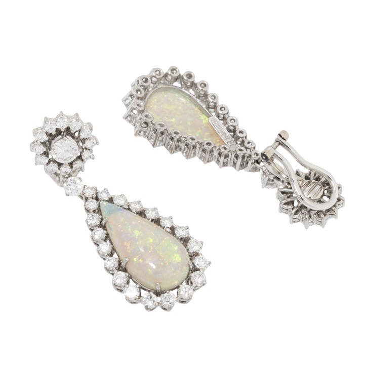 zus. ca. 3,4 ct, davon zentral je ca. 0,30 ct entouriert von je ca. 0,36 ct, Opale entouriert von je ca, 0,97 ct, FW-WEISS (F-H)/VS-SI, Opalcabochons im Tropfenschliff ca. 19,2 x 9,6 mm, sehr schönes Farbspiel, WG 18K, 12,6 g, L: ca. 41,2 mm, B: ca. 11,1 - 16,2 mm, um 1950/60, minimale Tragespuren, mit Herstellerpunze 'SCHILLING', Stuttgart, Handarbeit, 1 Stein best..
