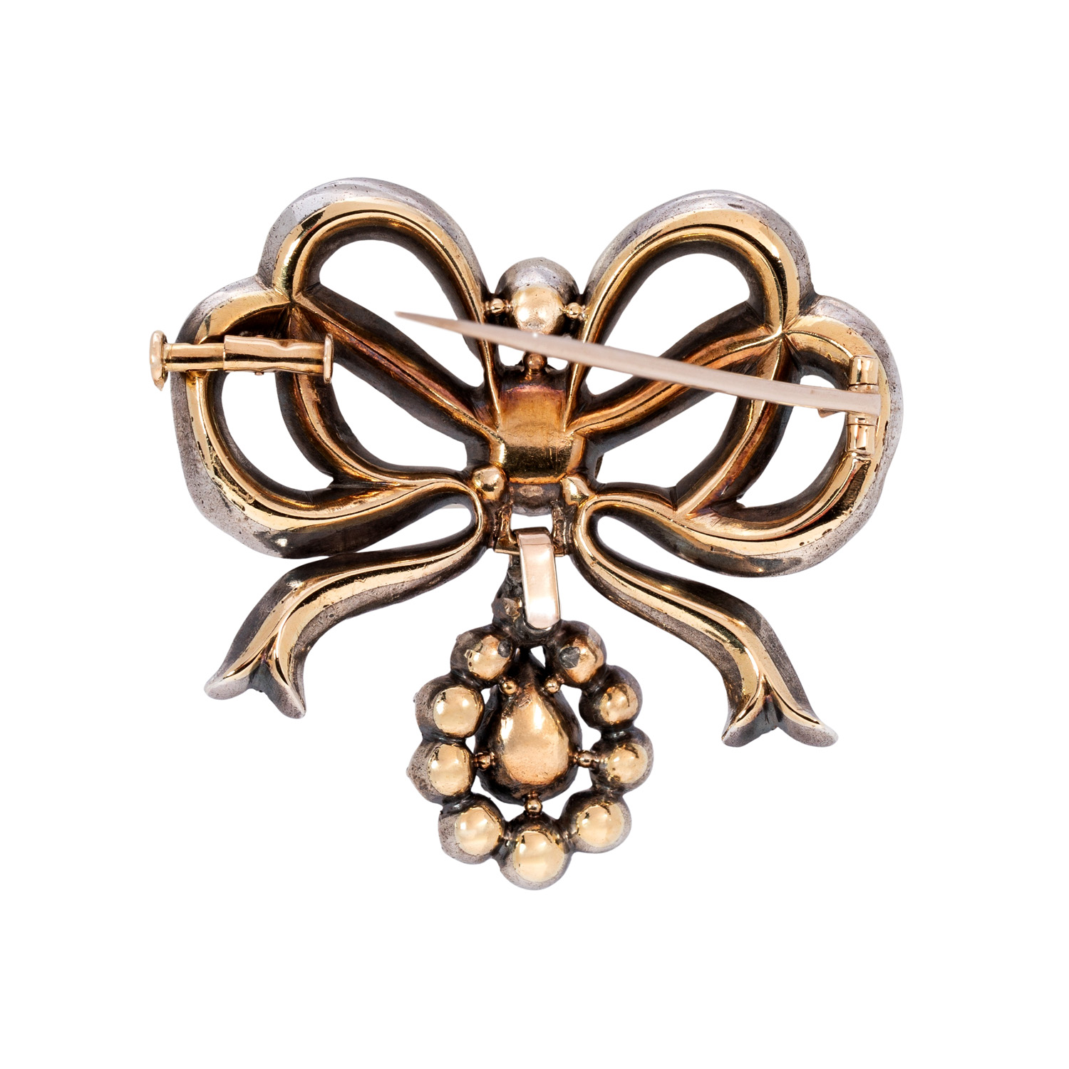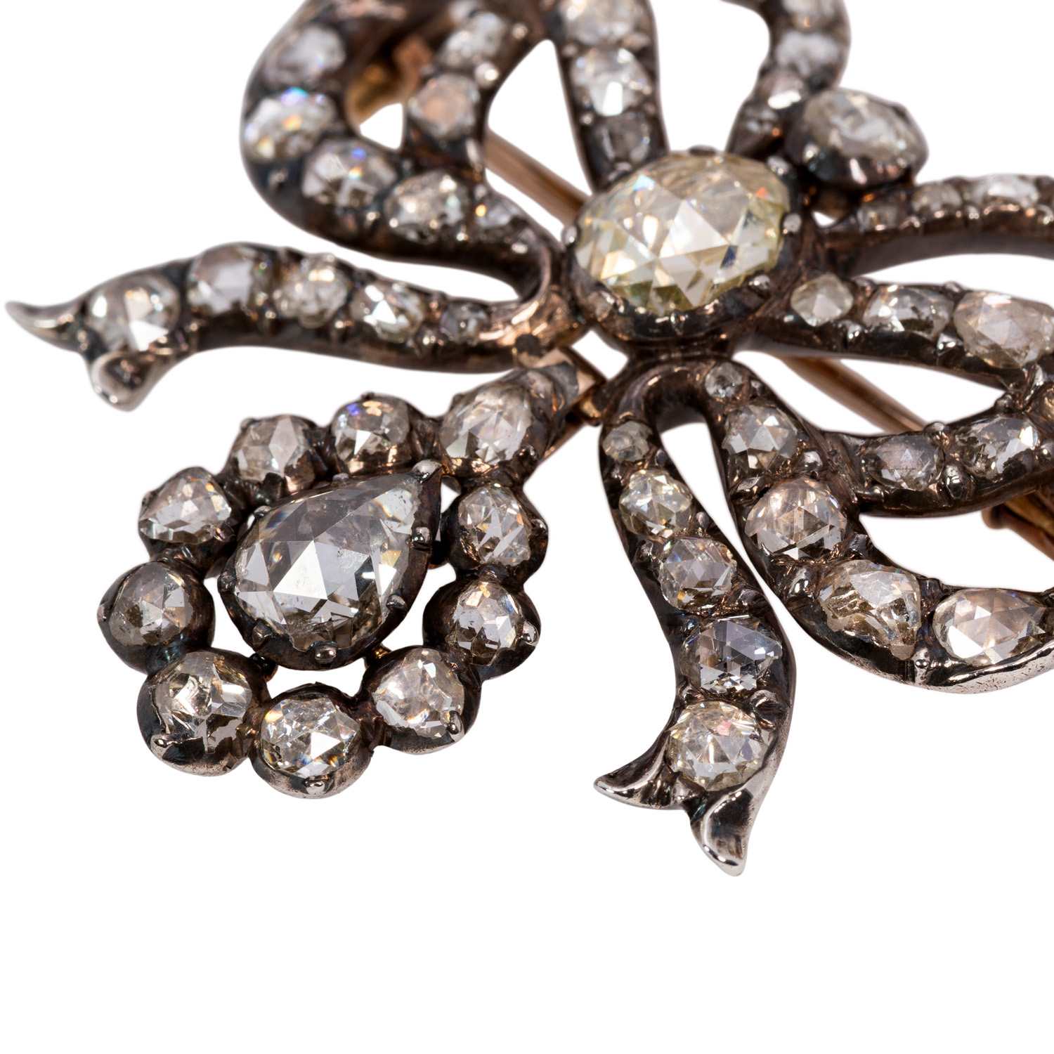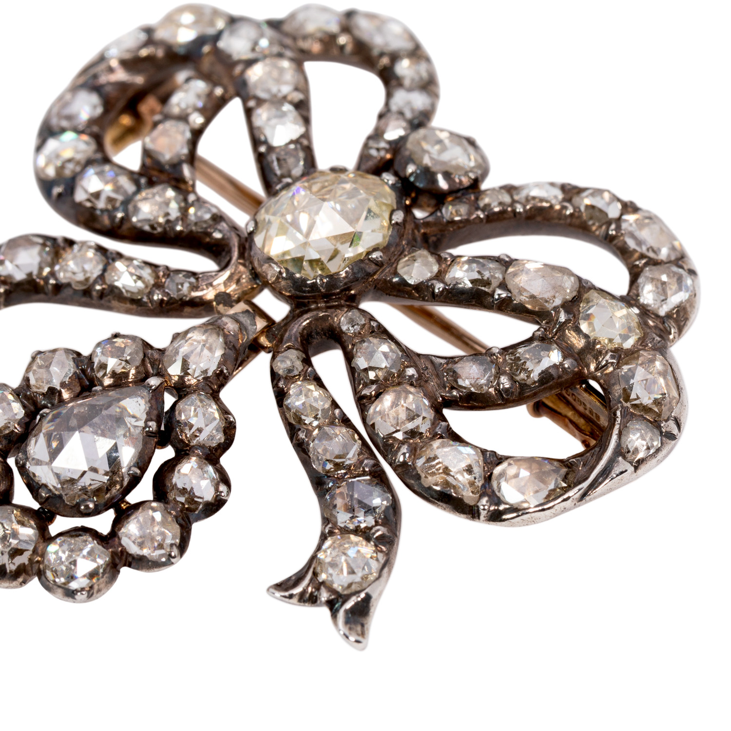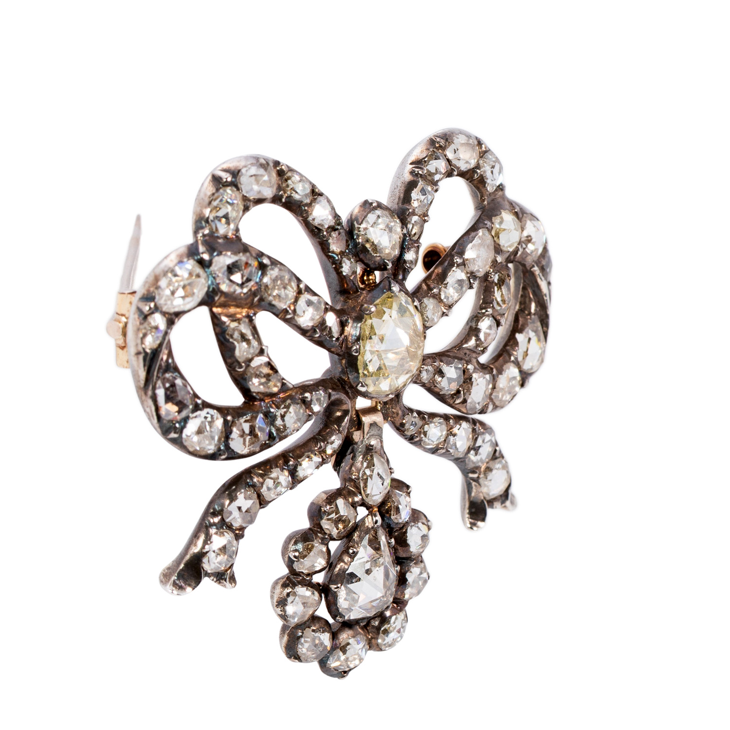 zus. ca. 6 ct in verschiedenen Formen, Größen und Qualitäten, ca. GW (K-L)/P1-2, Silber, Unterseite GG ca. 12K, 17,8 g, 4x4 cm, schön geschwungene Schleifenform mit tropfenförmiger Einhängung, Ende 18./19. Jh., altersgem. sehr schöner Erhalt, mit Juwelierszertifikat (E. von Hofen/Stuttgart).