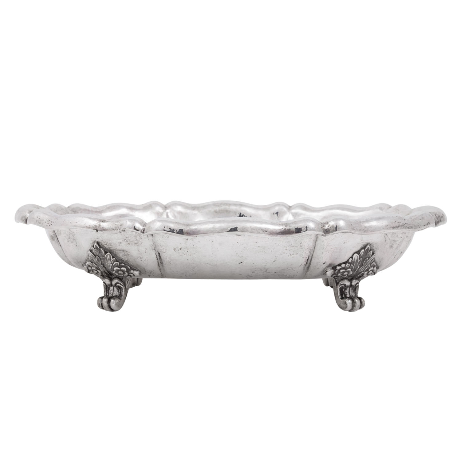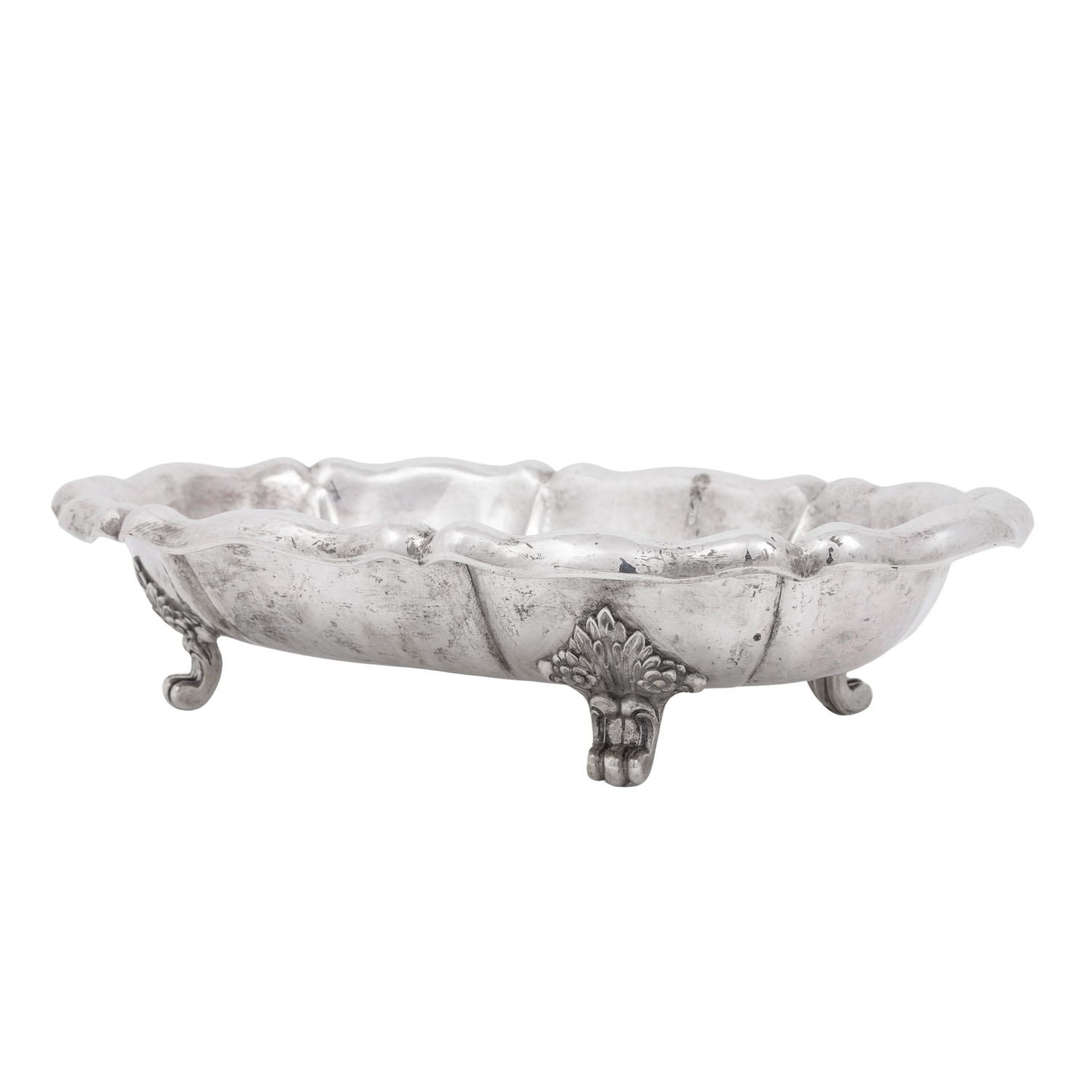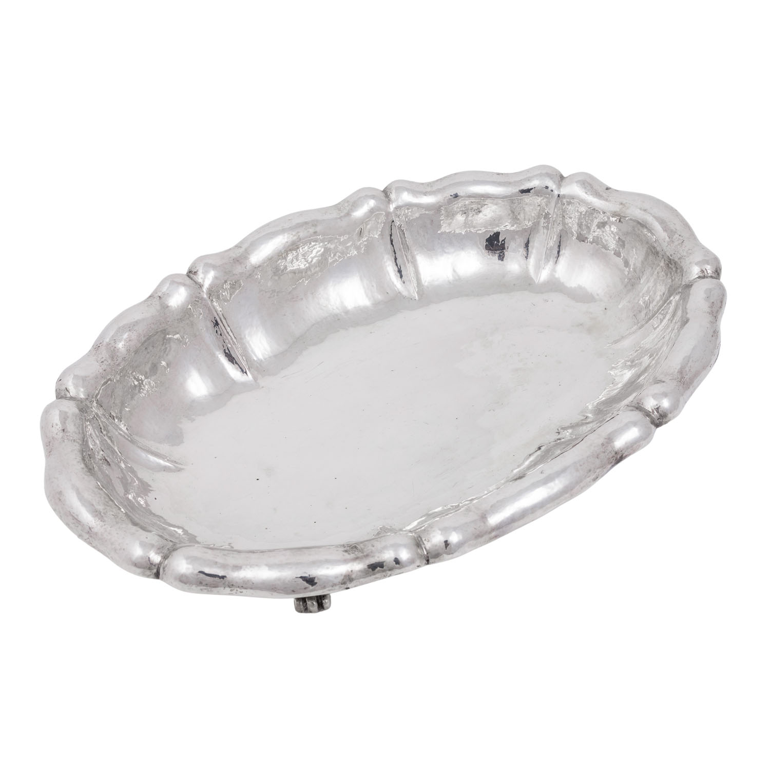auf vier Tatzenfüßen mit floralen Akzenten, ovale Form mit blütenförmiger Wandung und nach außen gewölbter Randung, glatt gearbeiteter Spiegel, Wandung mit Hammerschlagdekor, LxBxH: ca. 43x28,5x9,5 cm, Marken: Halbmond, Krone, 800, MZ, Gewicht ca. 1163 g. Alters- und Grbrauchsspuren. Tlw, Kratzspuren. Minimal gedellt (Spiegel).