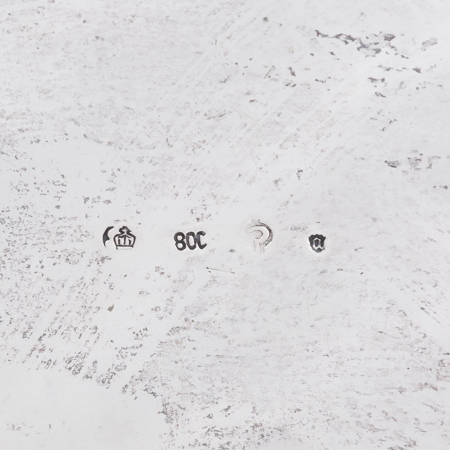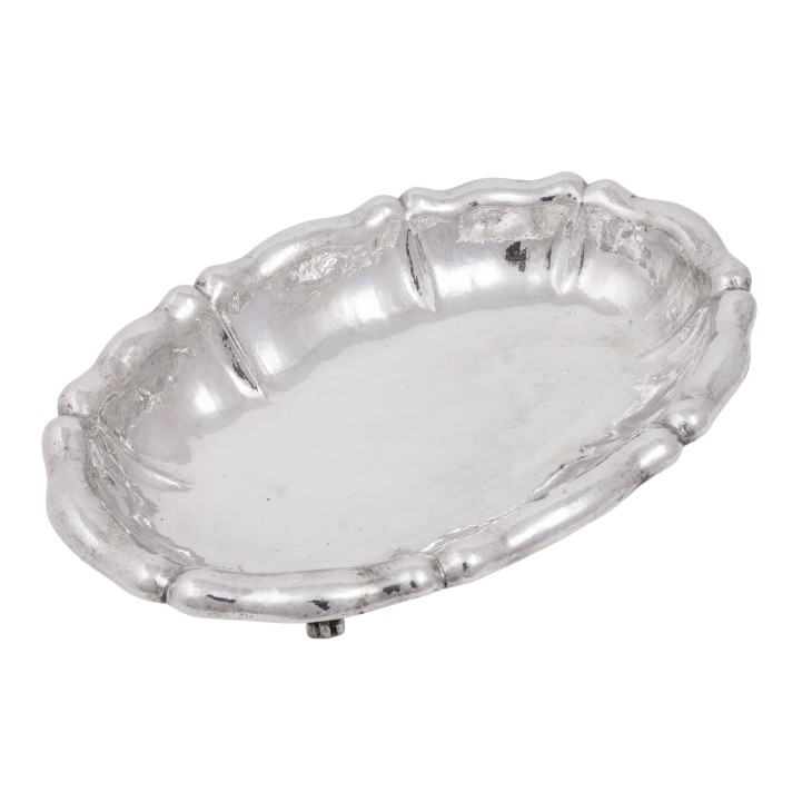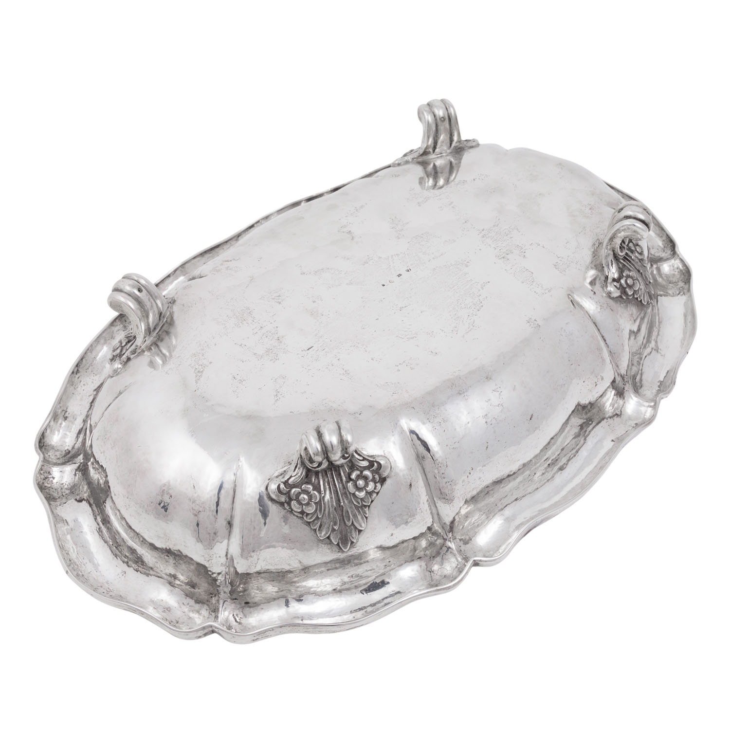 auf vier Tatzenfüßen mit floralen Akzenten, ovale Form mit blütenförmiger Wandung und nach außen gewölbter Randung, glatt gearbeiteter Spiegel, Wandung mit Hammerschlagdekor, LxBxH: ca. 43x28,5x9,5 cm, Marken: Halbmond, Krone, 800, MZ, Gewicht ca. 1163 g. Alters- und Grbrauchsspuren. Tlw, Kratzspuren. Minimal gedellt (Spiegel).