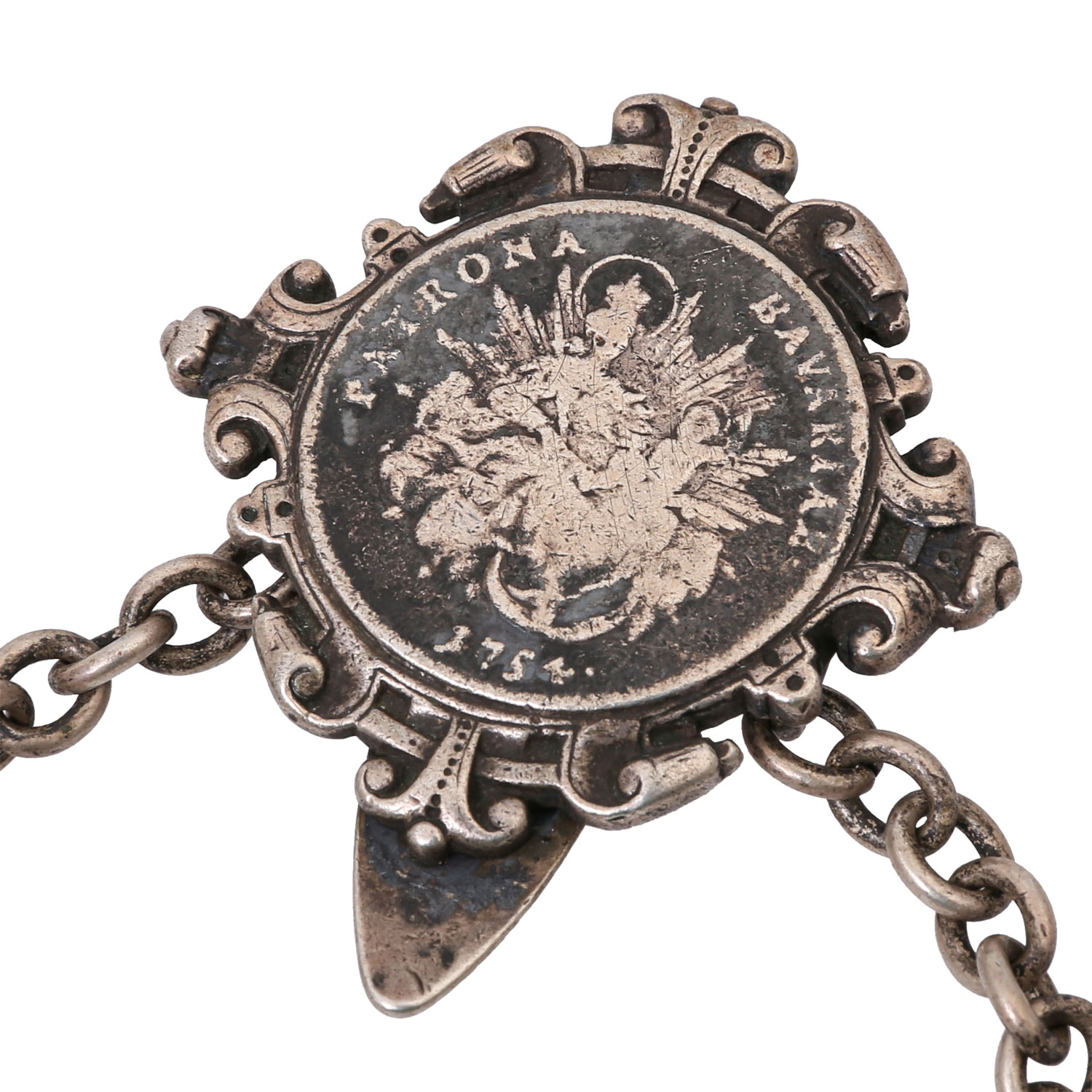 Bayern - 1/2 Darstellung Patronatstaler 1754, mit Madonnenmotiv, Oberfläche stark beansprucht, Silber 900, 81 g, L: ca. 18 cm, 2. Hälfte 19. Jh., deutl. Tragespuren.