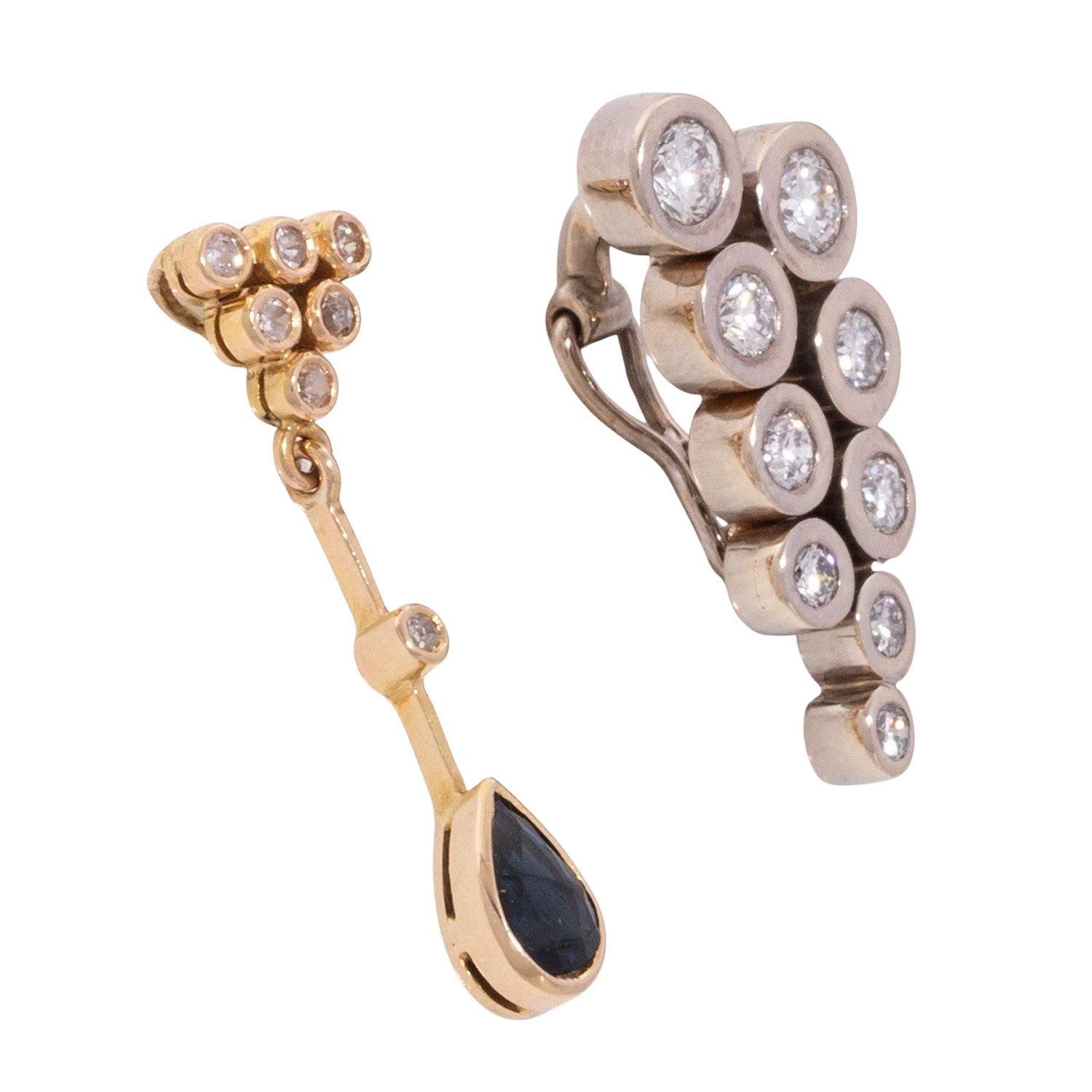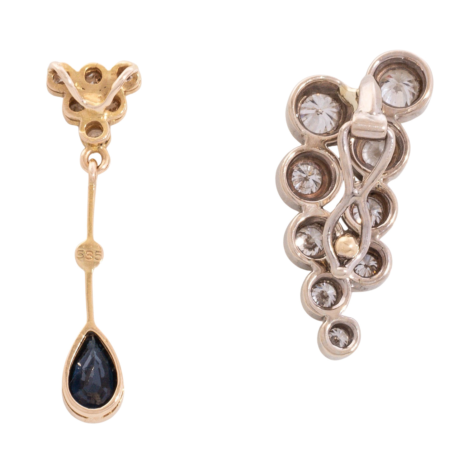 bestehend aus 1 Clipanhänger mit 9 Brillanten von zus. ca. 0,50 ct, FW-WEISS (G-H)/VS-SI, WG 18K, 3,0 g, ca. 22 x 10 mm, 20./21. Jh., leichte Tragespuren, 1 Brillant mit kleiner Kerbe und 1 Anhänger mit Saphirtropfen, ca. 0,35 ct und 7 fac. Diamanten von zus. ca. 0,10 ct, GG 14K, 0,8 g, ca. 25 x 7 mm, 20. Jh., mäßige Tragepsuren, Saphir mit kleinem offenem Risschen.
