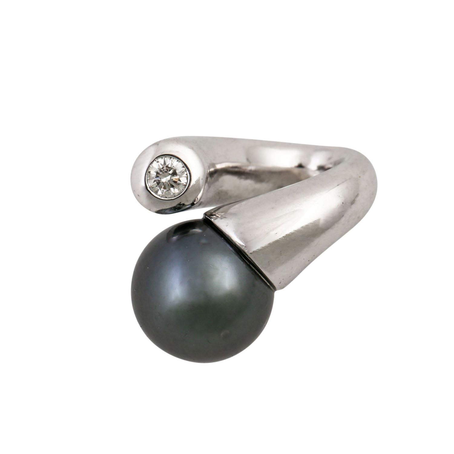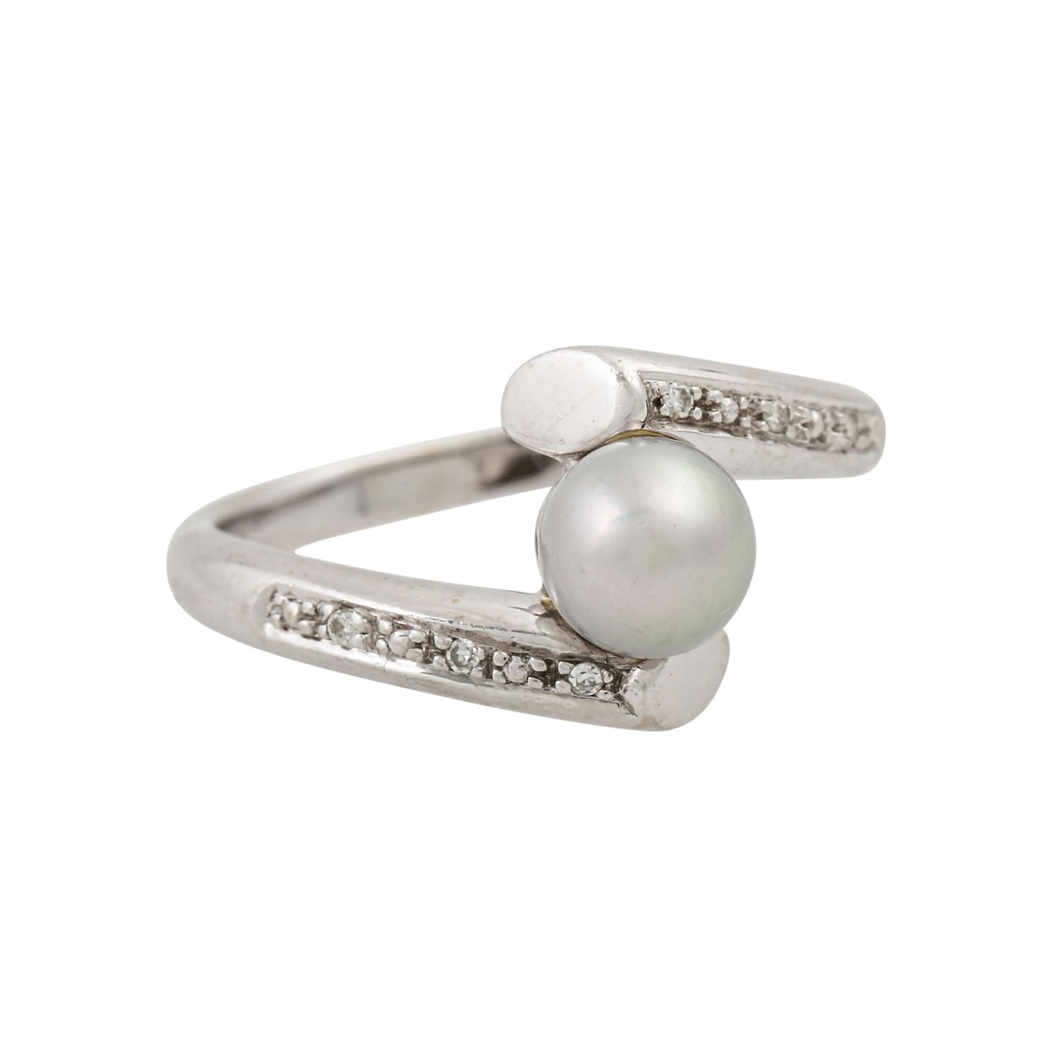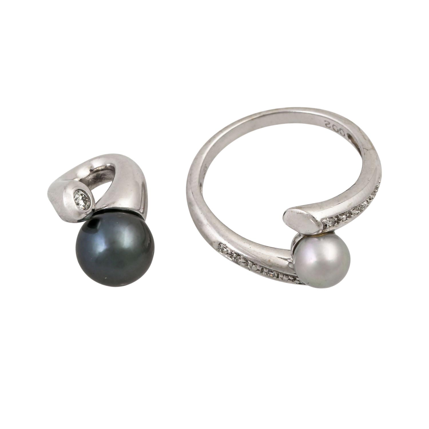 Schmuckkonvolut 2- tlg mit Zuchtperle, Anhänger mit grauer Zuchtperle ca. 8 mm u. 1 Brillant ca. 0,05 ct mittlerer Farbe u. Reinheit WG 14K und Ring mit hellgrauer Zuchtperle ca. 6 mm, Achtkantdiamanten zus. ca. 0,03 ct, mittlere Farbe u. Reinheit. WG 14K. RW: 55, 20./ 21. Jh., leichte Tagespuren.