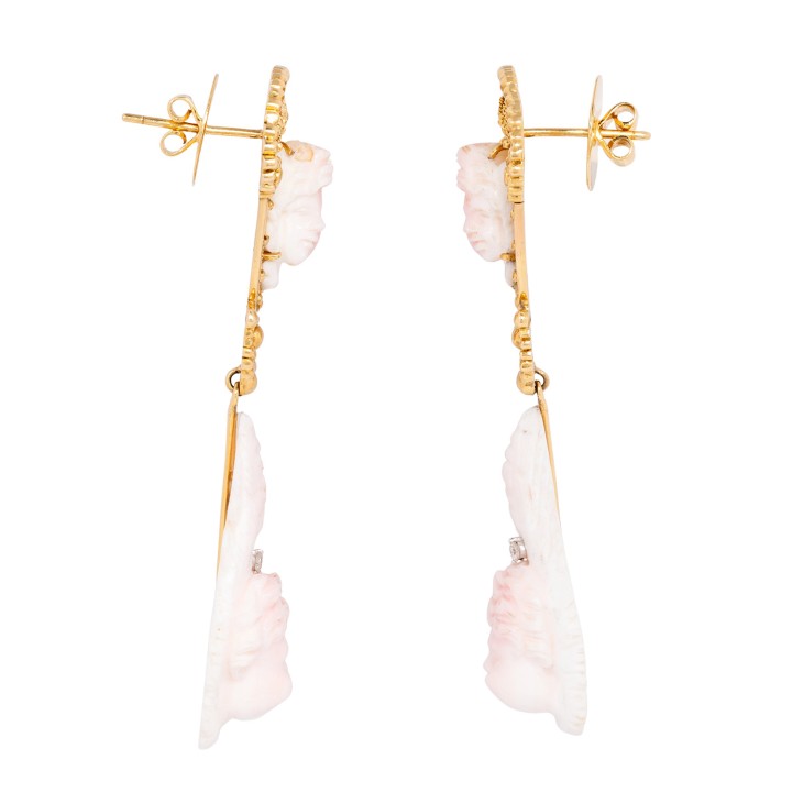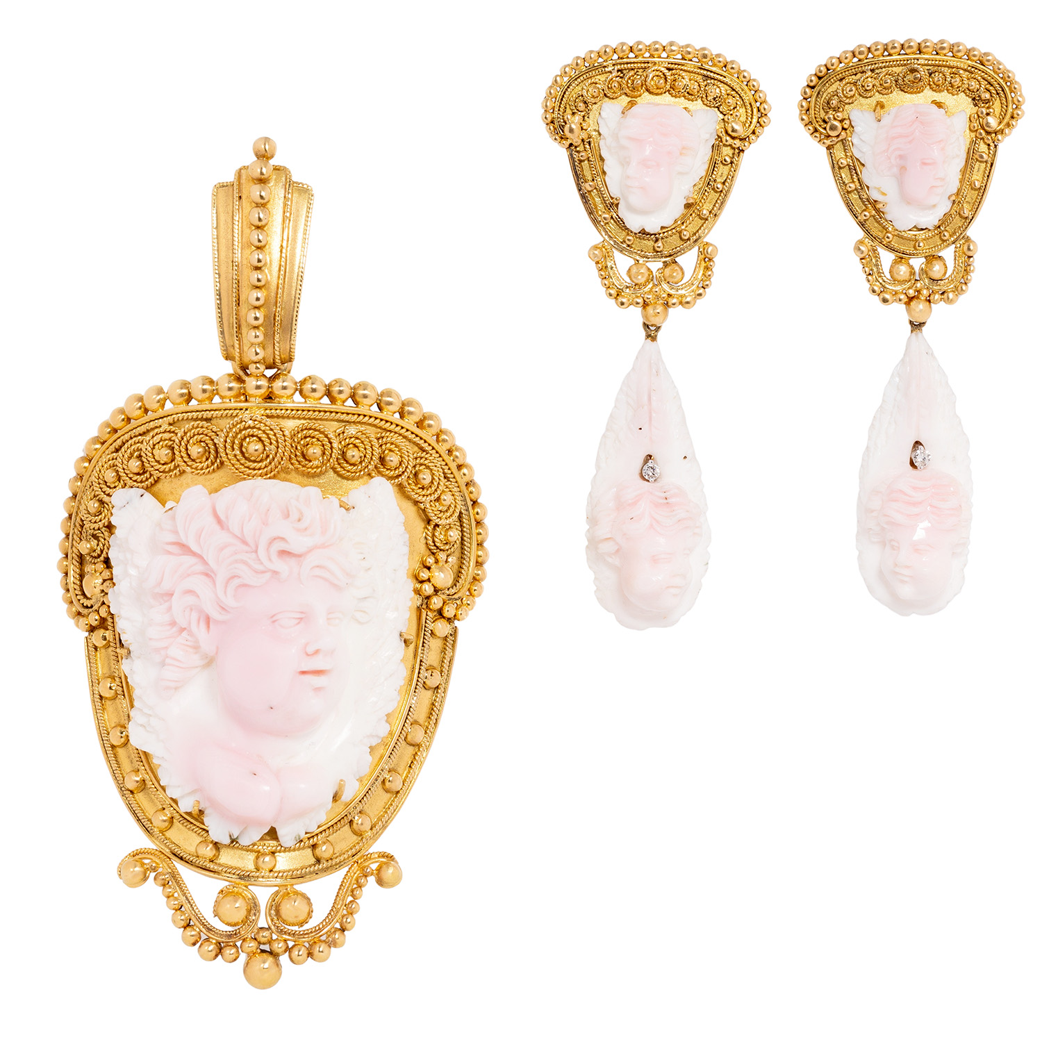 bestehend aus opulentem Clipanhänger/Brosche und passenden Ohrgehängen, hoch ausgearbeitete Halbreliefs in weiß-rosa Farbverlauf, abhängende Kameen mit 2 kleinen Brillanten, Kameen aus älterem Zusammenhang, eingearbeitet in Rahmen aus GG 18K, 78,5 g verziert mit Granalien und Kordeldrahtmotiven, Ohrhänger L: 7 cm, Anhänger 10x5x2,8 cm, Clip-Schlaufe zum Aushängen und Öse zum Wegklappen, 20. Jh., leichte Tragespuren, mit Kaufbeleg über 9.800 € von 2014. (14)
