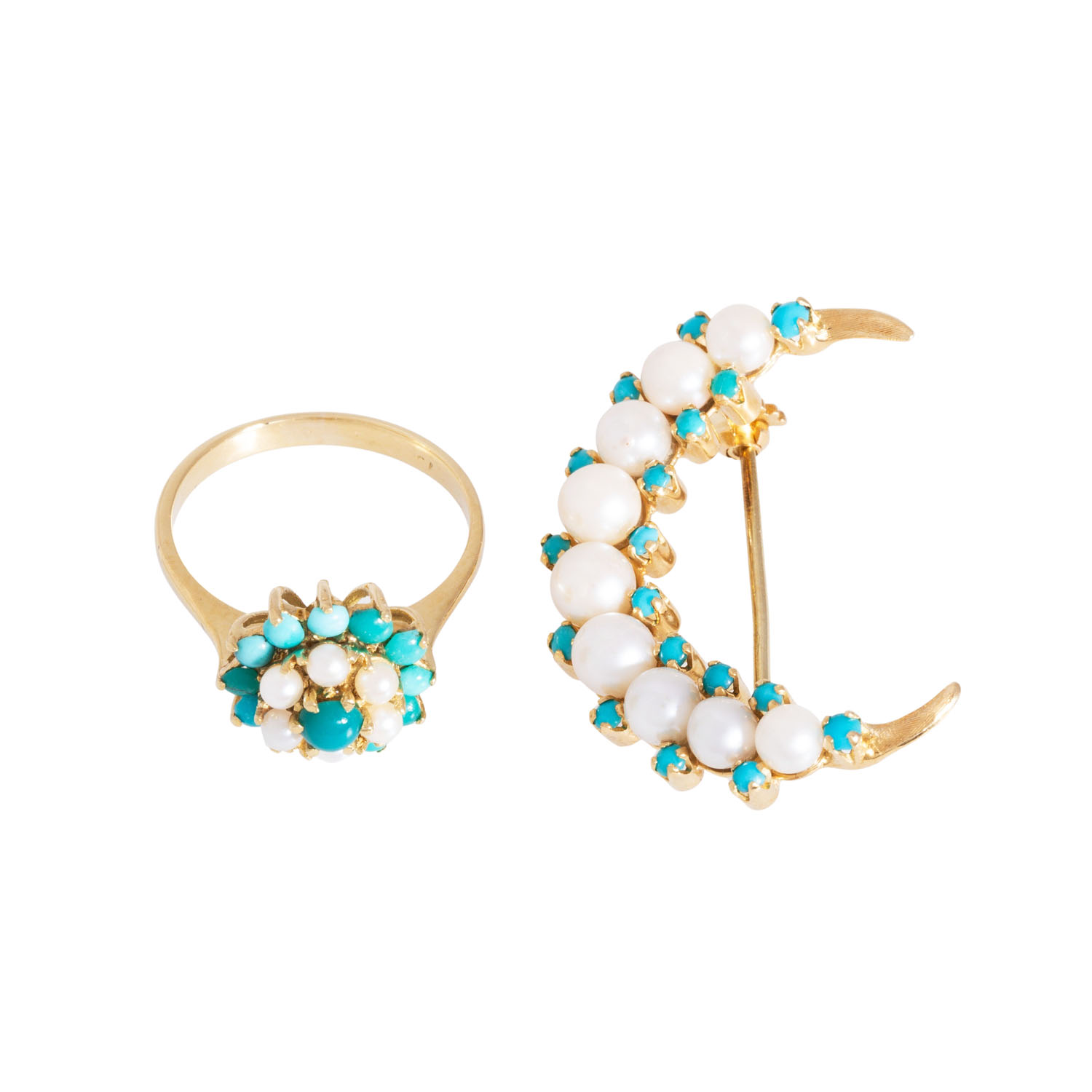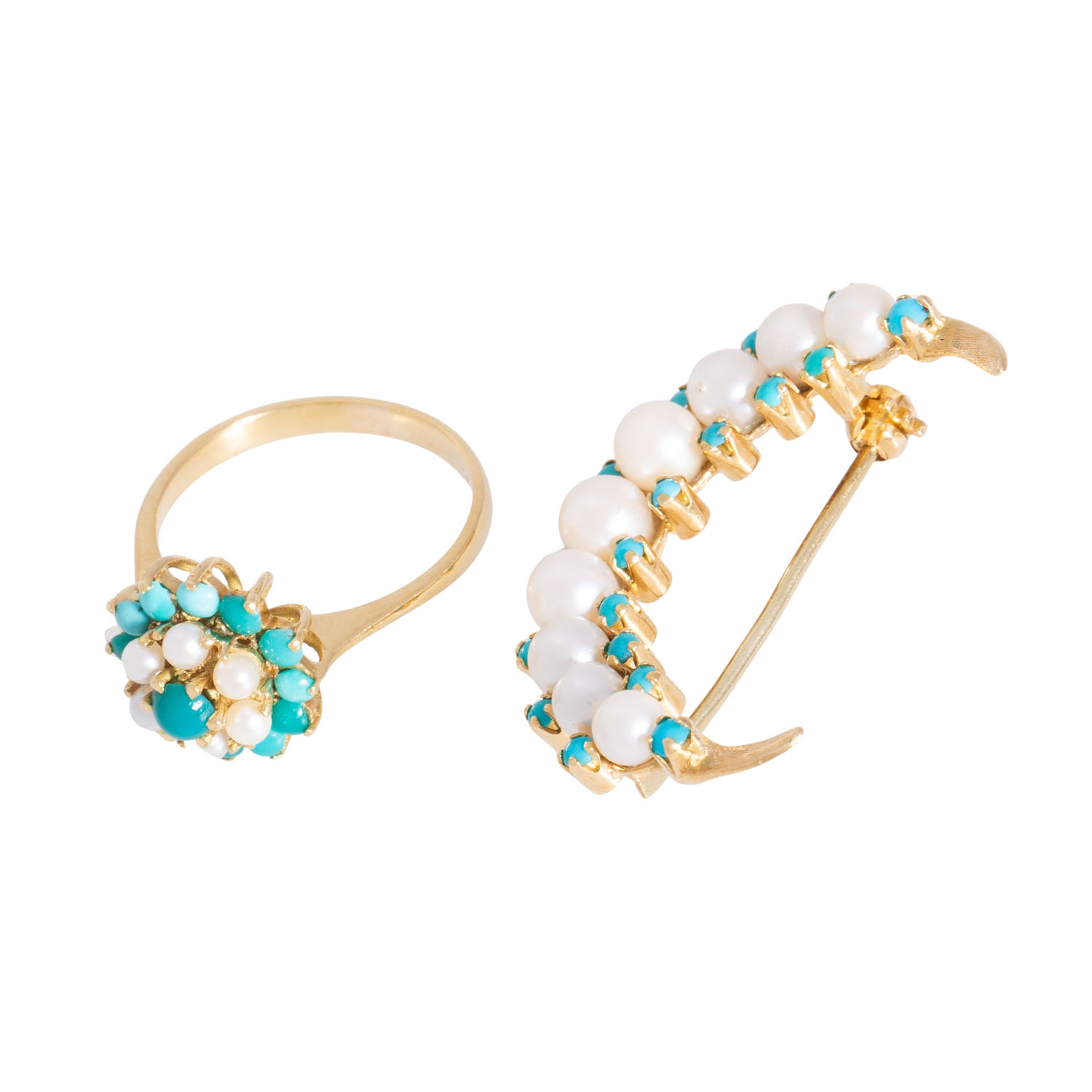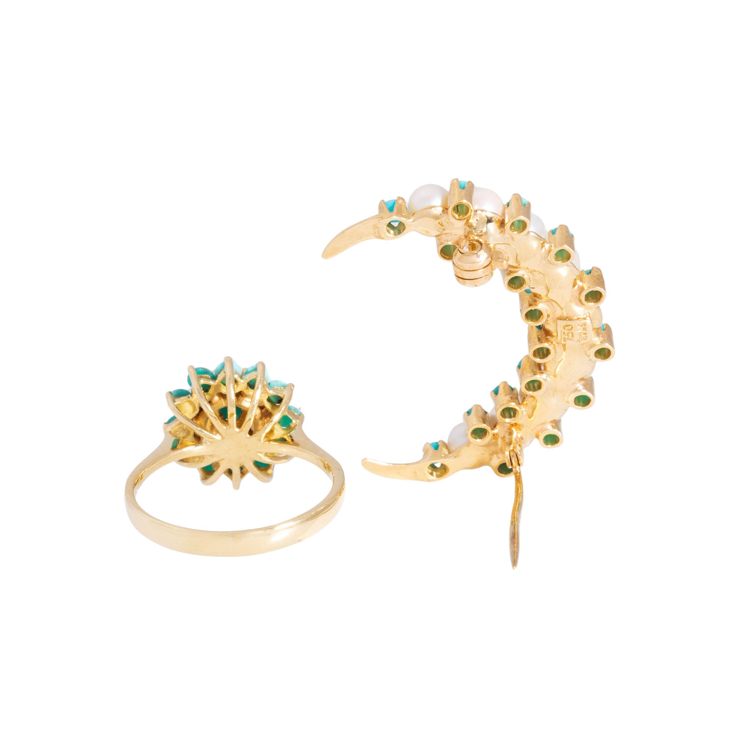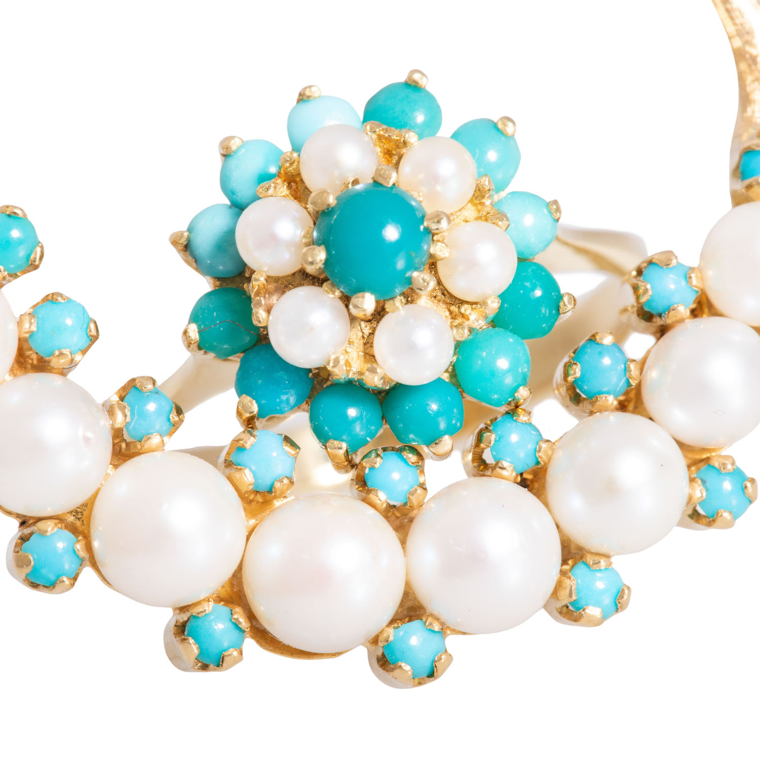 mit Türkisen und Zuchtperlen, GG 18K, 9 g, RW: 53, 2. H. 20. Jh., leichte Tragespuren, Türkise tlw. etwas verfärbt.
