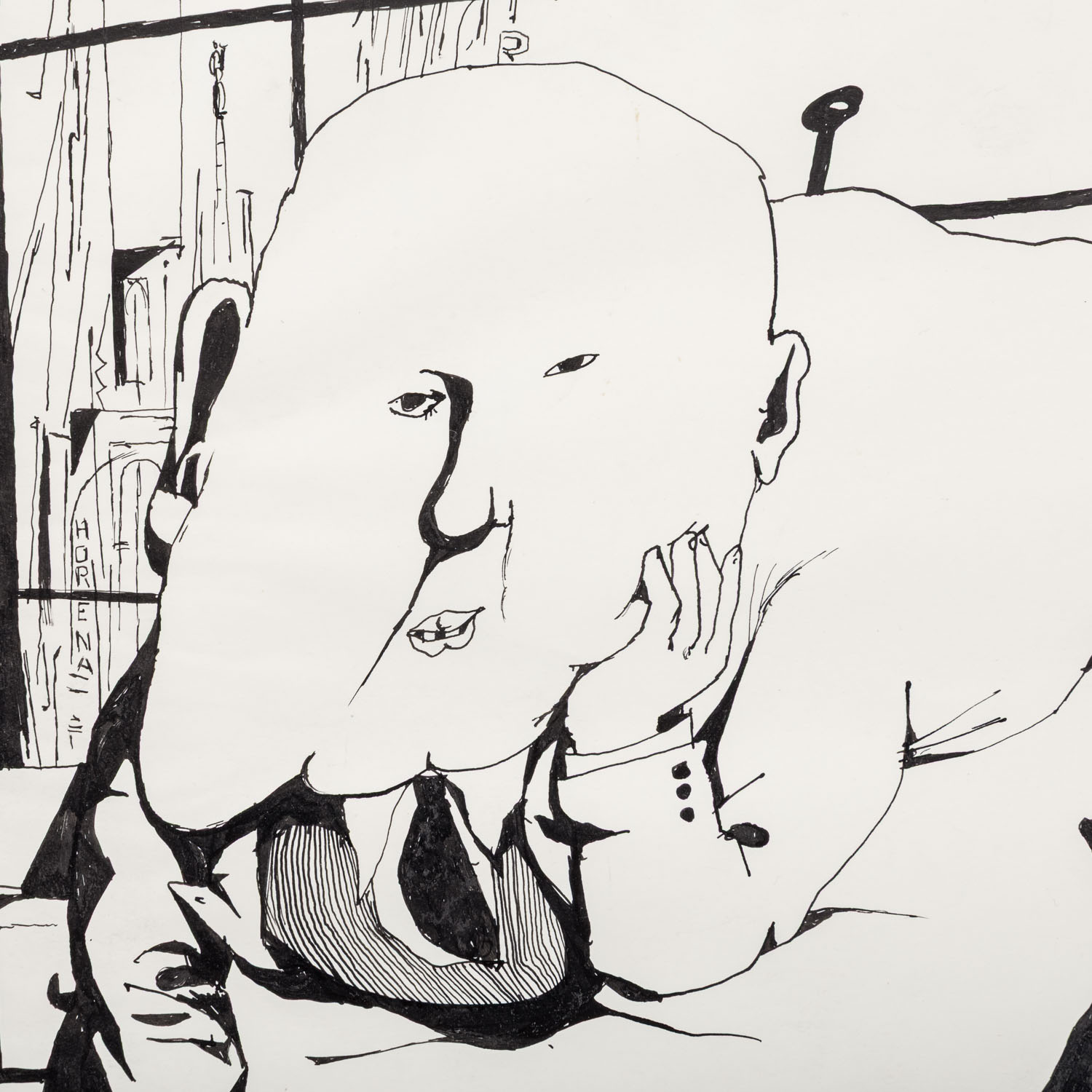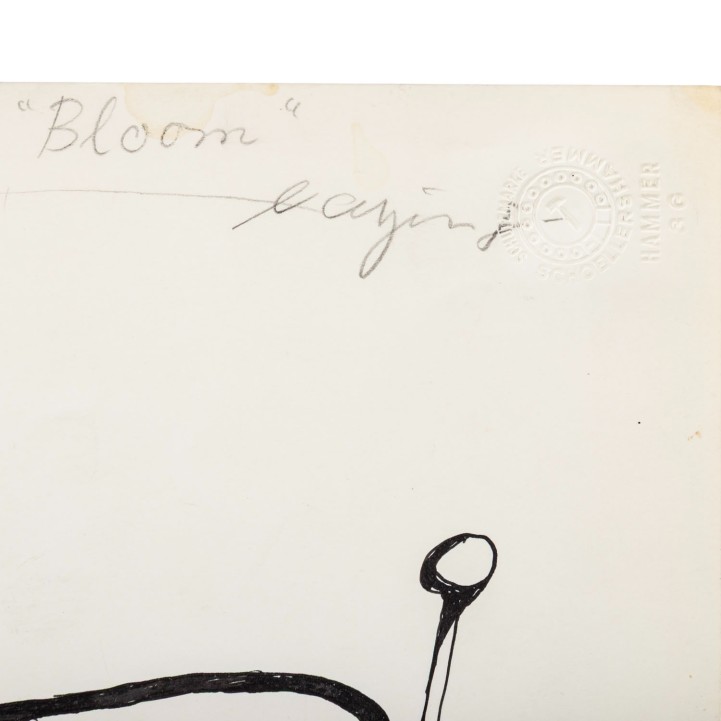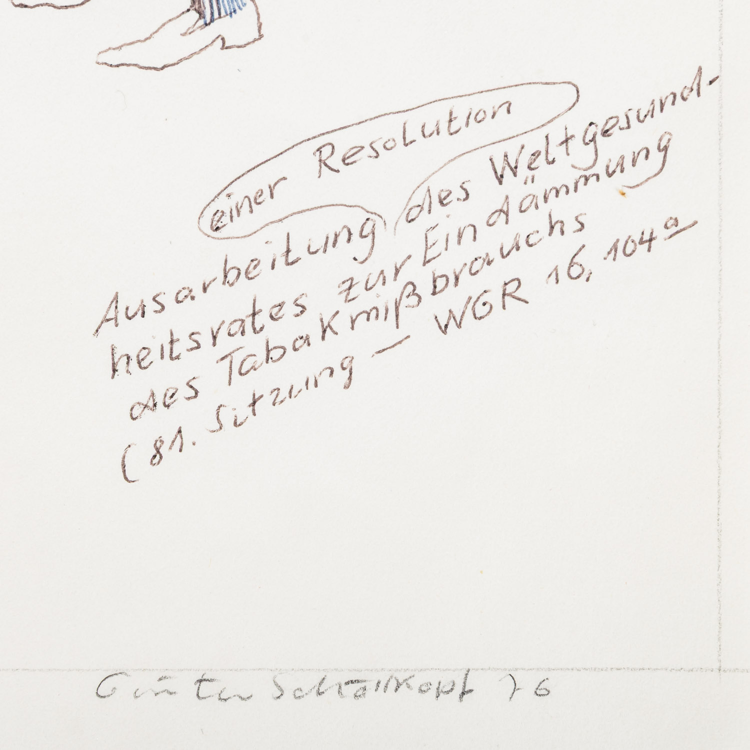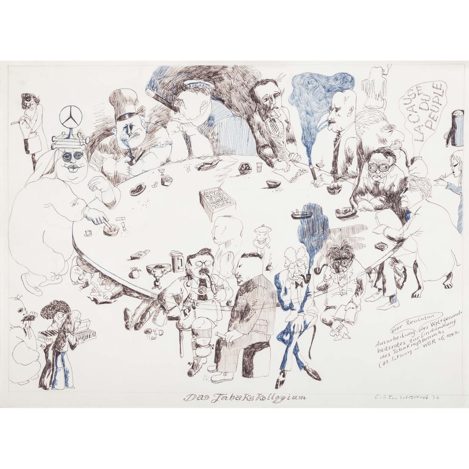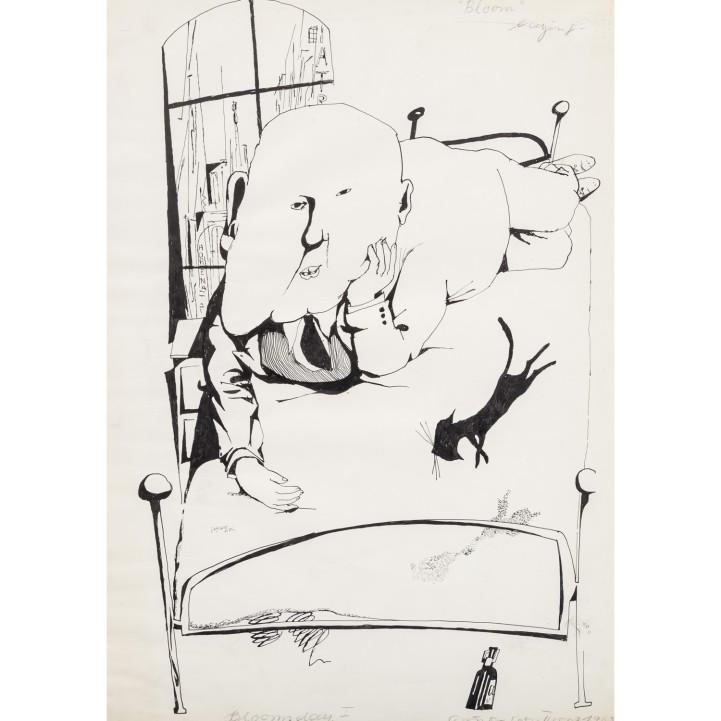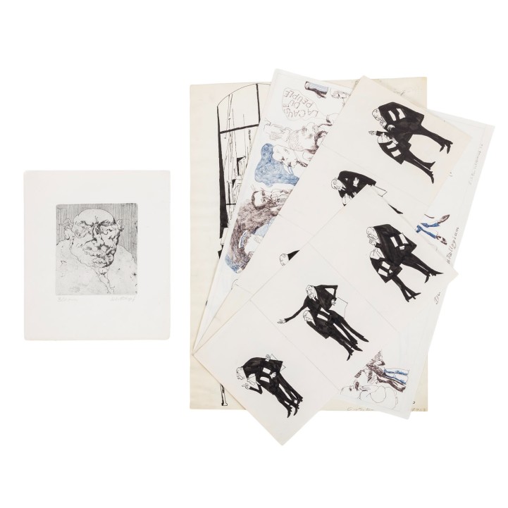 1.) 'Das Tabakskollegium', Mischtechnik/Papier, signiert und datiert (19)76, HxB: ca. 30x40 cm; 2.) 2 Blätter mit Szenen einer Unterhaltung zweier Herren, Tusche, unsigniert, HxB: 17x32 cm und 17x43 cm; 3.) 'Bloomsday I', Tuschzeichnung, betitelt, signiert und datiert (19)63, HxB: ca. 43x31 cm; 4.) 'Bloom', Aquatintaradierung, von Hand betitelt und signiert, HxB: Platte ca. 13x12 cm, Blatt ca. 23x20 cm. Je Alters- und Knickspuren, leicht gebräunt und part. fleckig.