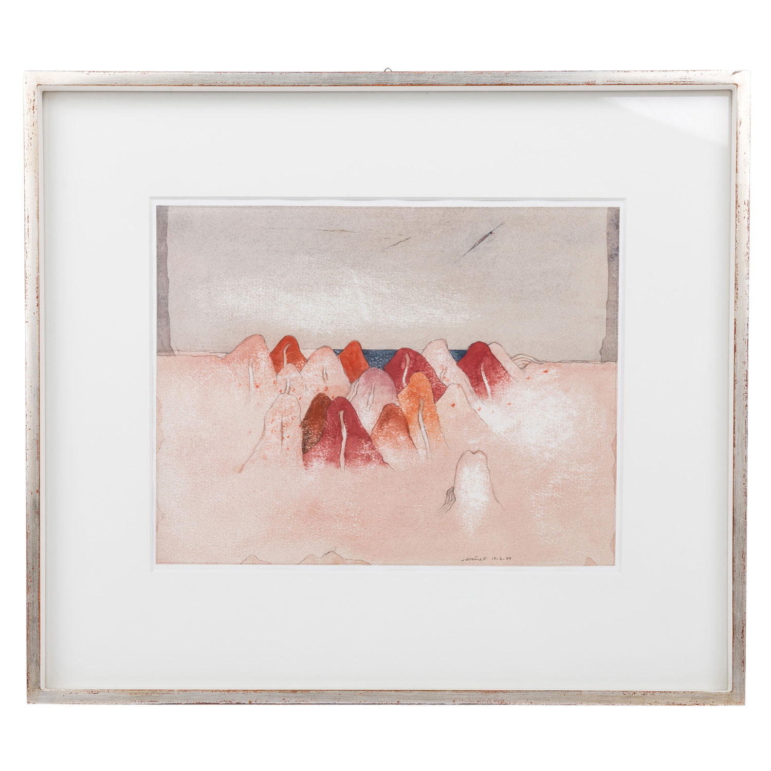 u.re. signiert und datiert, Aquarell über Bleistift/ Bütten, HxB: Passepartoutausschnitt ca. 25x32 cm (42x49 cm mit Rahmen). Minim. gewellt zum äußeren Rand hin. Im Passepartout hinter Glas gerahmt. VERSO Etikett mit Bezeichnung.