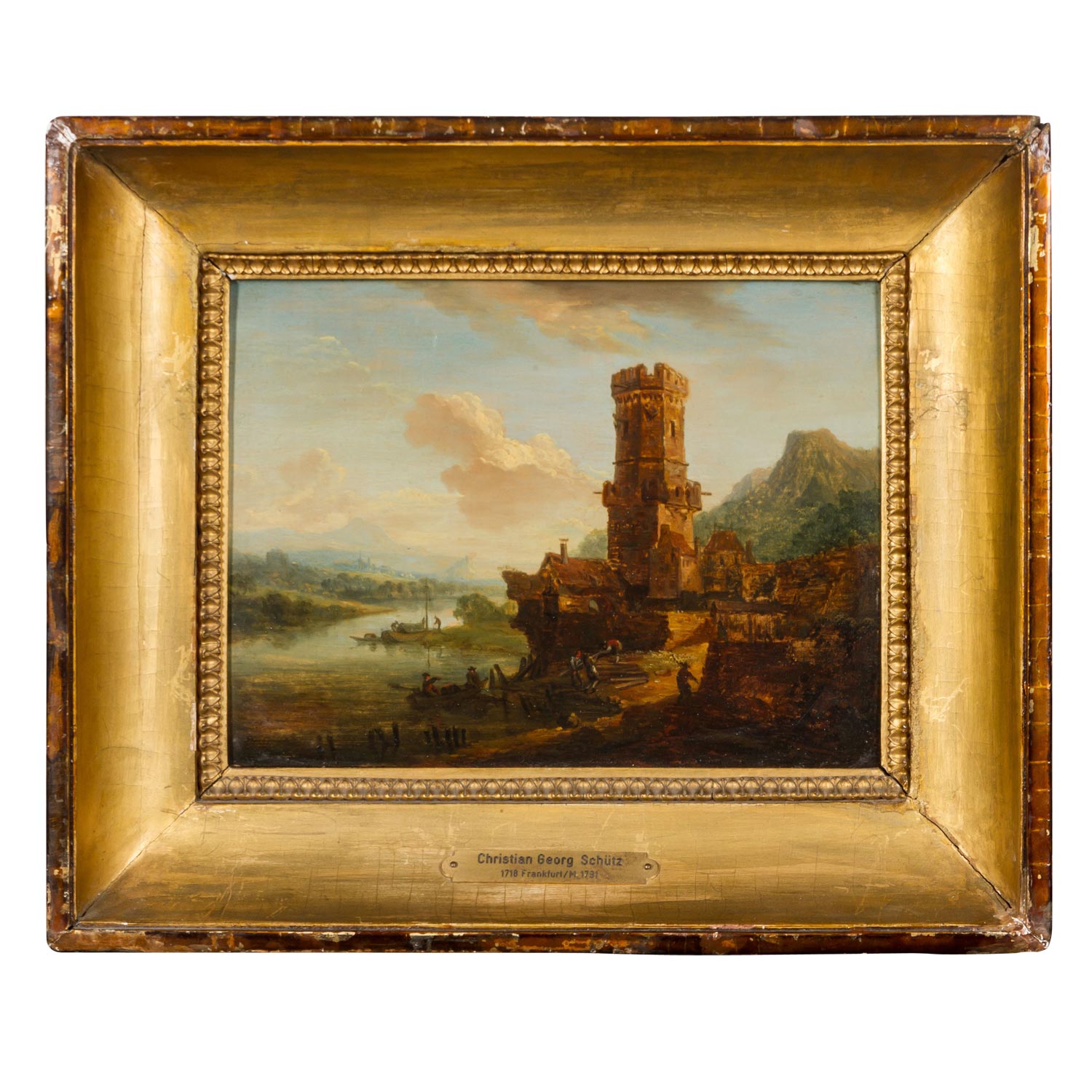 SCHÜTZ, Christian Georg, ATTRIBUIERT (C.G.S.: 1718 - 1791), 'Befestigtes Städtchen an einem Flusslauf', 18. Jh.,