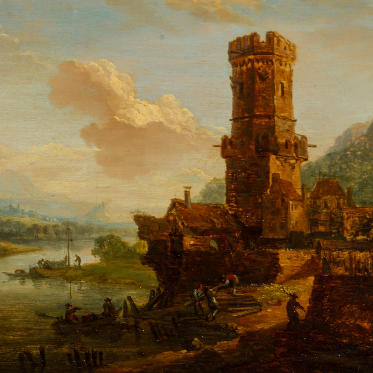 NIEDERLÄNDISCHER MALER 17./18. Jh., 'Wanderer und Jäger in Flusslandschaft',
