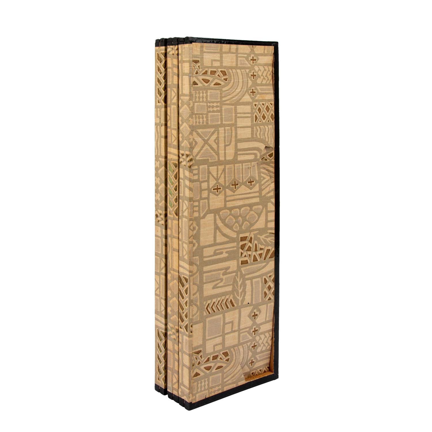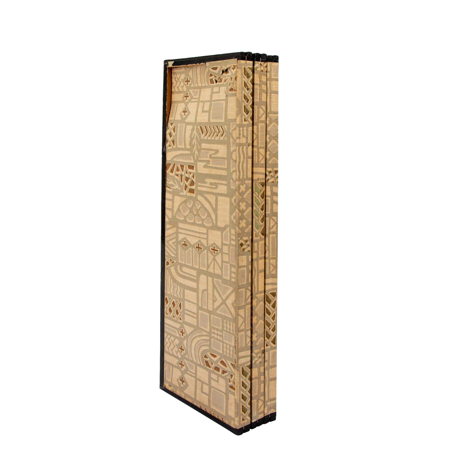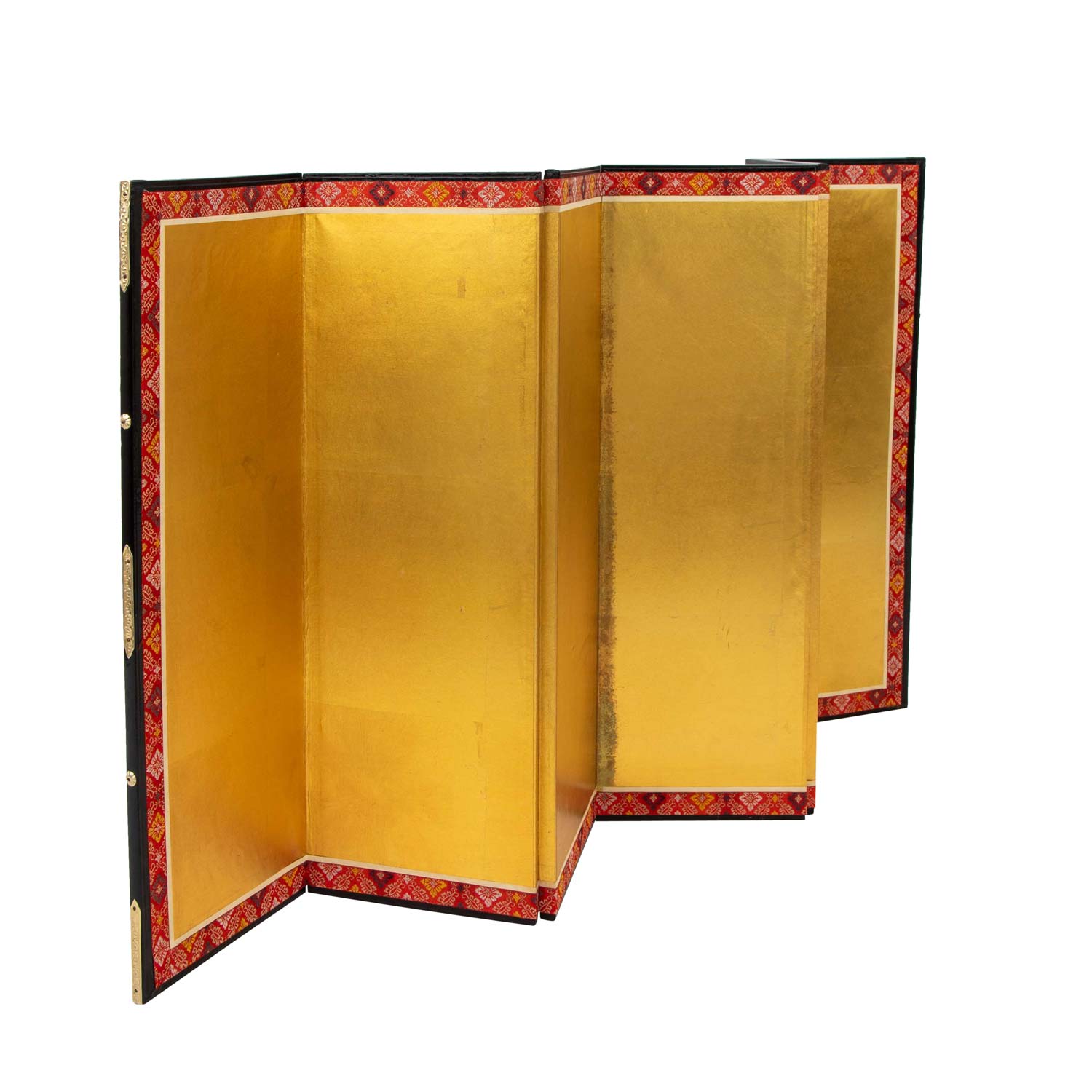 innen uni goldfarben, je Paneel 44,5x14,5 cm, Faltschirm gesamt 44,5x59 cm. Gebrauchsspuren, besch., Papier auf der Rückseite tlw. eingerissen.