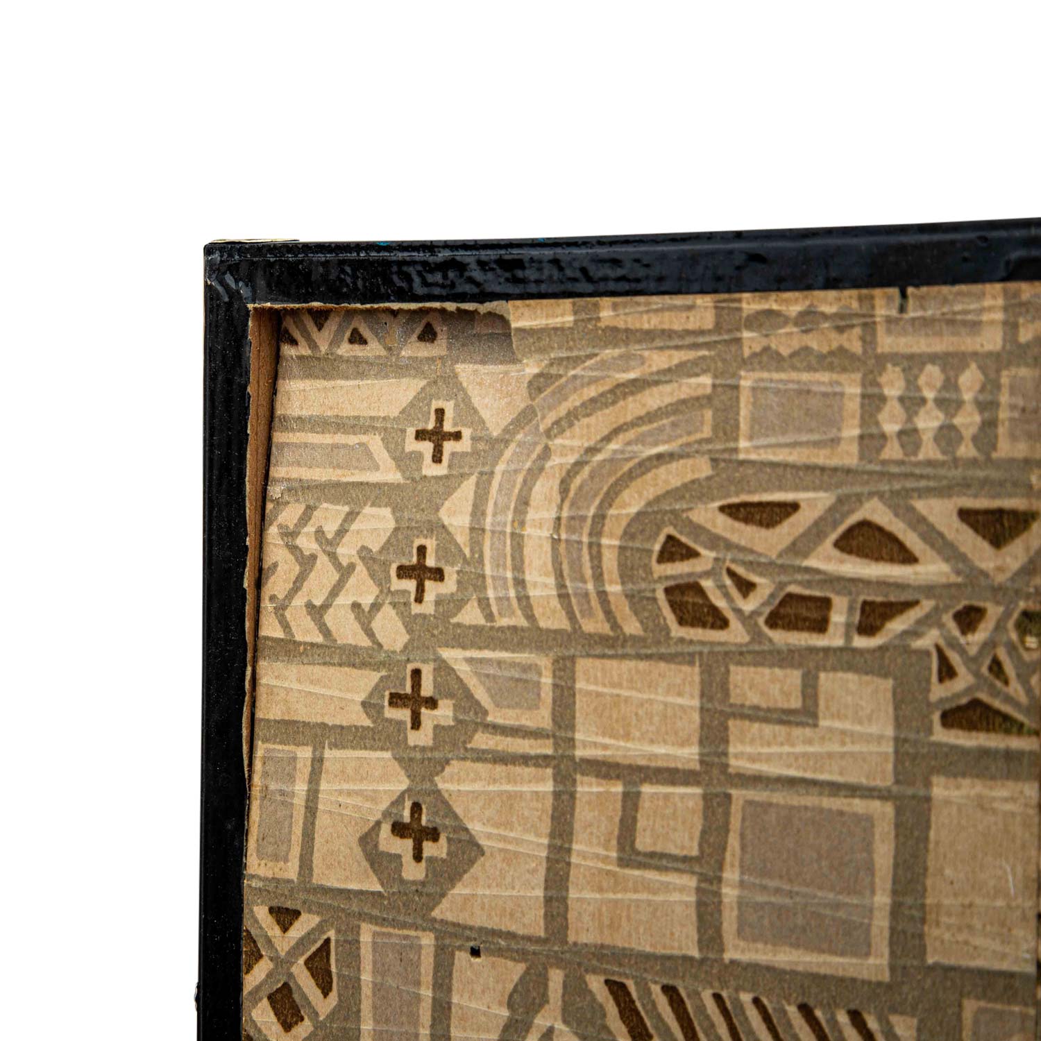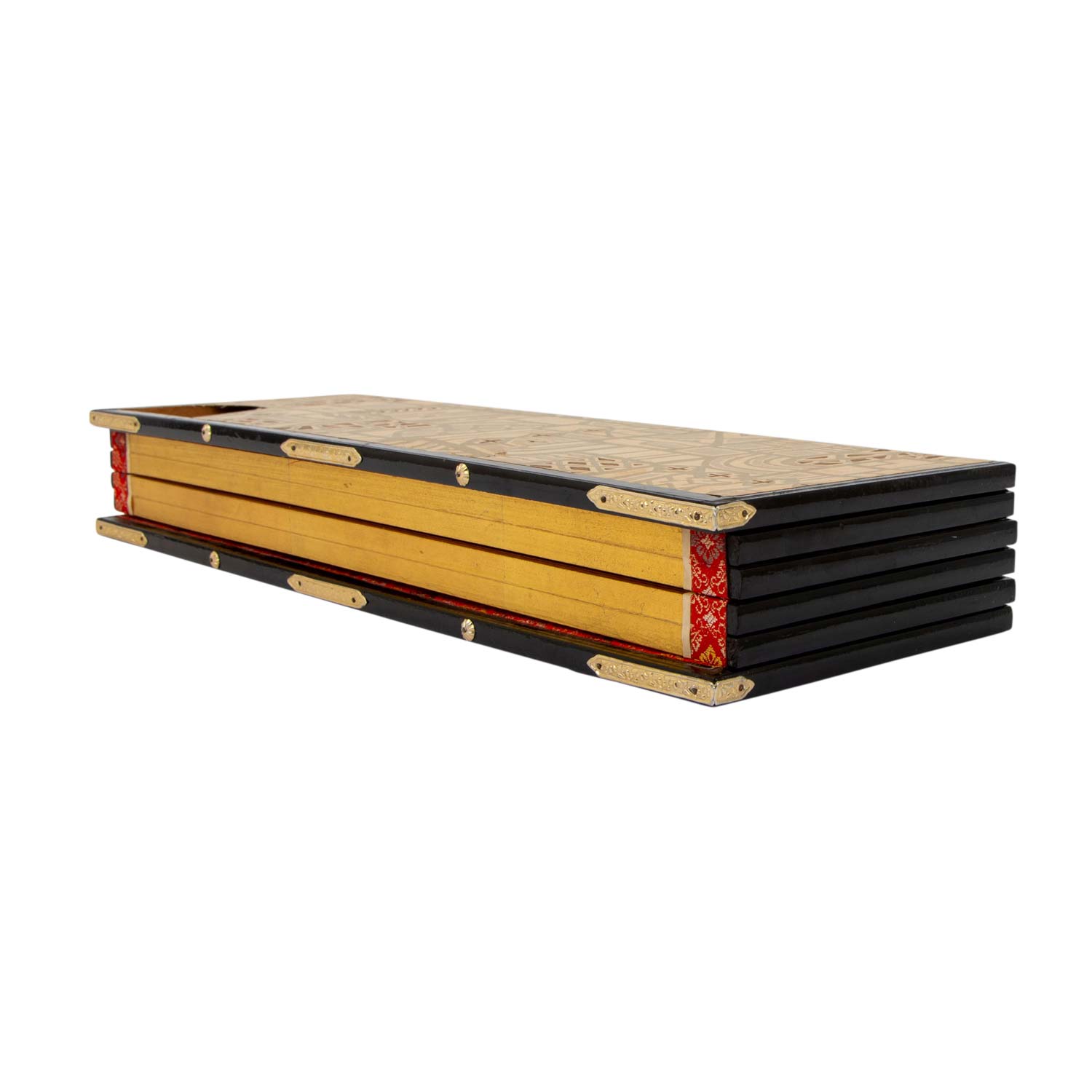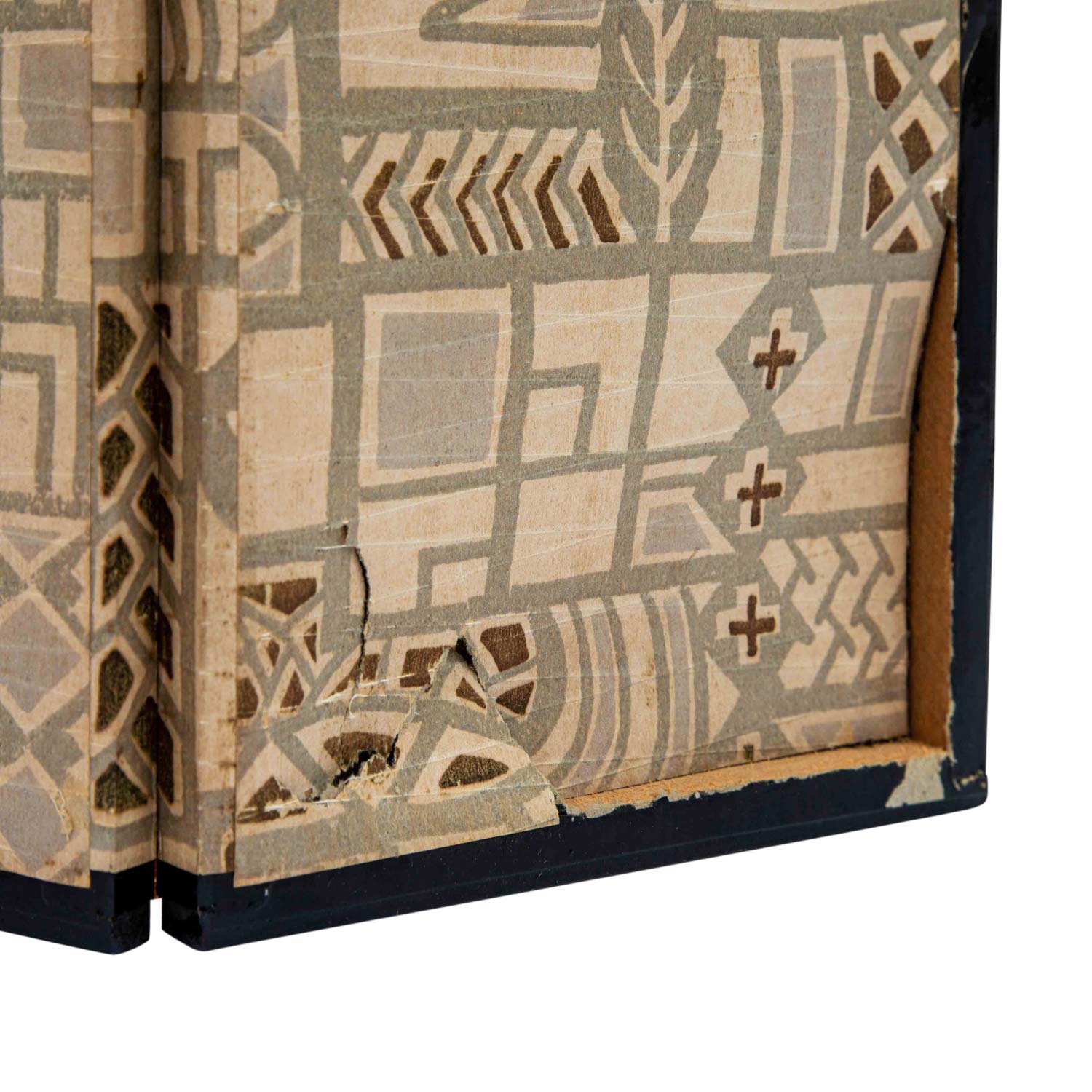 innen uni goldfarben, je Paneel 44,5x14,5 cm, Faltschirm gesamt 44,5x59 cm. Gebrauchsspuren, besch., Papier auf der Rückseite tlw. eingerissen.