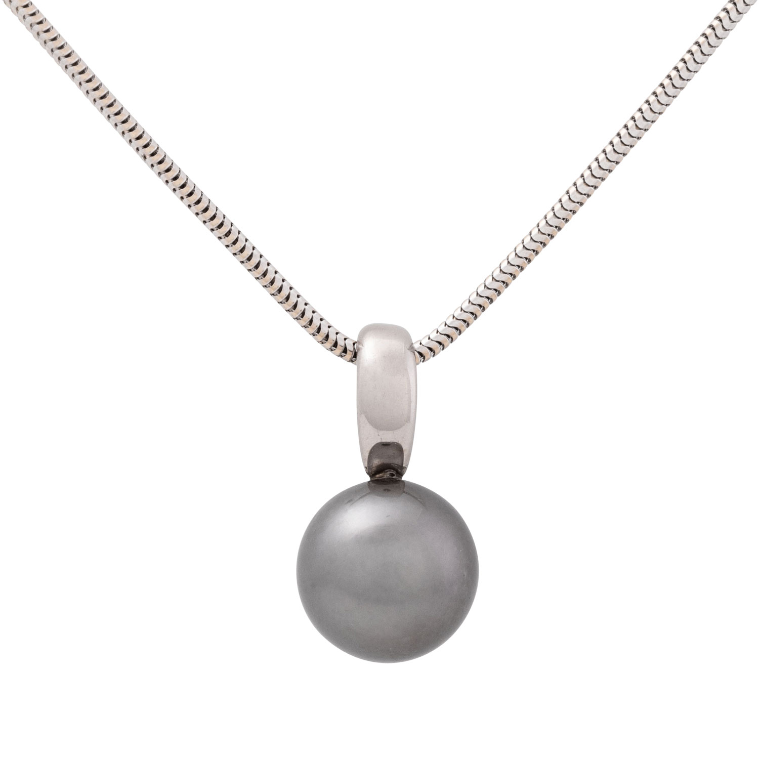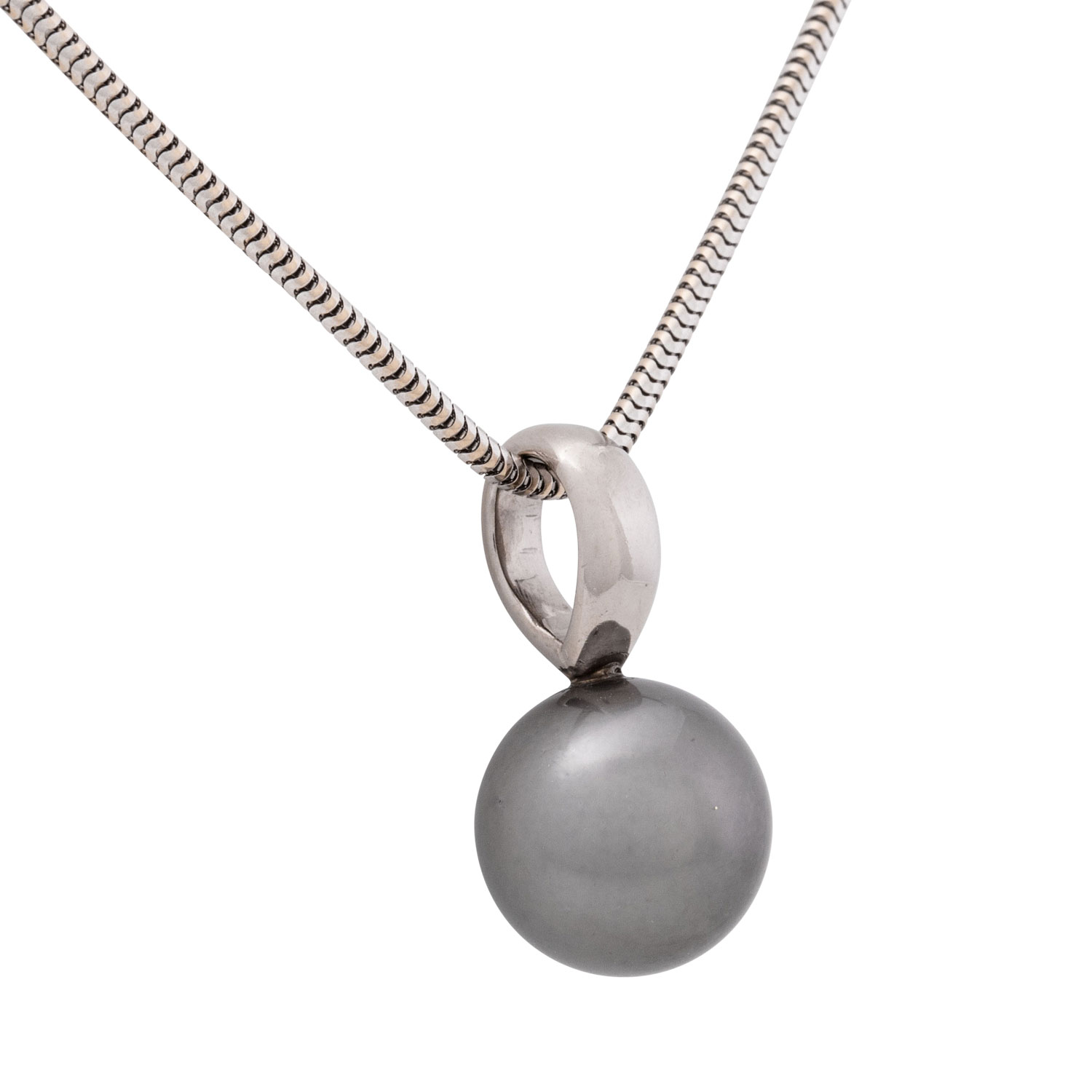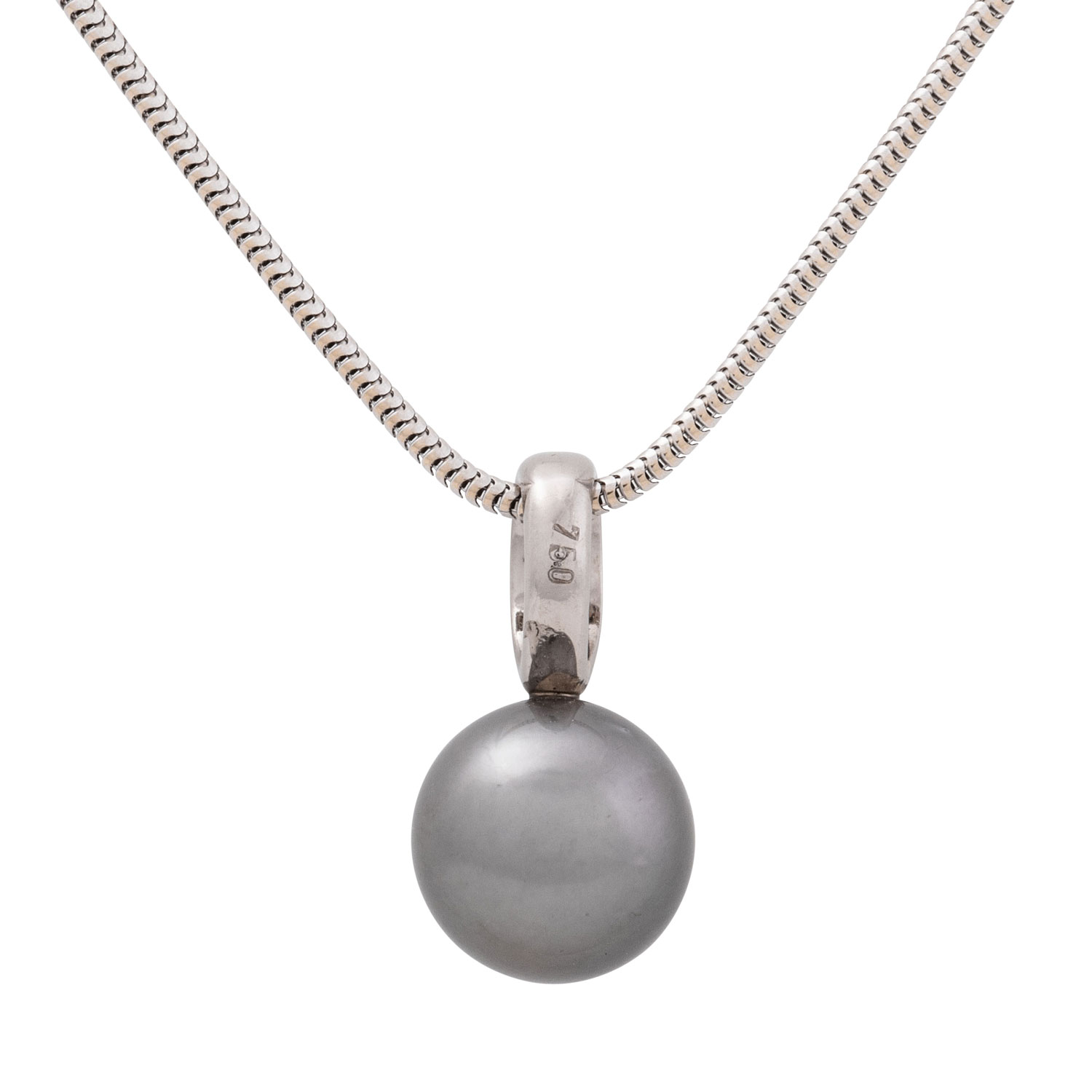 Ring mit Tahitizuchtperle, D: 8,9 mm, WG 14K, 13,8 g, RW: 48, Anhänger mit Tahitizuchtperle D: 10 mm, WG 18K, 2,4 g, an Schlangenkette, WG 14 K, 3,8 g, L: ca. 45 cm, 21. Jh., leichte Tragespuren.