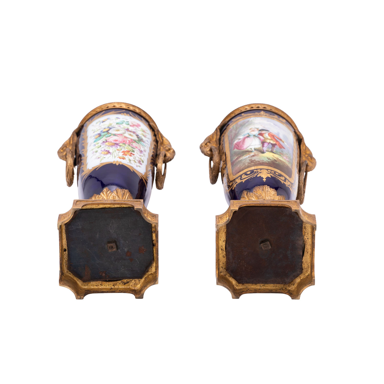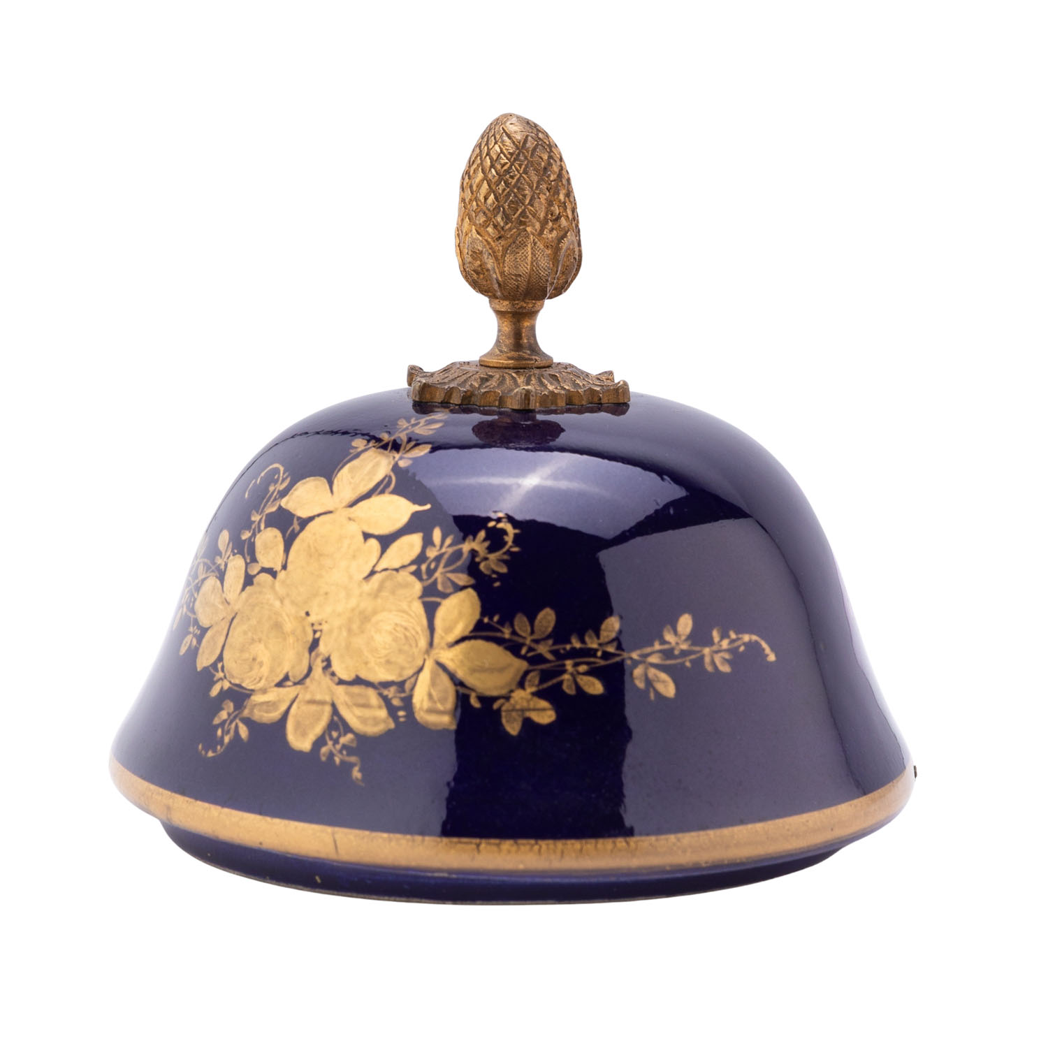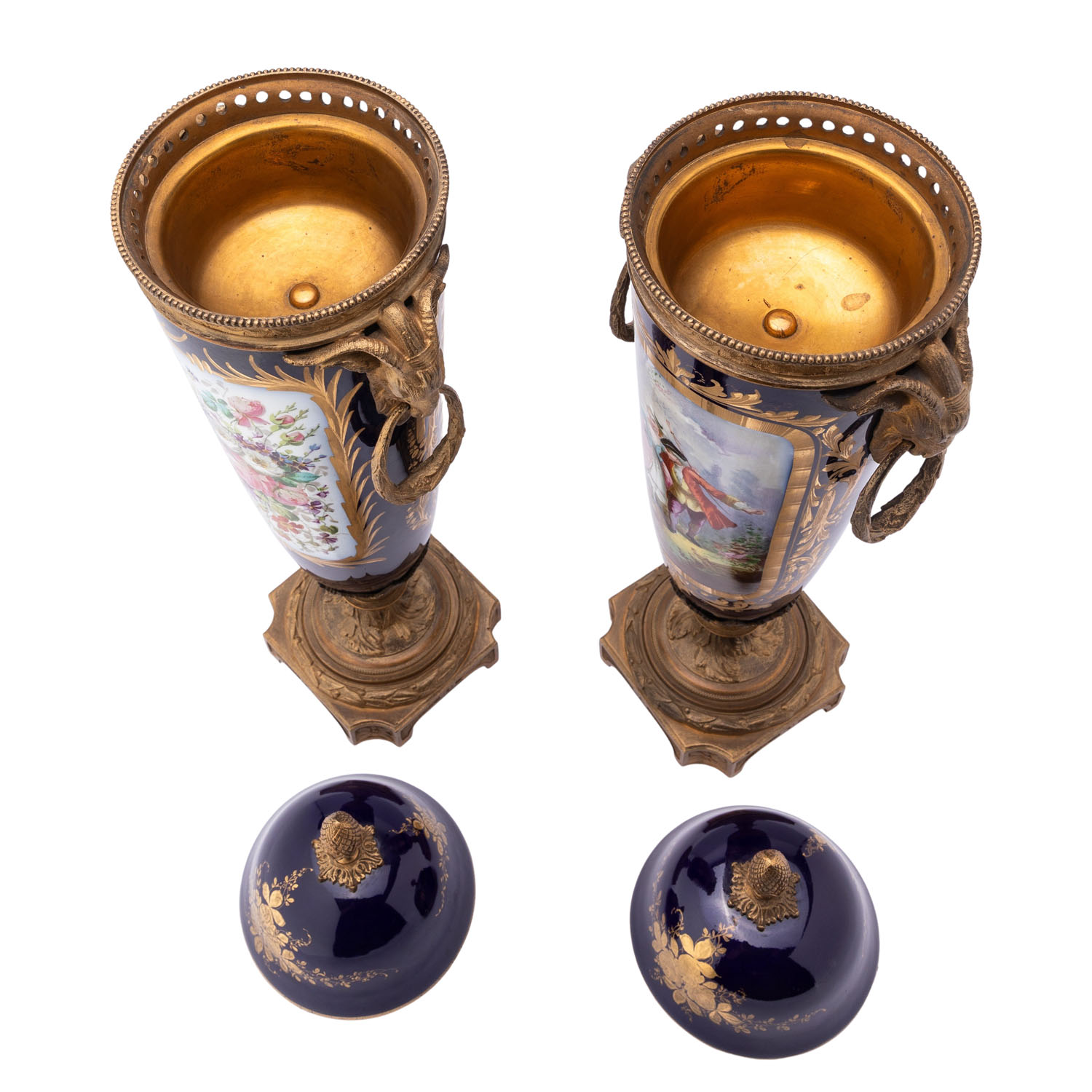 Blaues Kobalt mit Blütenmalerei und galanten Szenen auf der Seite. Messingfüße und Deckel. Minimaler Abrieb. SAMMLERSTÜCKE.