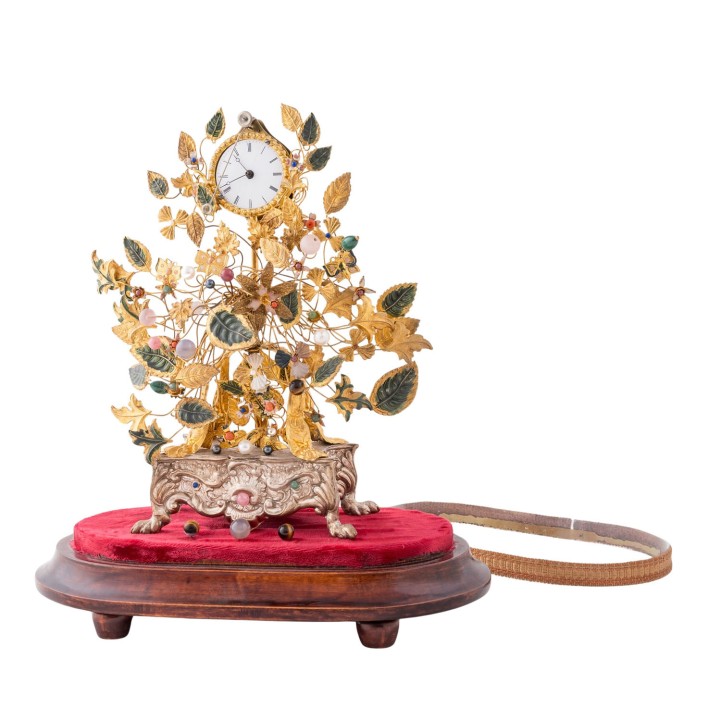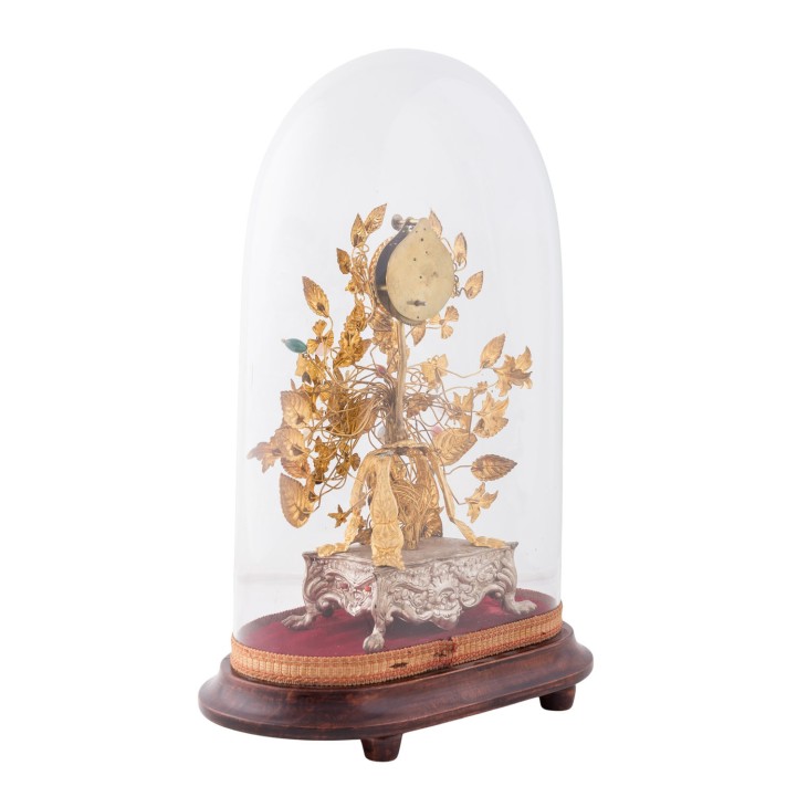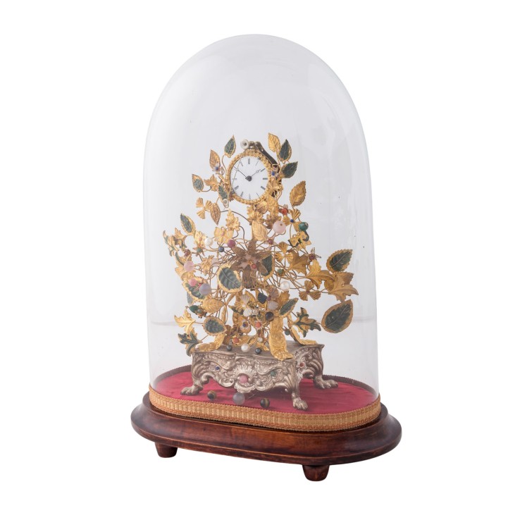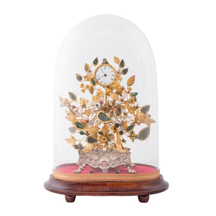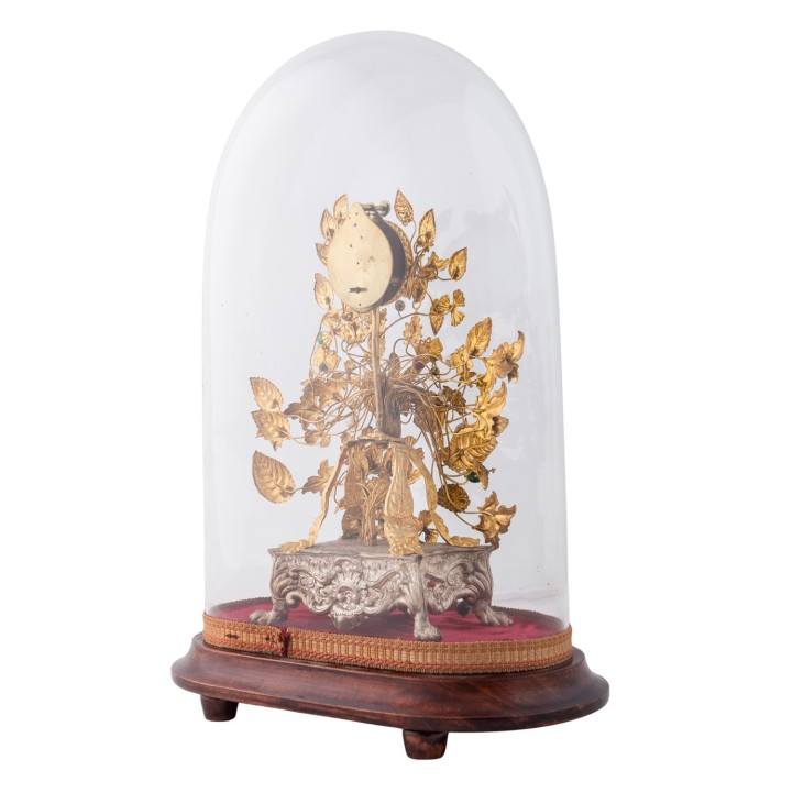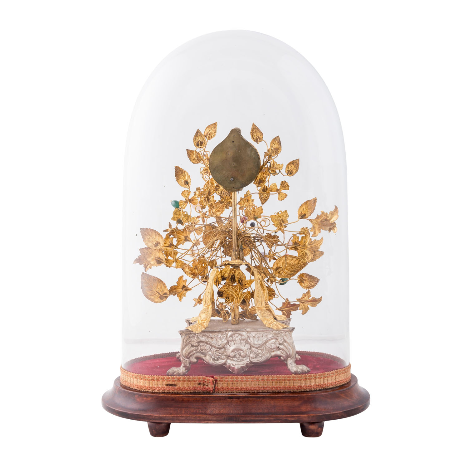 2. Hälfte 19. Jh., handgearbeitete und feuervergoldete Blechornamentik in Form eines Gesteckes variierender Blumen und Pflanzen, vielfältig dekoriert mit Zuchtperlen in Weiß bzw. Schwarz und Nuancen in grau neben geschliffenen Linsen und Kugel von Halbedelsteinen u.a. Tigerauge, Citrin und Lapislazuli, montiert auf einem ovalen Weichholzsockel mit Glasdom. Uhrwerksantrieb über Federzugwerk mit Röllchen Hemmung und vorneliegendem Kurzpendel. H (Uhr): 22 cm. Schöner Erhalt, im Kurztest funktionstüchtig, rückseitig kleine Reparaturstelle an einem Standbein des Gesteckes.