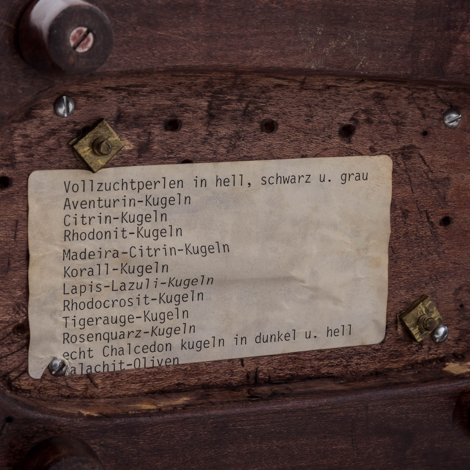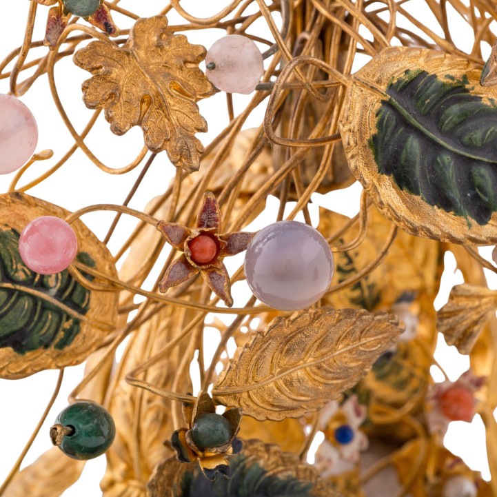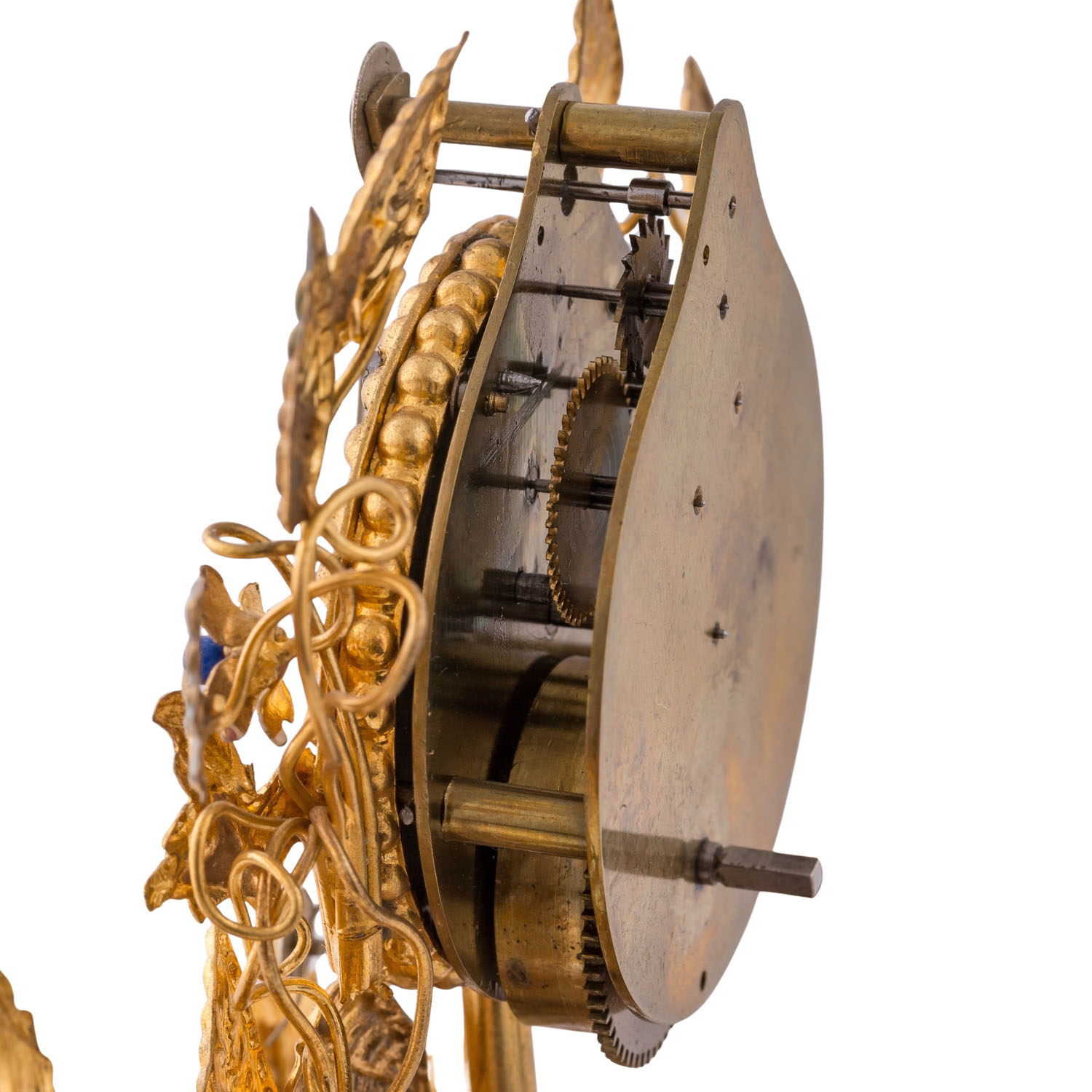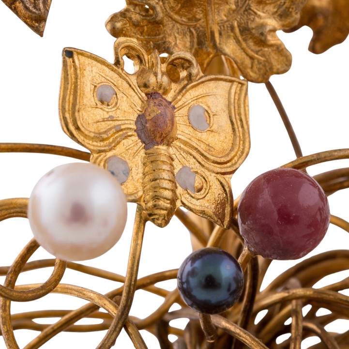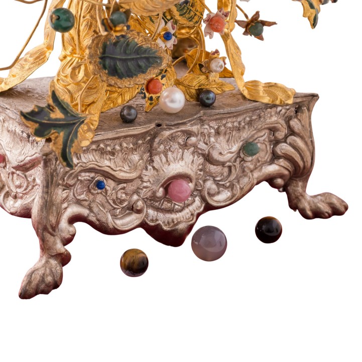 2. Hälfte 19. Jh., handgearbeitete und feuervergoldete Blechornamentik in Form eines Gesteckes variierender Blumen und Pflanzen, vielfältig dekoriert mit Zuchtperlen in Weiß bzw. Schwarz und Nuancen in grau neben geschliffenen Linsen und Kugel von Halbedelsteinen u.a. Tigerauge, Citrin und Lapislazuli, montiert auf einem ovalen Weichholzsockel mit Glasdom. Uhrwerksantrieb über Federzugwerk mit Röllchen Hemmung und vorneliegendem Kurzpendel. H (Uhr): 22 cm. Schöner Erhalt, im Kurztest funktionstüchtig, rückseitig kleine Reparaturstelle an einem Standbein des Gesteckes.