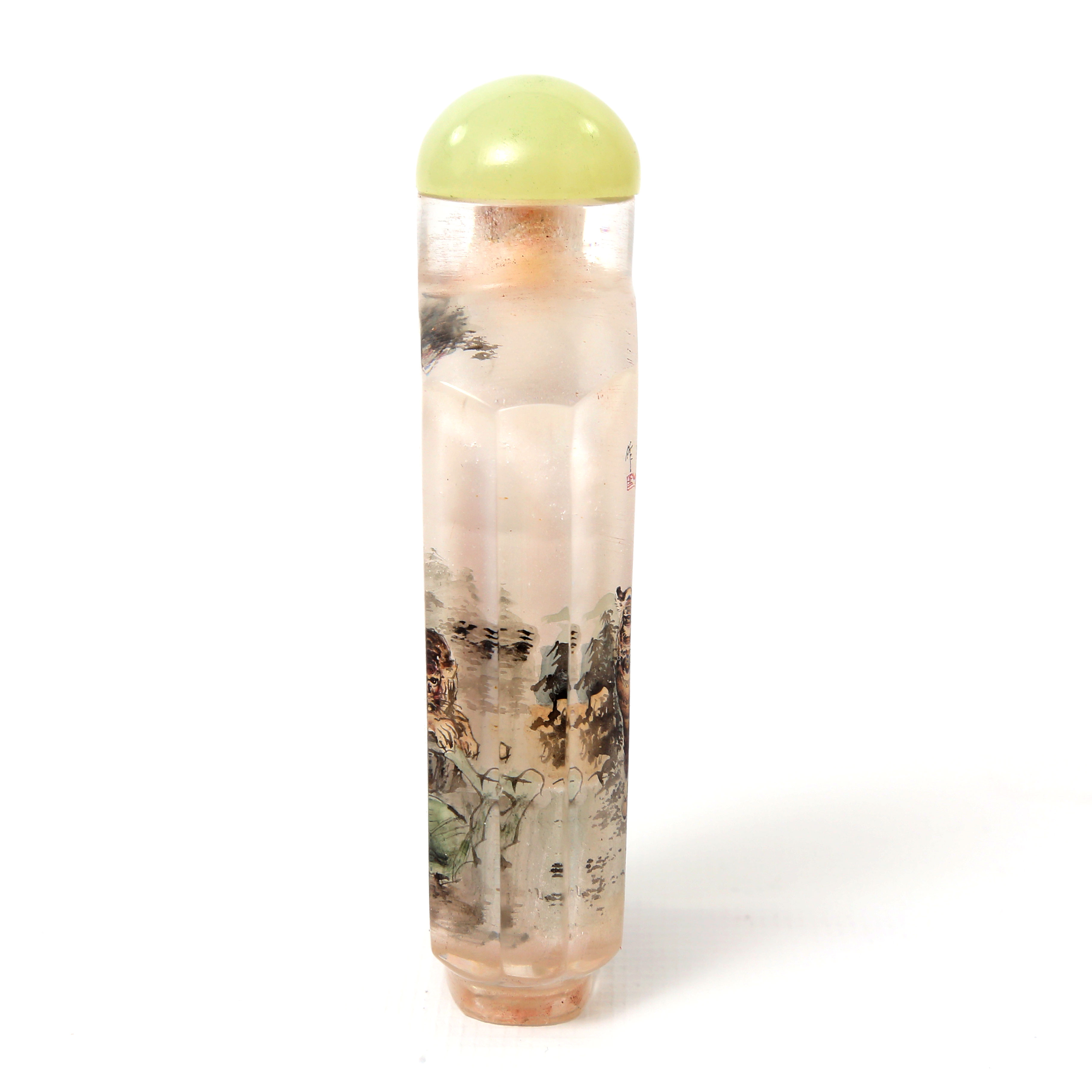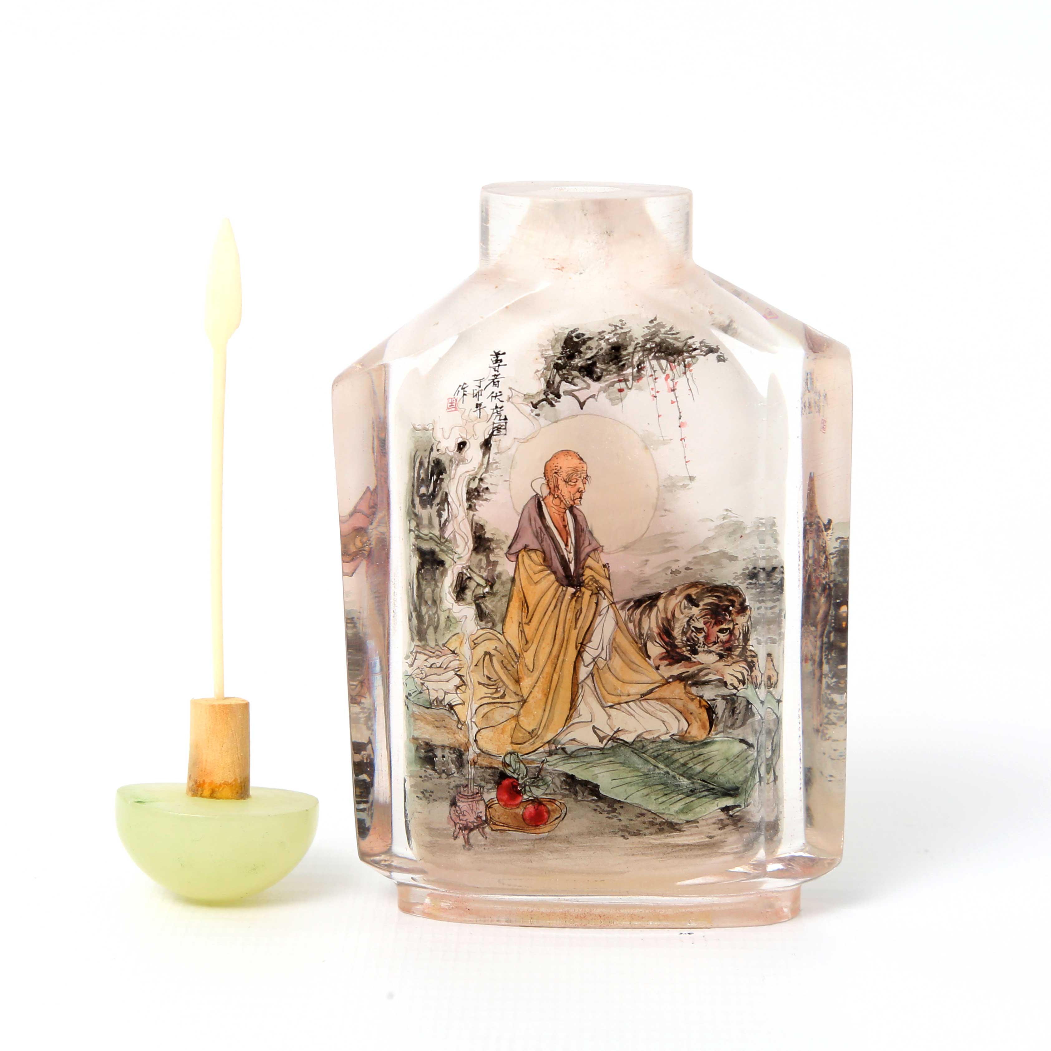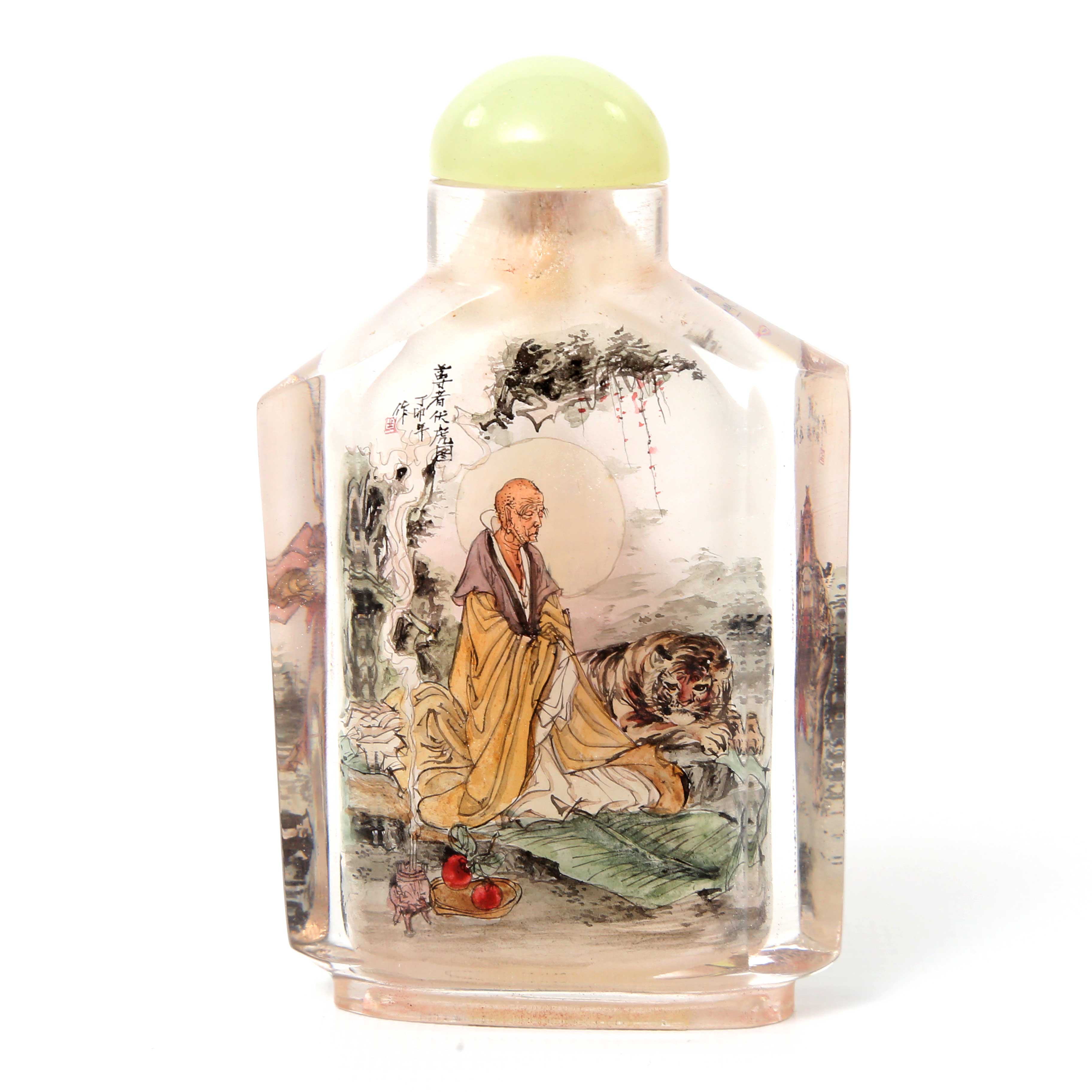 Snuff bottle. CHINA, 20. Jh. mit Hinterglasmalerei zweier Szenen mit Tigern. Der Tiger wird als Symbol für Mut und Tapferkeit verehrt und ist das dritte Tier im Kreiszeichen. Ausserdem steht der Tiger auch für den 4.und 6. Offiziersrang. Sehr schöne Arbeit mit Stöpsel aus grüner Jade, H ca. 9,5 cm