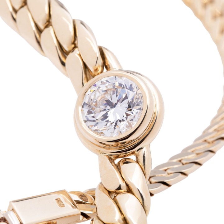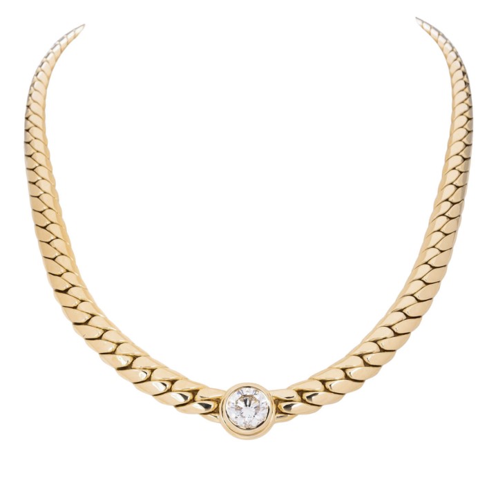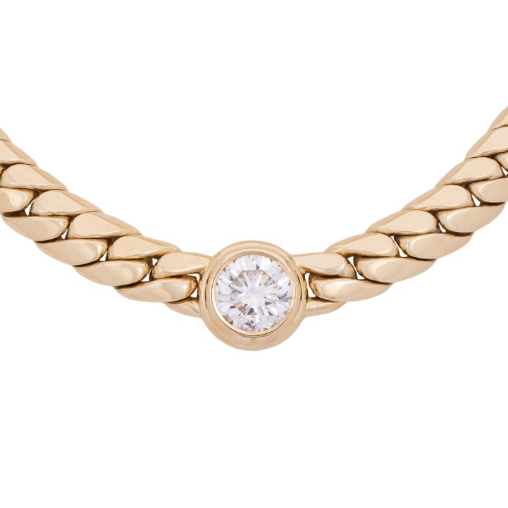 ca. FW-WEISS (G-H)/P1, WBW (2025): ca. 70.000 €, eingearbeitet in halbrundes Panzercollier im Größenverlauf aus GG 18K, 109,6 g, L: 43 cm, Ende 20. Jh., sehr guter Erhalt.