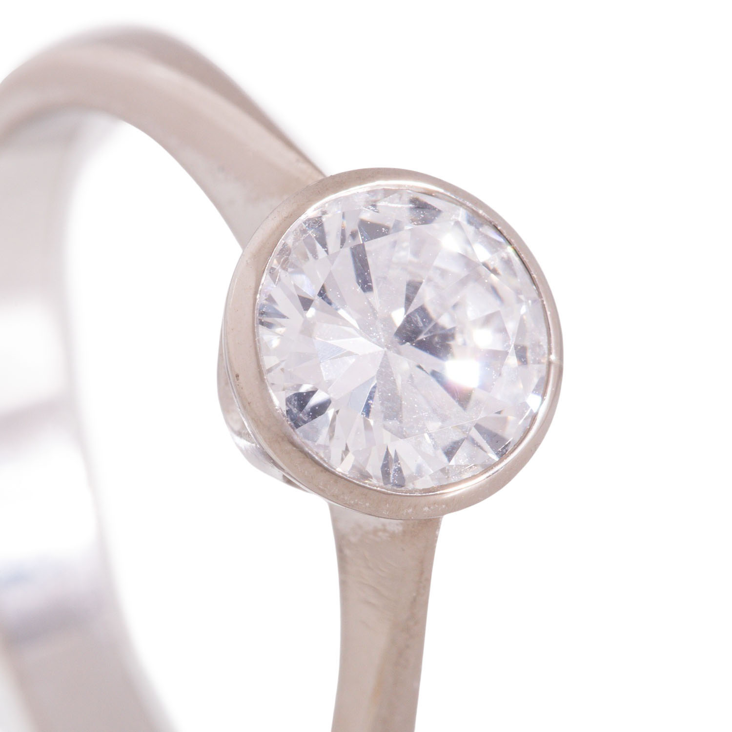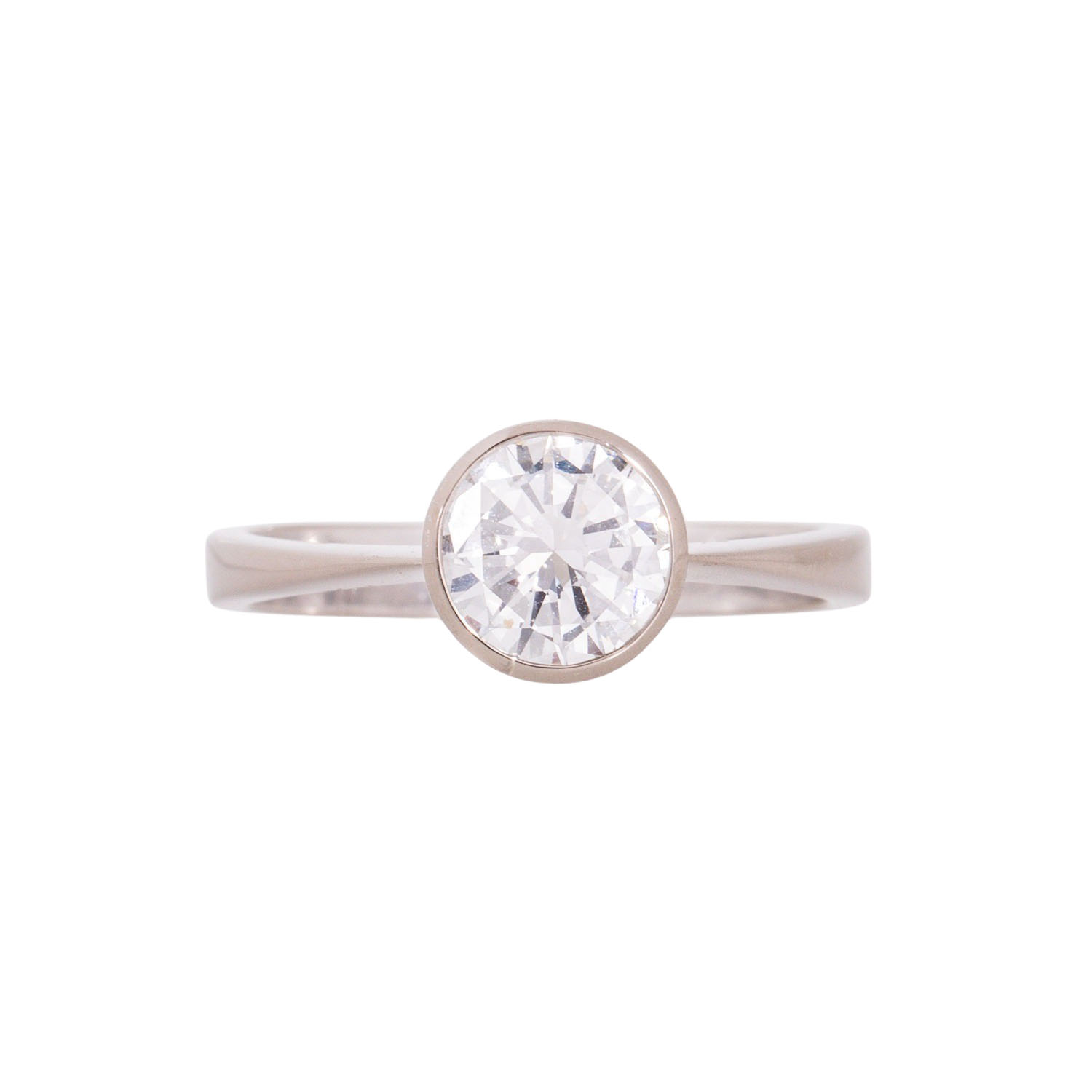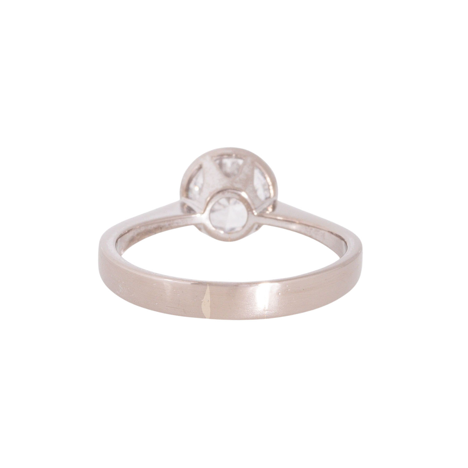 ca. FW (F- G)/ VVS, starke Fluoreszenz. WG 18K, 4,5g, RW: 61, Ende 20. Jh., leichte Tragespuren, Ringschiene Lötfuge innen sichtbar. Mit GfD Expertise (1995) anbei.