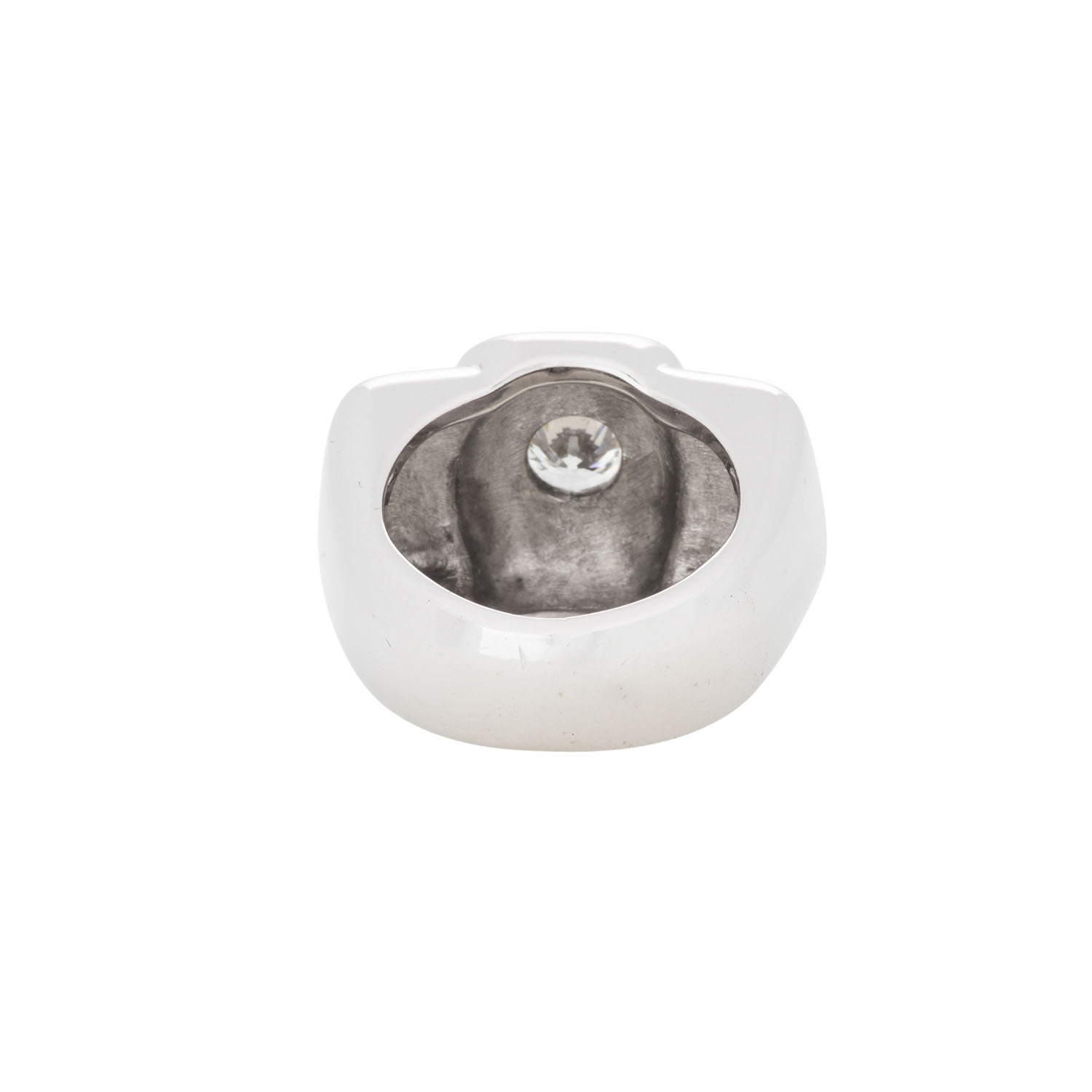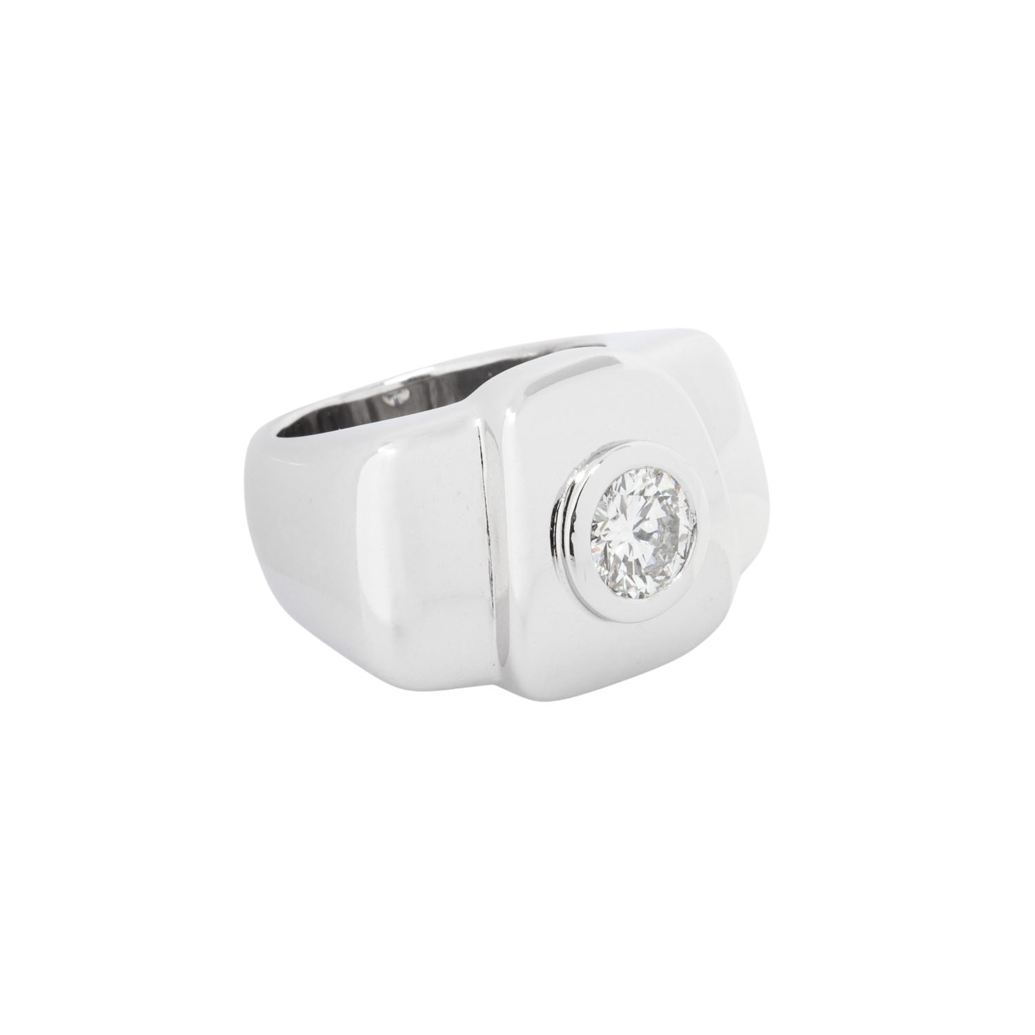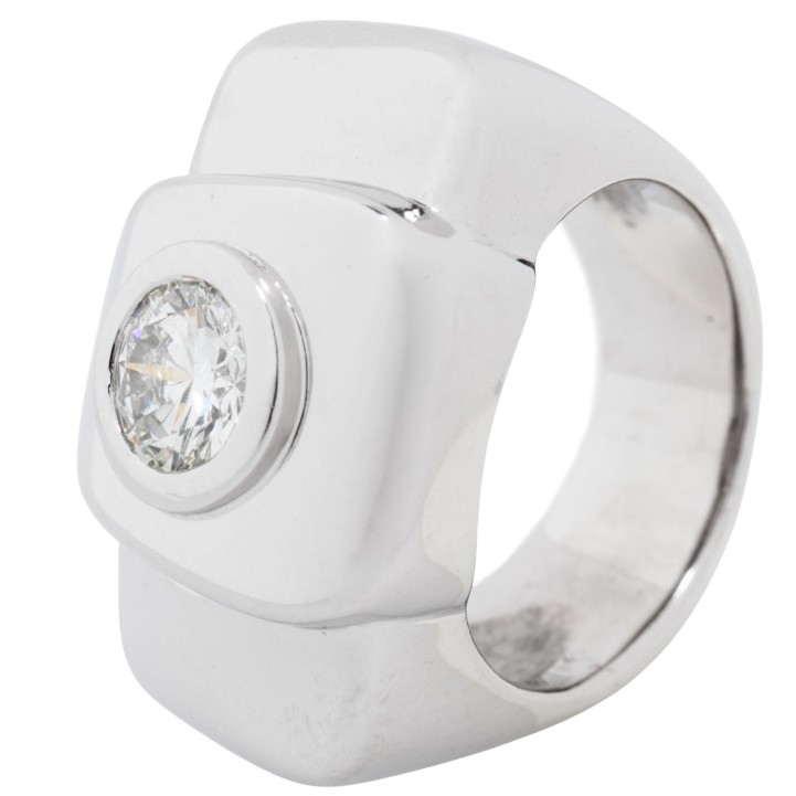 ca. 1,2 ct, ca. FW (G)/SI1, WG 18K, 35,6 g, RW: 56, Ringkopf ca. 26 x 17 mm, Ende 20. Jh., leichte Tragespuren, äußerst solide Verarbeitung.