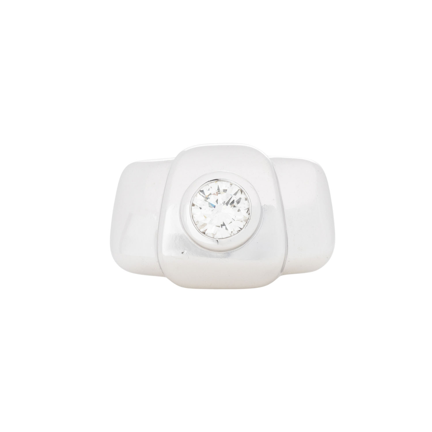 ca. 1,2 ct, ca. FW (G)/SI1, WG 18K, 35,6 g, RW: 56, Ringkopf ca. 26 x 17 mm, Ende 20. Jh., leichte Tragespuren, äußerst solide Verarbeitung.