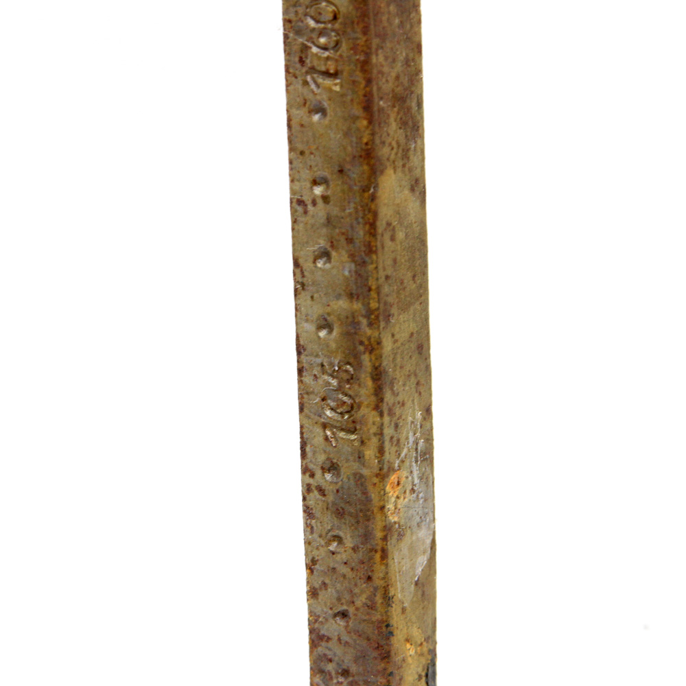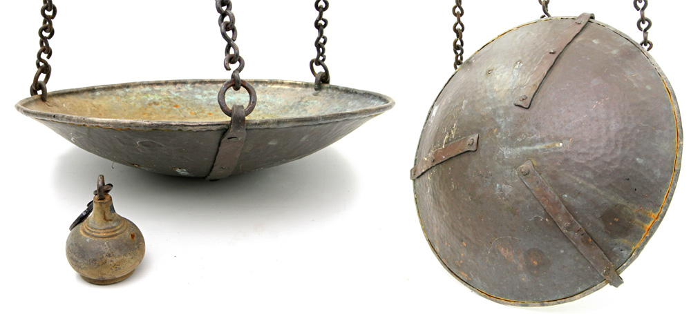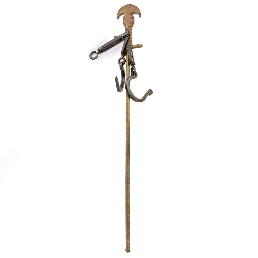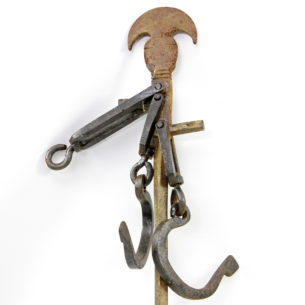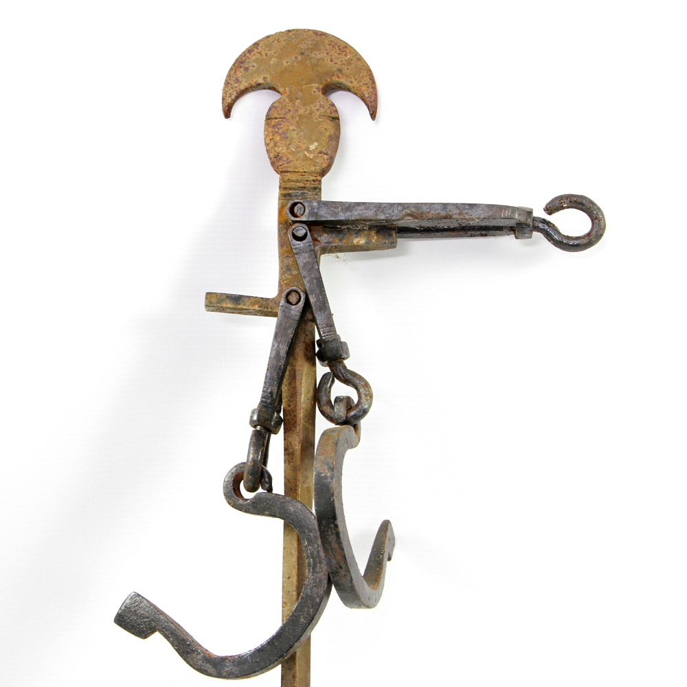 STANGENWAAGE 18./19.Jh., Eisen und Messing, sog. "Römische Waage" mit Skalierung, Haken und Gewicht, Waagschale mit dreiteiliger Kette, Altersspuren.