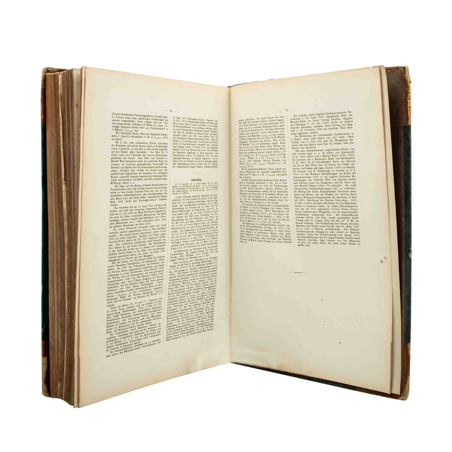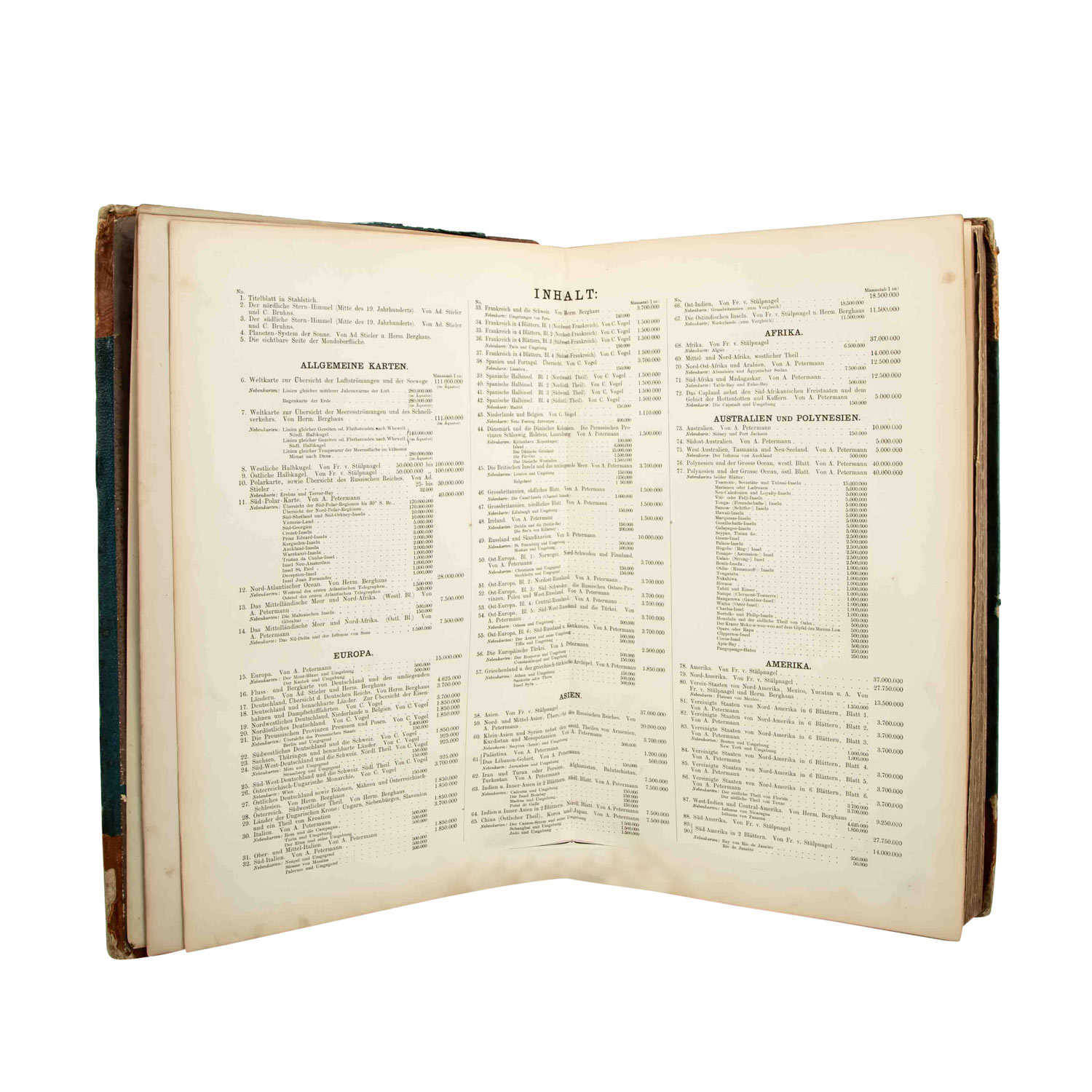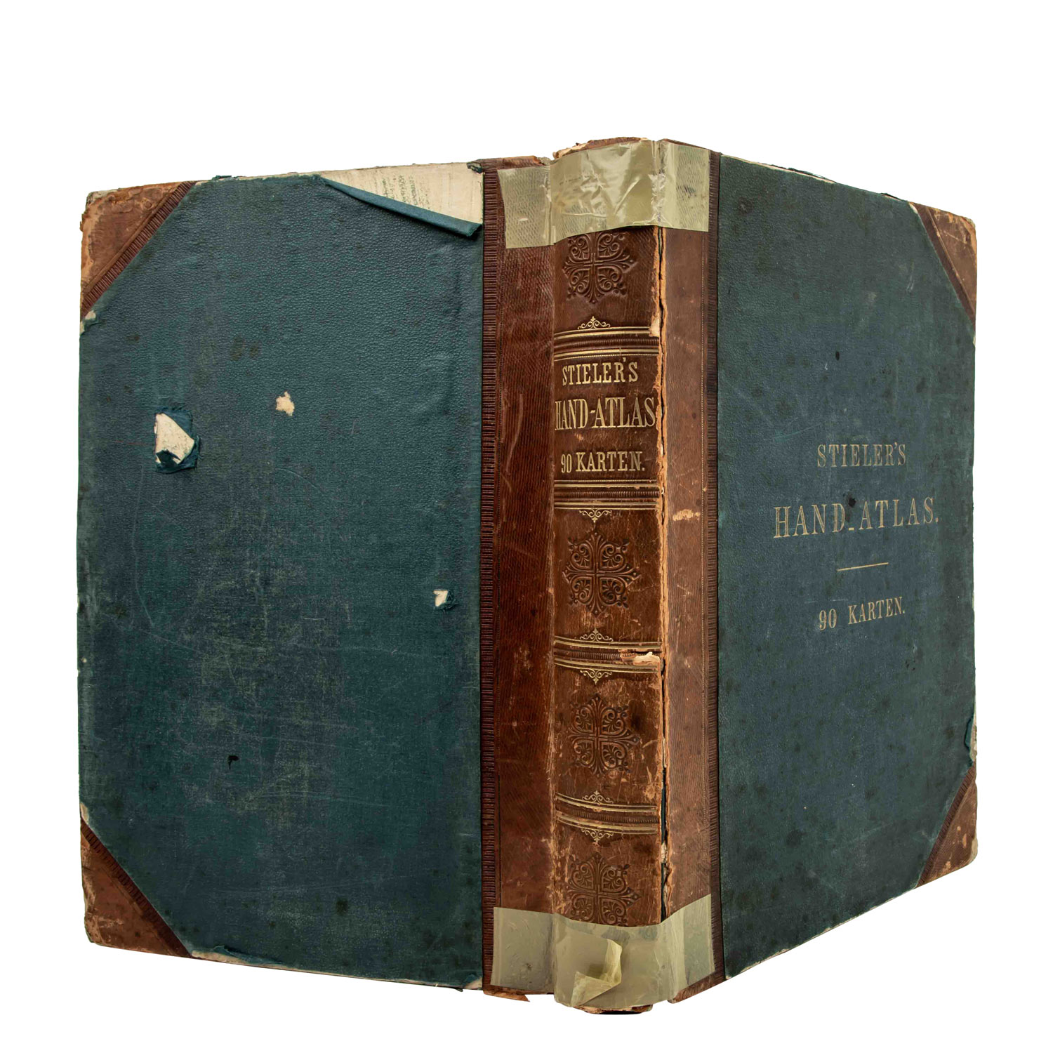 90 Karten', herausgegeben von Adolf Stieler, Gotha 1869, Verlag Justus Perthes, starke Beschädigungen an Buchrücken und Seiten, Risse, Flecken, tlw. geklebt, mit Alters - und Gebrauchsspuren.