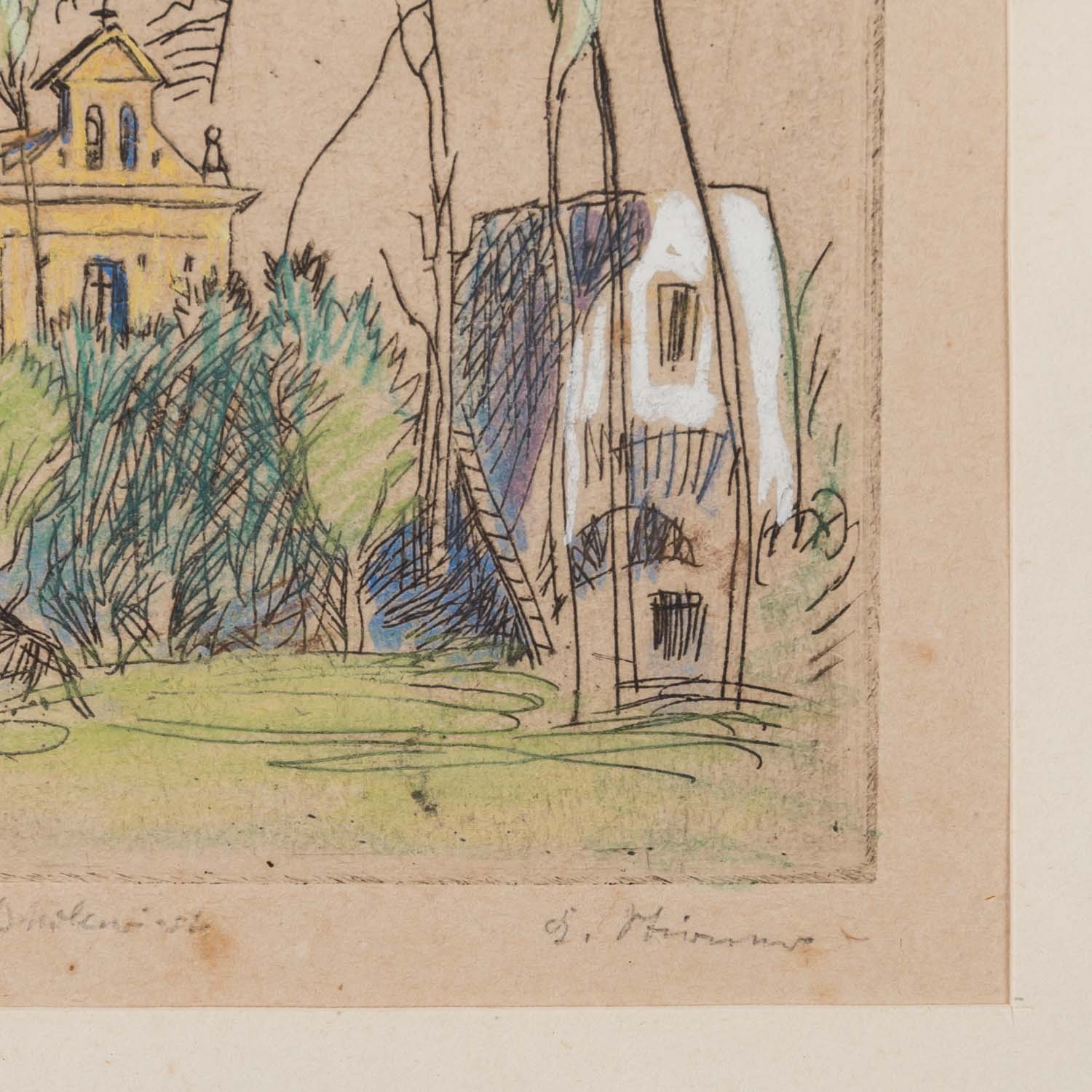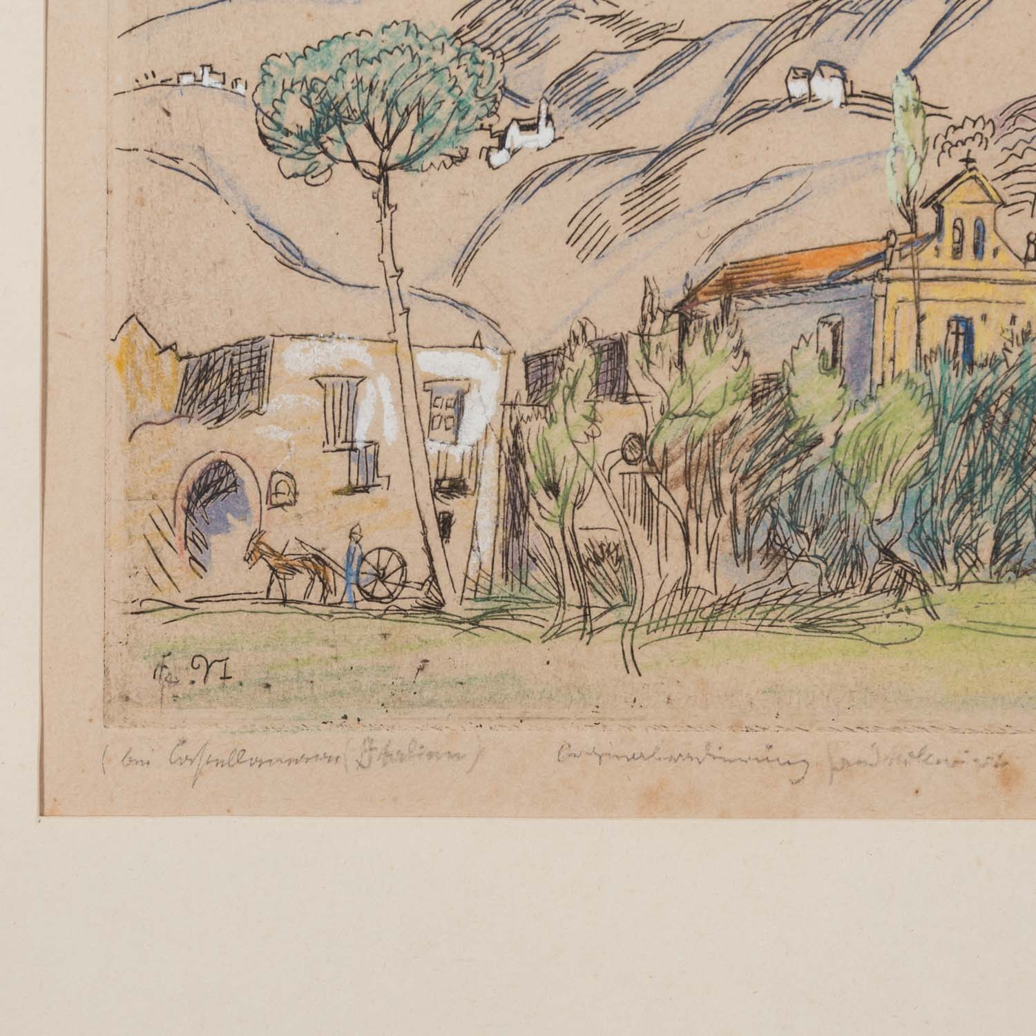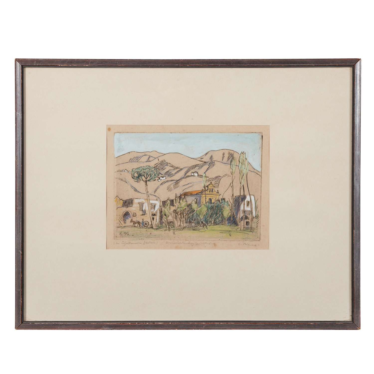 handkolorierte Radierung auf Papier, im Druck monogrammiert, mit Bleistift teils unleserlich bezeichnet und signiert, HxB Platte: ca. 12,7 x 17 cm, HxB Sichtmaß Passepartoutausschnitt ca. 14,5 x 19 cm (HxB Rahmen: ca. 31,5 x 40 cm). Altersspuren, fleckig und gebräunt. Hinter Passepartout montiert, mit verglastem Rahmen (Altersspuren).